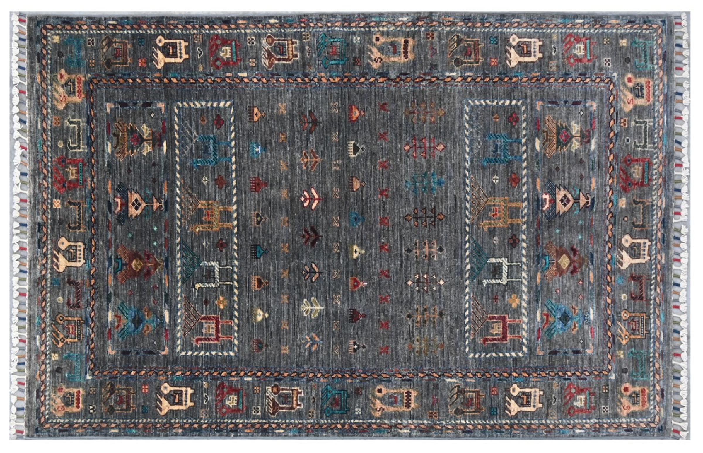 Tappeto-N.: 31019000778581 Dimensione: 158x99 cm Spessore: circa . 5 mm Nodi: 144 000 - 180 000 / m² Lavorazione: Annodato a mano Fondo: Lana filata a mano Catena: Cotone Origine: Pakistan Età: Nuovo Peso: circa . 5 kg Disponibile: Unico - Solo 1 disponibili