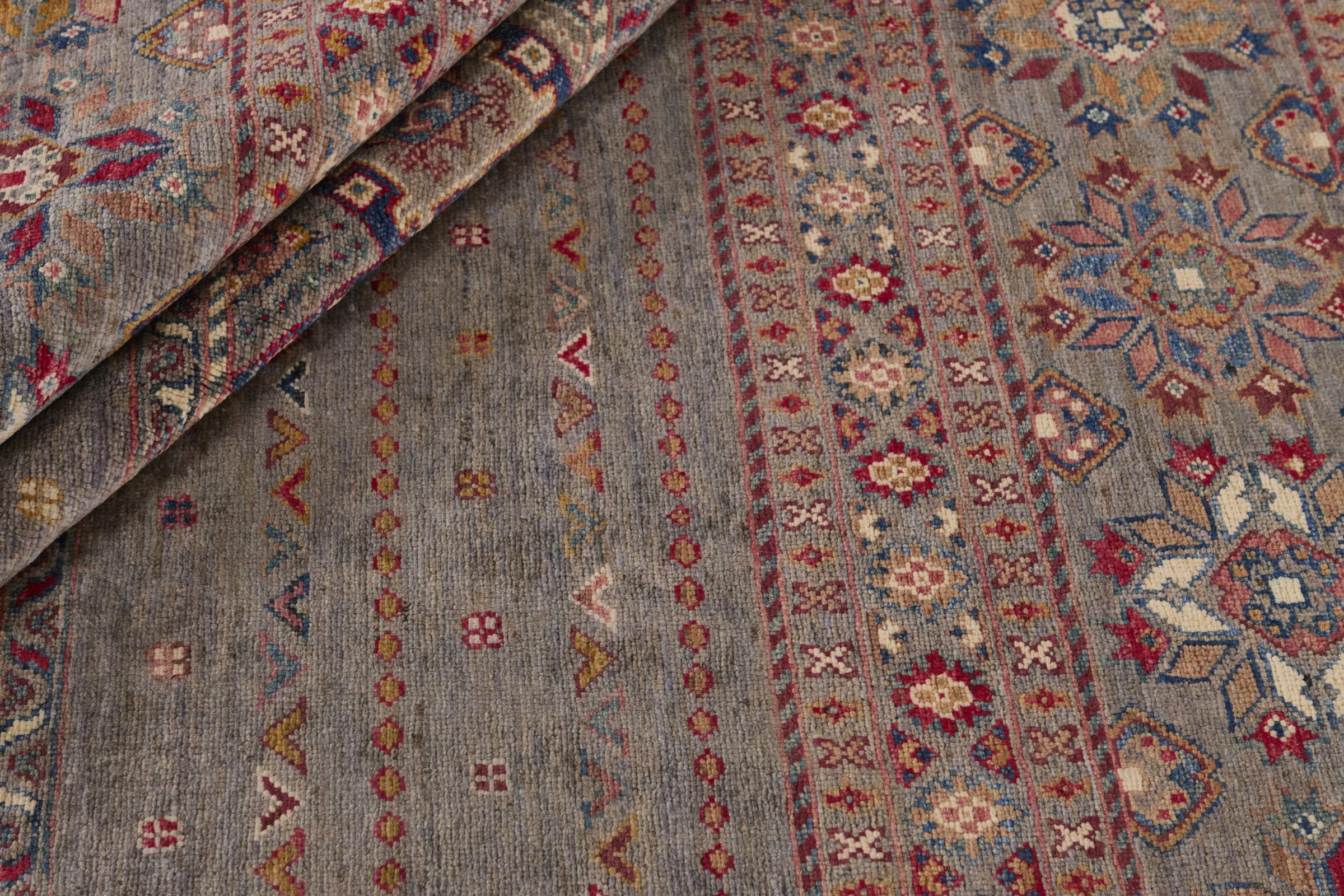 Questo tappeto è realizzato in lana di pecora filata a mano di altissima qualità. Soprattutto in Iran (ex Persia), Afghanistan e Pakistan la lana viene ancora filata a mano prima che inizi l'annodatura vera e propria del tappeto. La lana si è dimostrata nei secoli un materiale naturale ed estremamente resistente. Tra le altre cose, ha proprietà di repellenza allo sporco e di isolamento termico. Allo stesso tempo, la lana è incomparabilmente morbida e ha una lucentezza naturale.