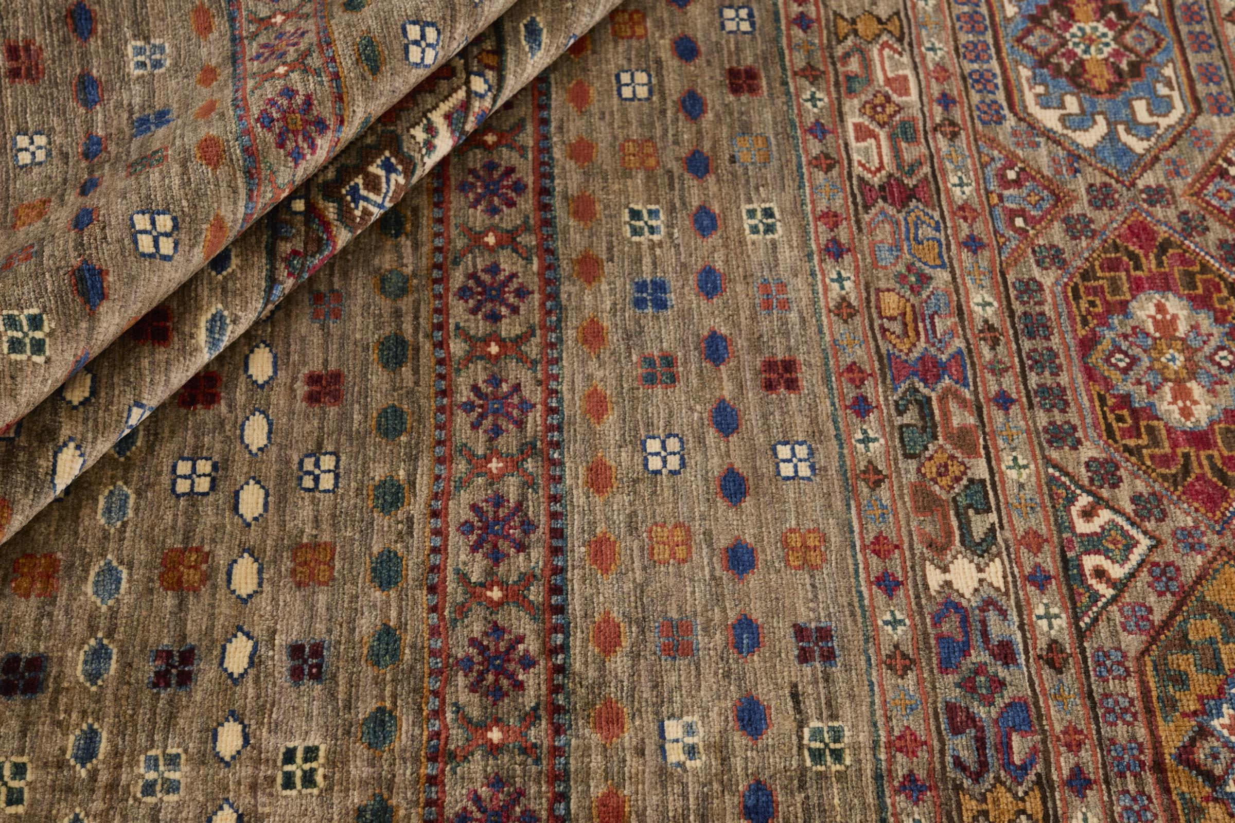 Questo tappeto è realizzato in lana di pecora filata a mano di altissima qualità. Soprattutto in Iran (ex Persia), Afghanistan e Pakistan la lana viene ancora filata a mano prima che inizi l'annodatura vera e propria del tappeto. La lana si è dimostrata nei secoli un materiale naturale ed estremamente resistente. Tra le altre cose, ha proprietà di repellenza allo sporco e di isolamento termico. Allo stesso tempo, la lana è incomparabilmente morbida e ha una lucentezza naturale.