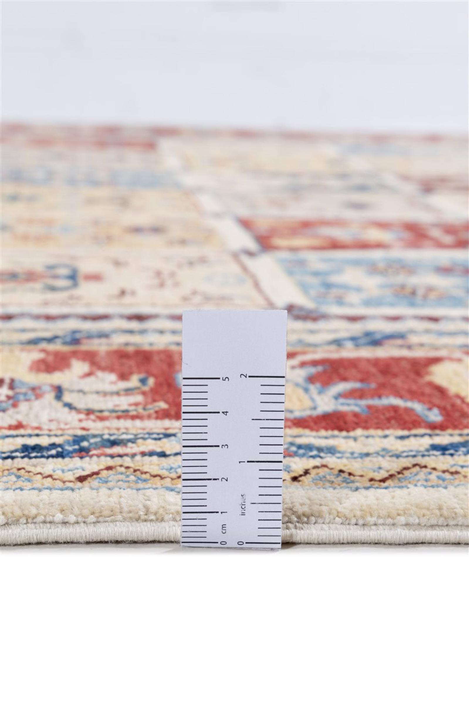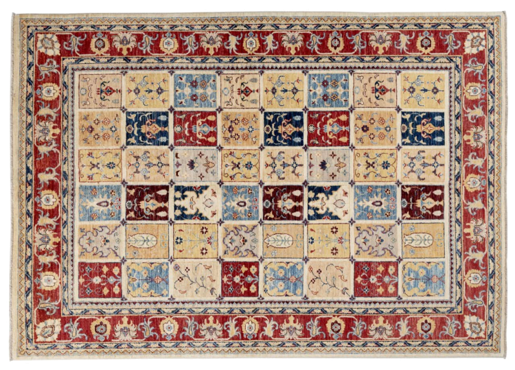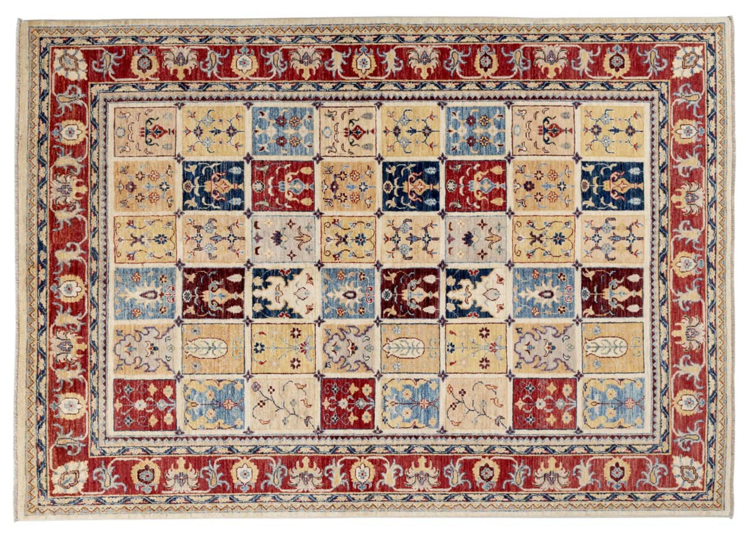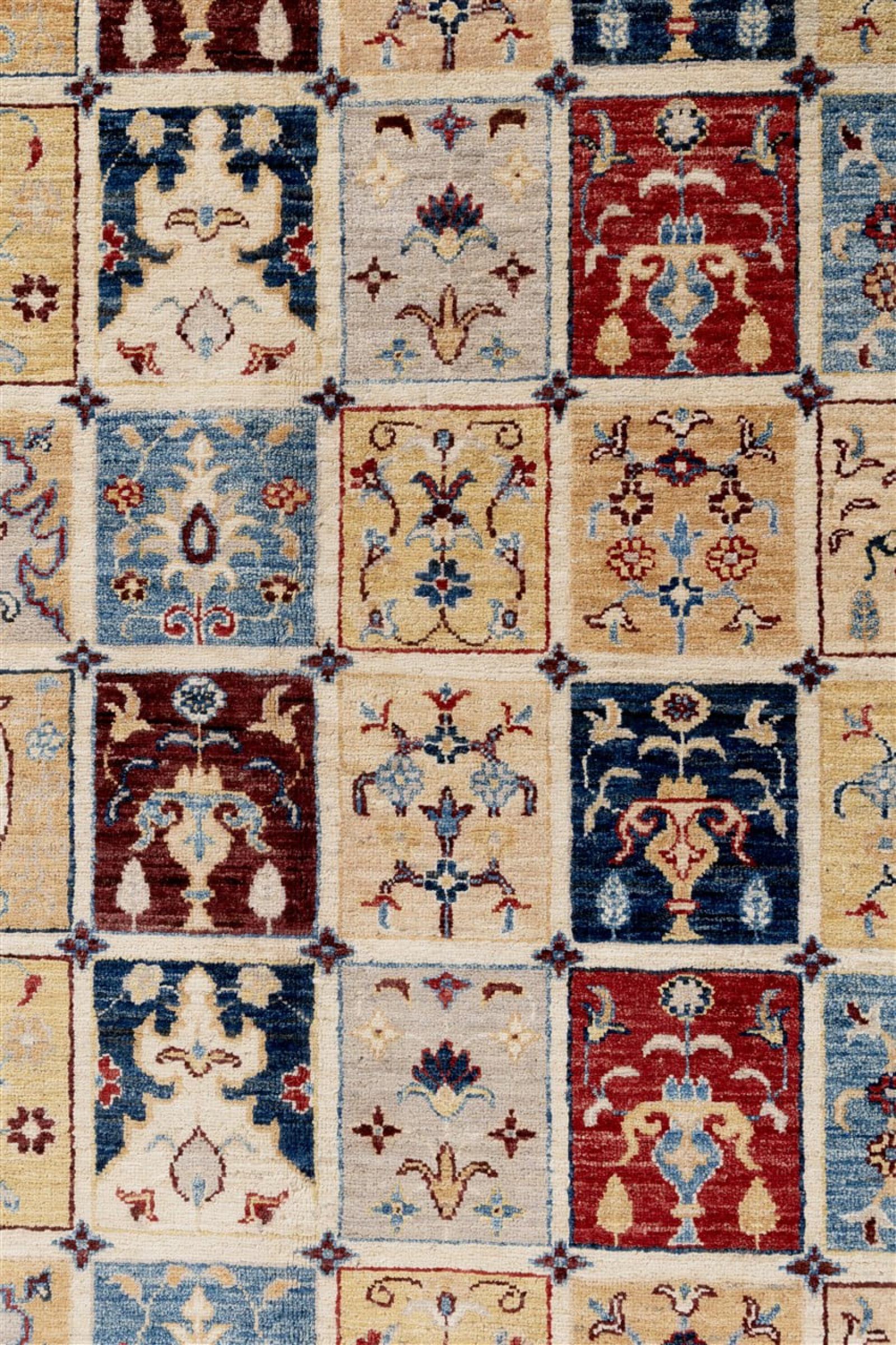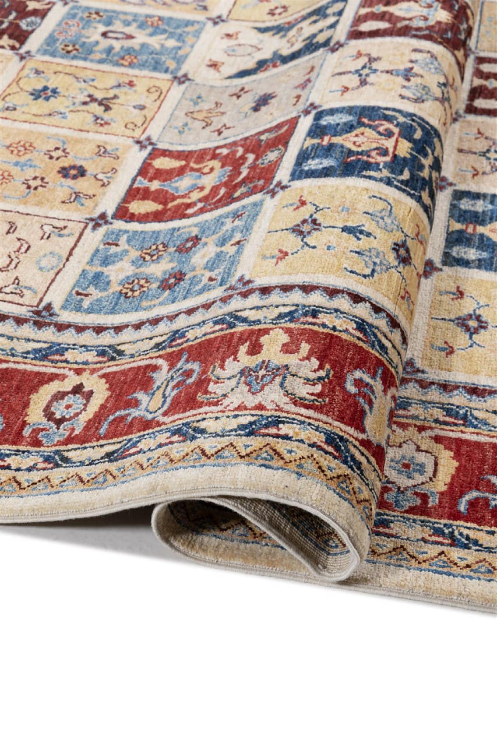 Questo tappeto è realizzato in lana di pecora filata a mano di altissima qualità. Soprattutto in Iran (ex Persia), Afghanistan e Pakistan la lana viene ancora filata a mano prima che inizi l'annodatura vera e propria del tappeto. La lana si è dimostrata nei secoli un materiale naturale ed estremamente resistente. Tra le altre cose, ha proprietà di repellenza allo sporco e di isolamento termico. Allo stesso tempo, la lana è incomparabilmente morbida e ha una lucentezza naturale.