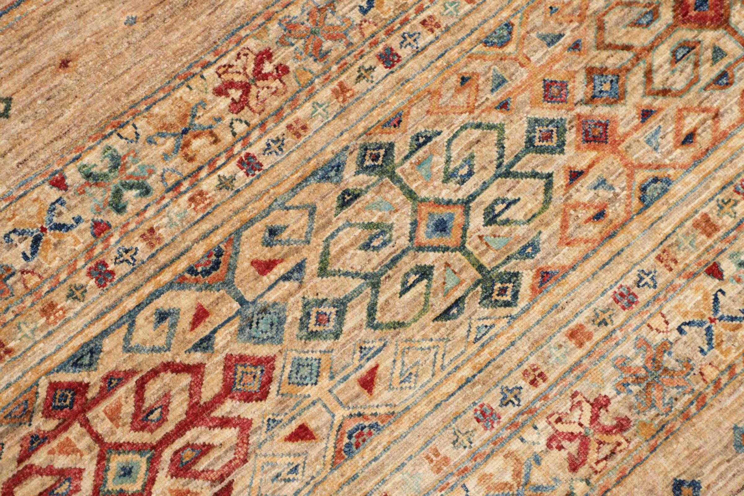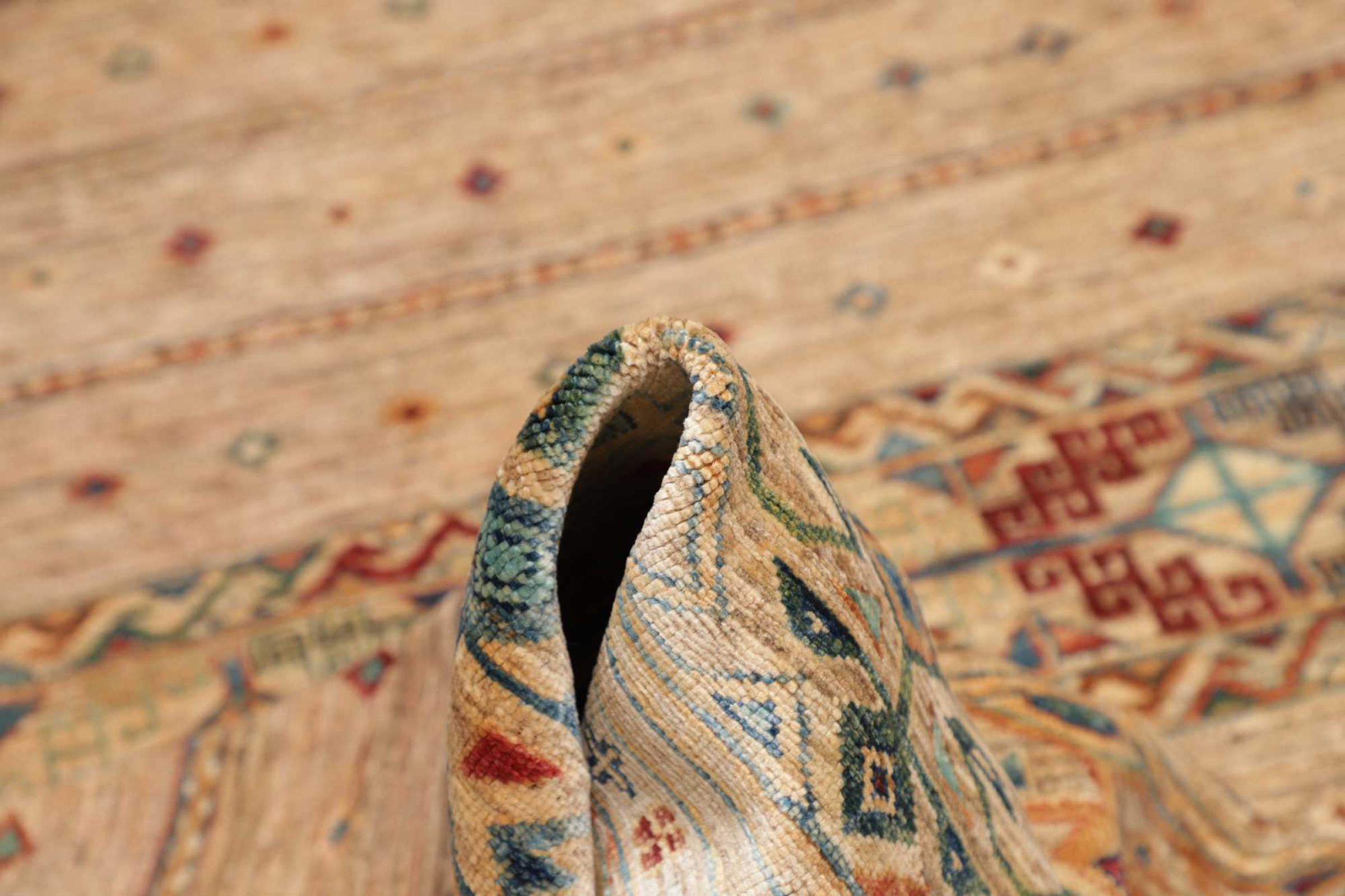 Questo tappeto è realizzato in lana di pecora filata a mano di altissima qualità. Soprattutto in Iran (ex Persia), Afghanistan e Pakistan la lana viene ancora filata a mano prima che inizi l'annodatura vera e propria del tappeto. La lana si è dimostrata nei secoli un materiale naturale ed estremamente resistente. Tra le altre cose, ha proprietà di repellenza allo sporco e di isolamento termico. Allo stesso tempo, la lana è incomparabilmente morbida e ha una lucentezza naturale.