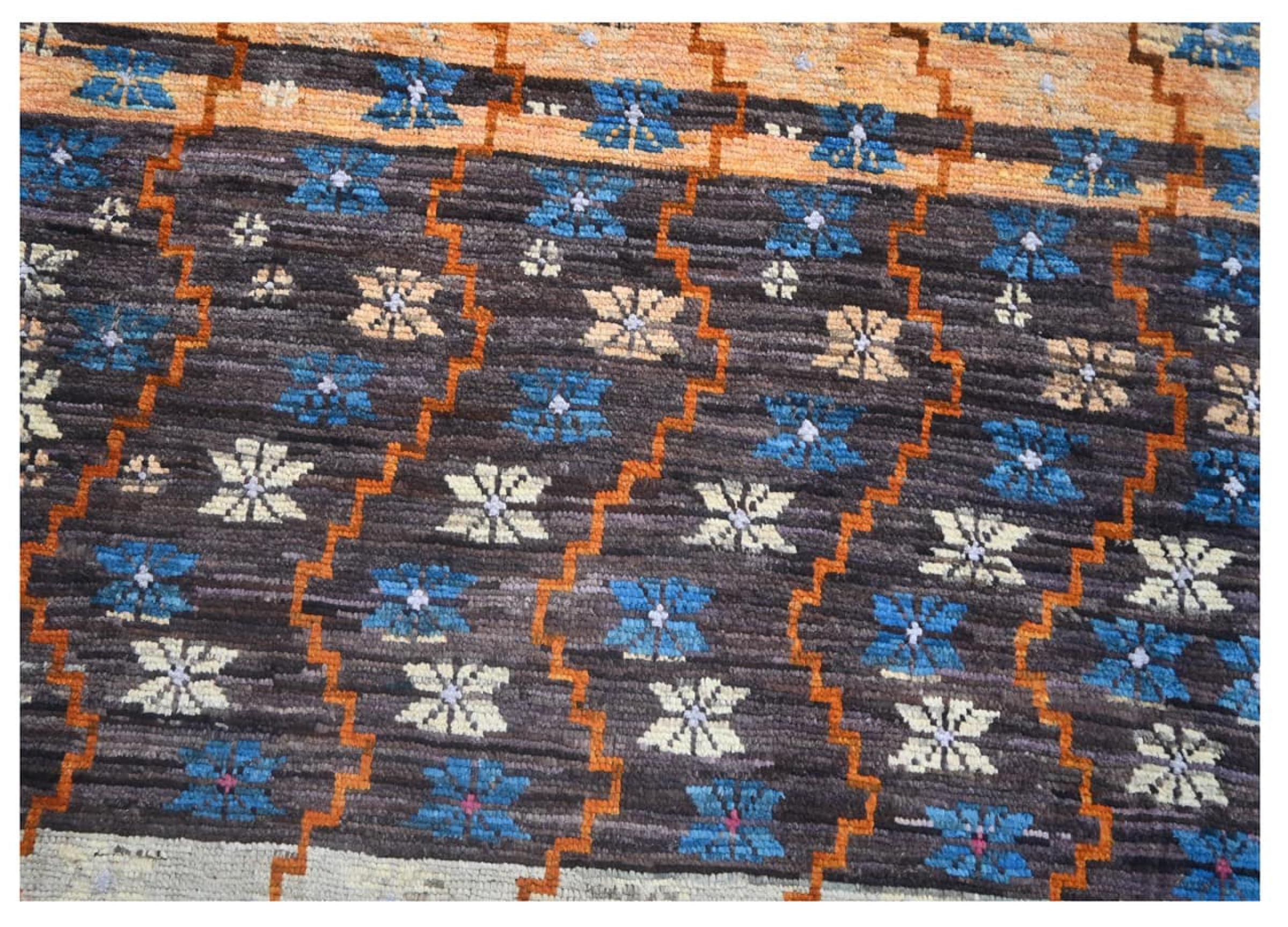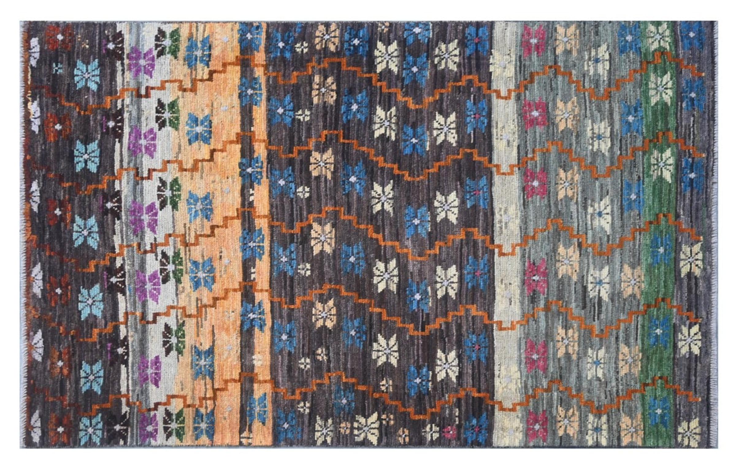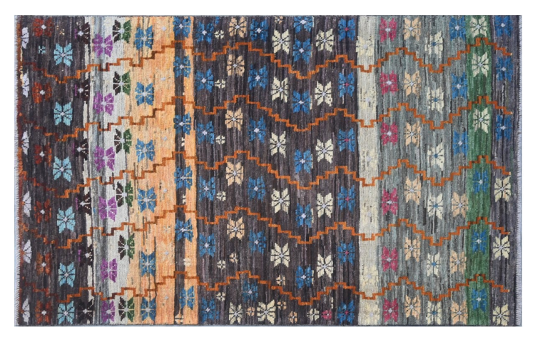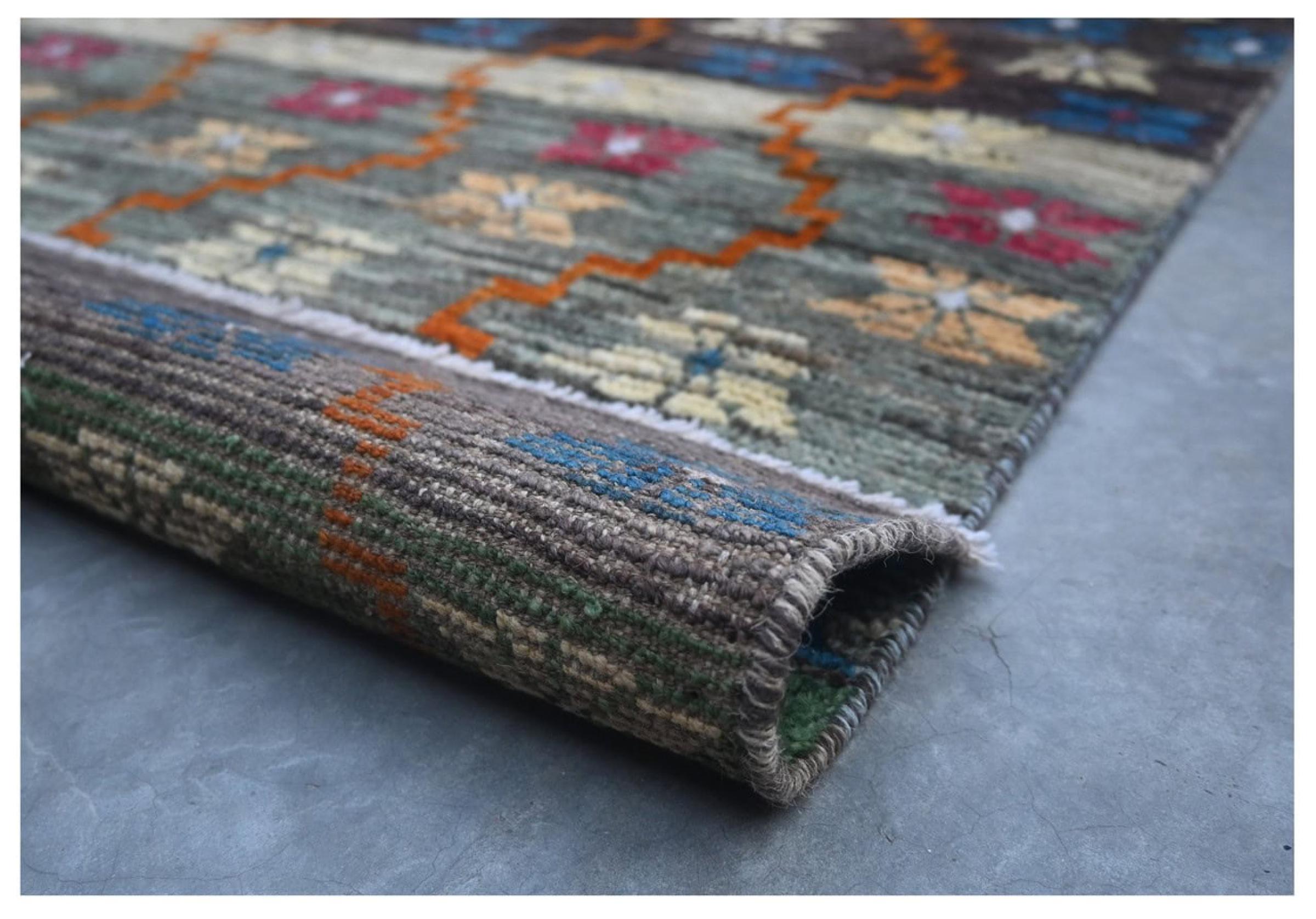 Questo tappeto Artisan è stato annodato a mano in Afghanistan. Ha un motivo vivace e colorato che è perfetto per l'estate. I colori forti, in particolare, sono tornati di moda e possono essere facilmente integrati nei moderni concetti di ambiente. Con la sua densità di nodi e lo spesso vello morbido, questo tappeto assomiglia alle sue controparti in mattoni o Gabbeh.