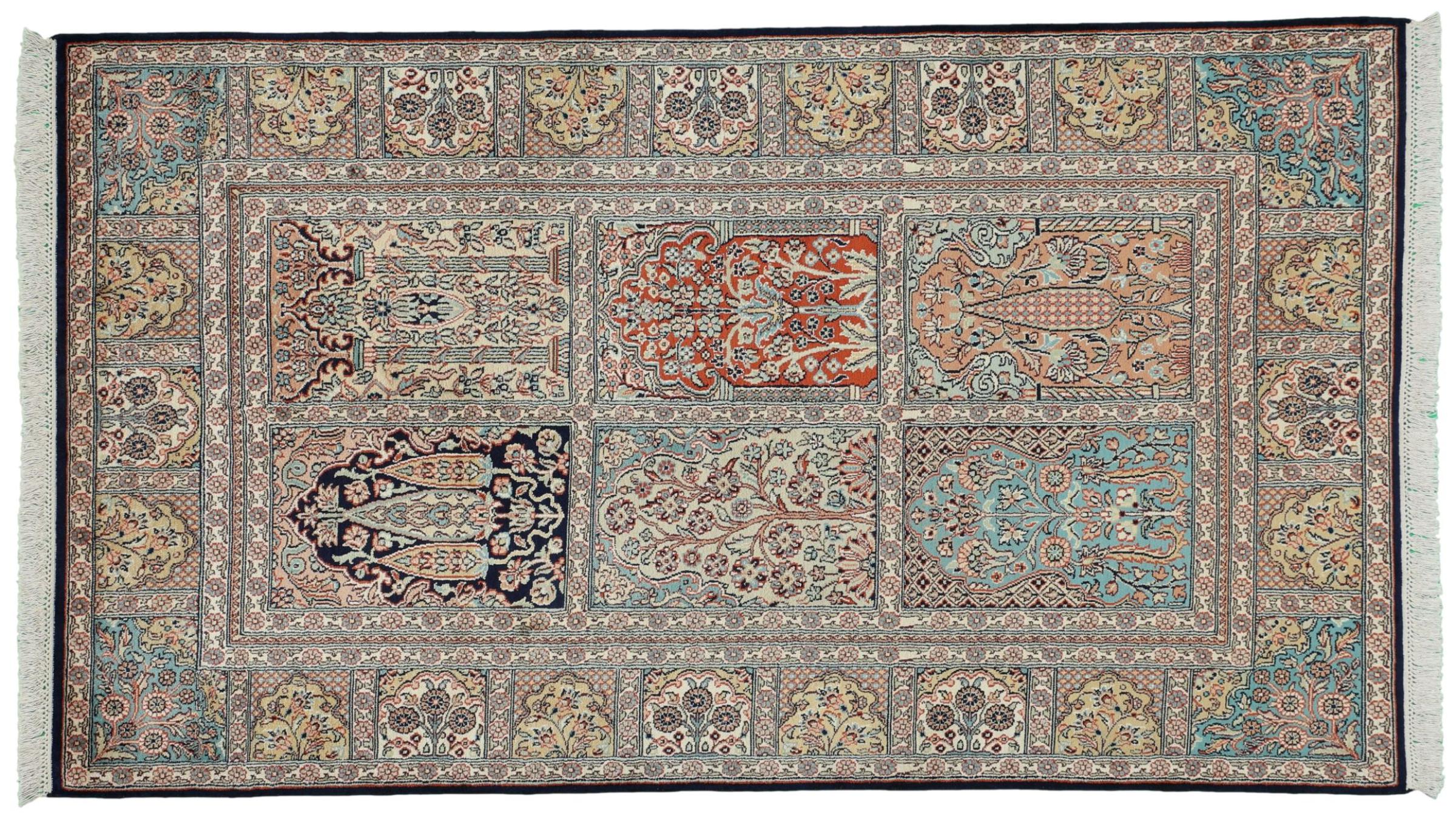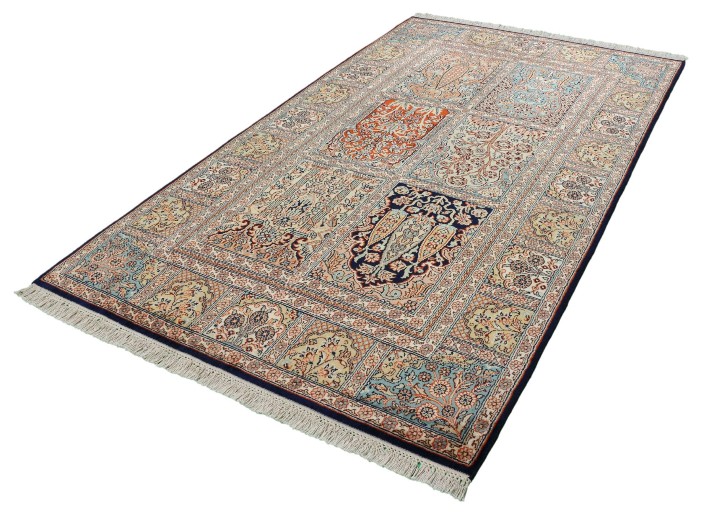 Tappeto-N.: 309662007181069 Dimensione: 166x96 cm Spessore: circa . 4 mm Nodi: 440 000 - 490 000 / m² Lavorazione: Annodato a mano Fondo: Seta Catena: Cotone Origine: India Età: Nuovo Peso: circa . 3 kg Disponibile: Unico - Solo 1 disponibili