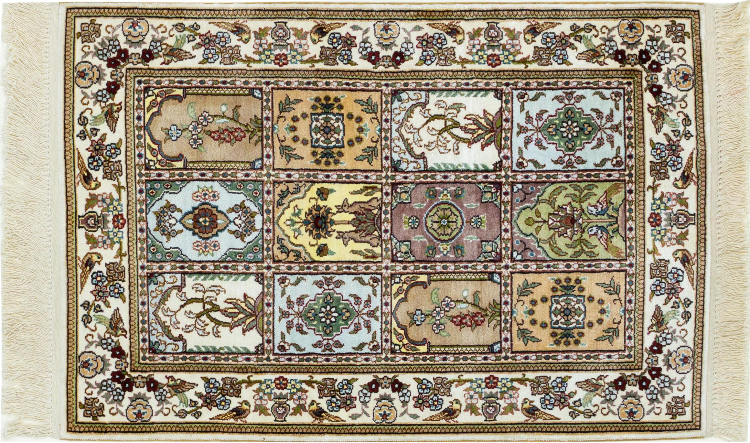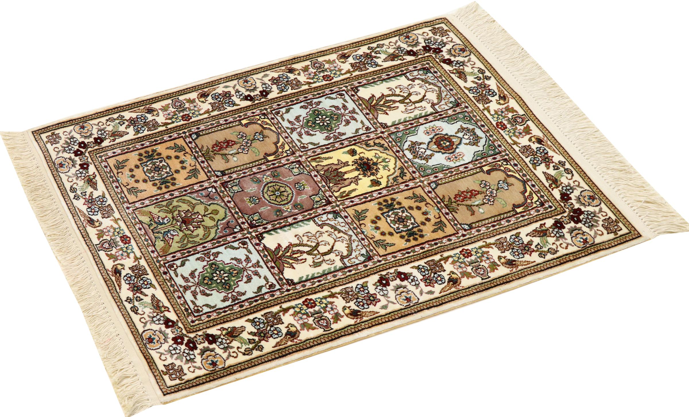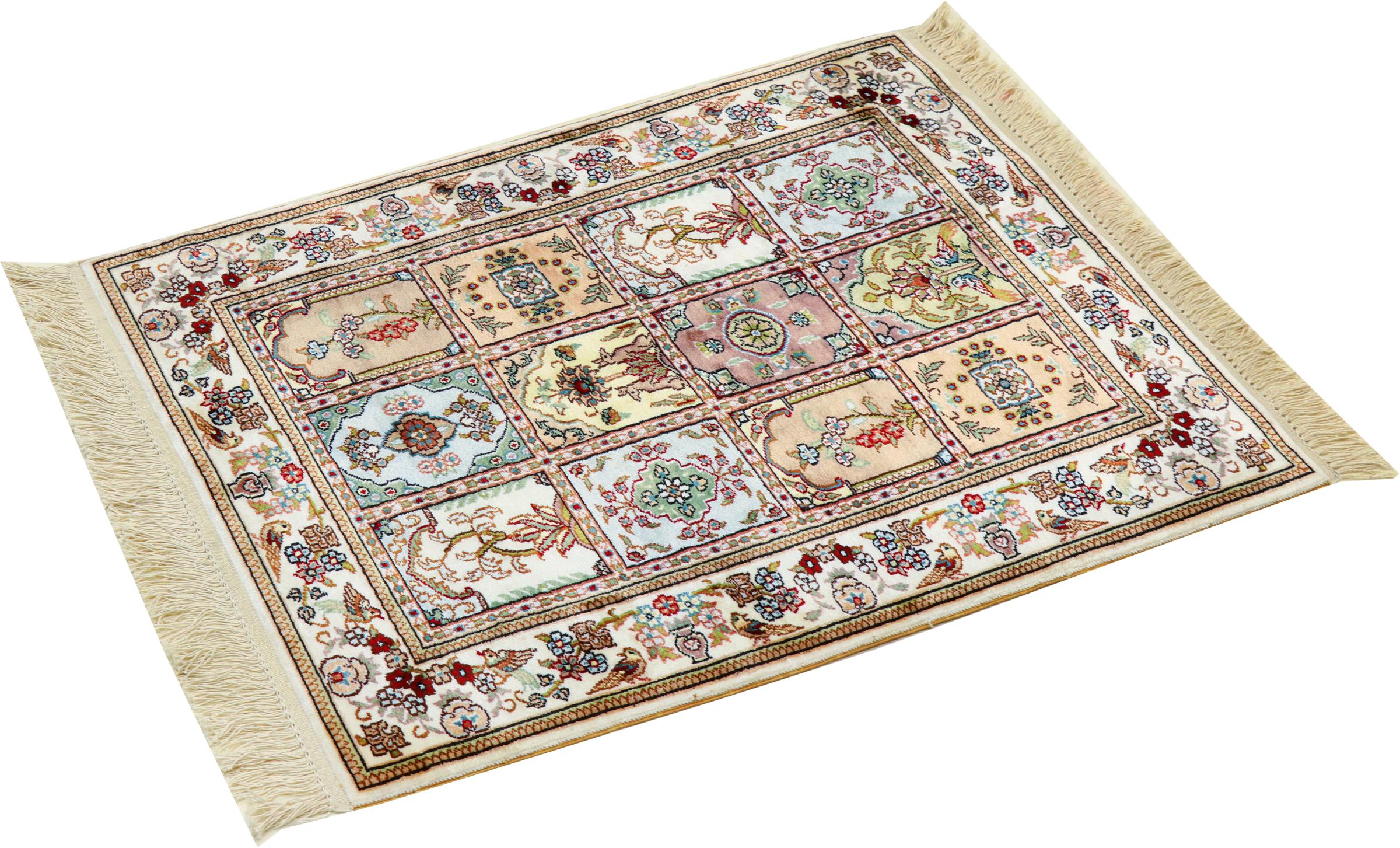 Tappeto-N.: 303280008995542 Dimensione: 93x60 cm Spessore: circa . 5 mm Nodi: 450 000 - 500 000 / m² Lavorazione: Annodato a mano Fondo: Seta Catena: Seta Origine: Cina Età: Nuovo Peso: circa . 2 kg Disponibile: Unico - Solo 1 disponibili