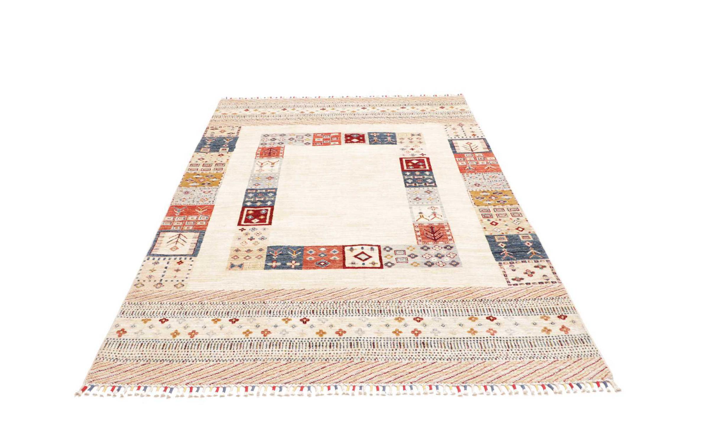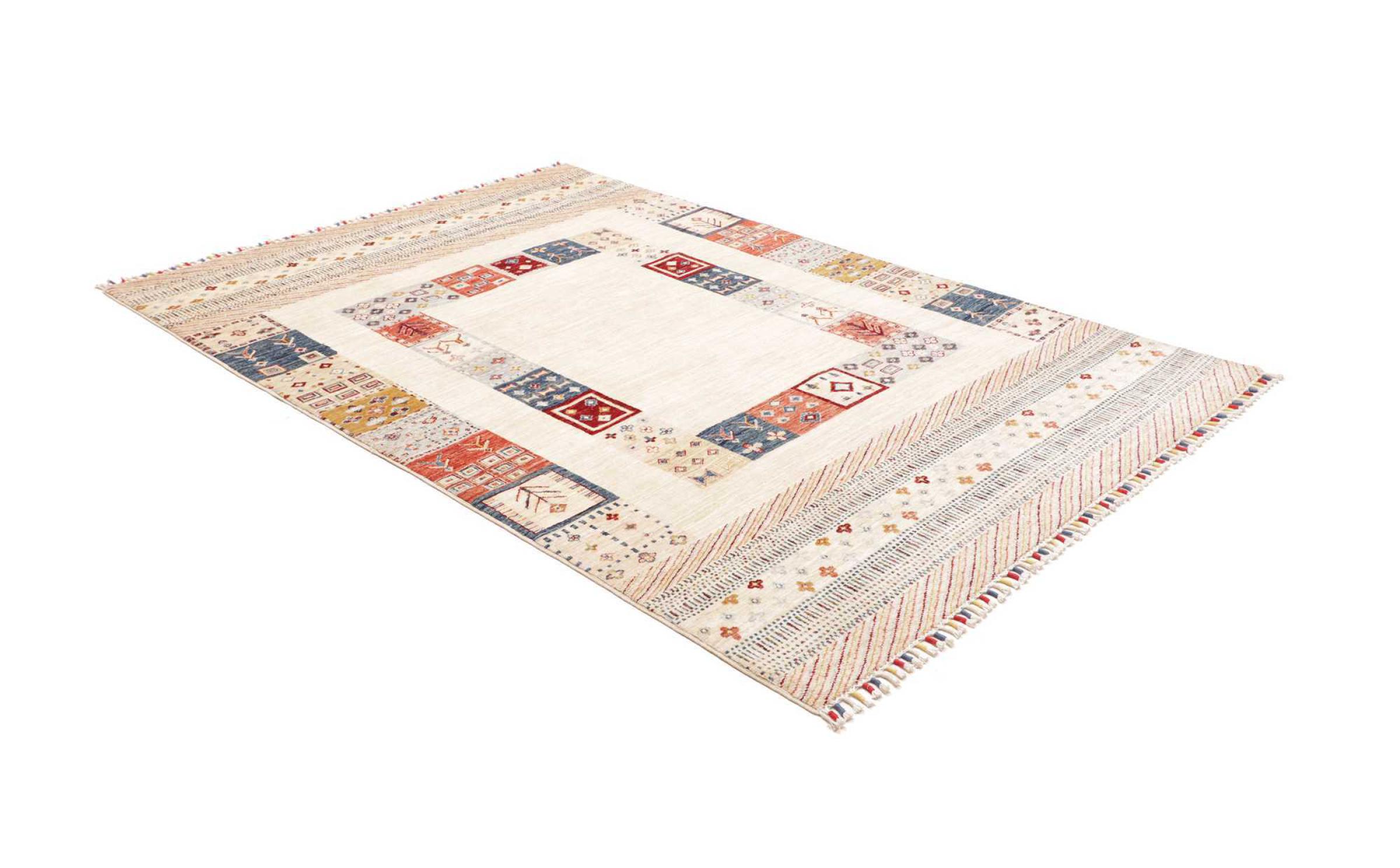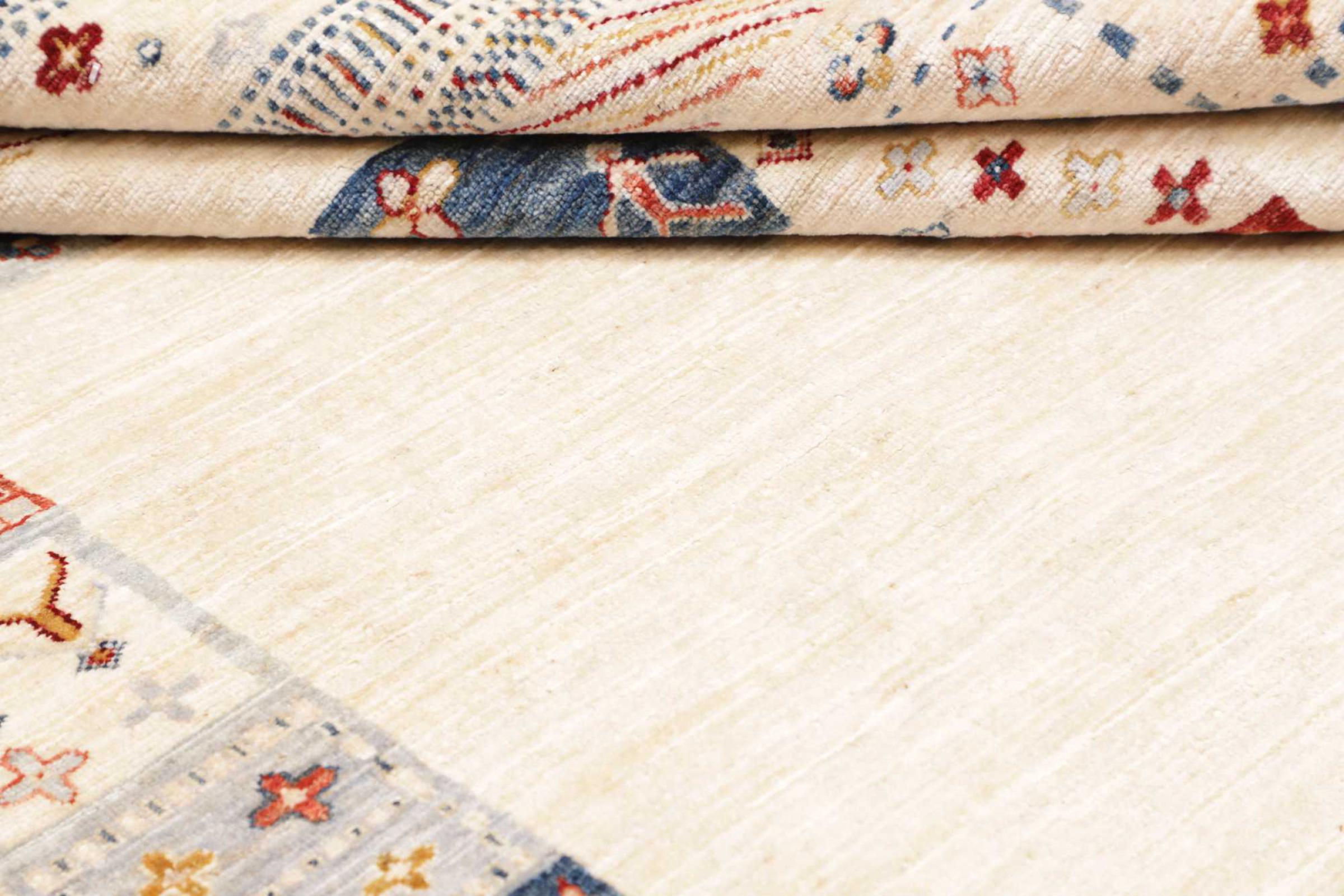 Questo tappeto è realizzato in lana di pecora filata a mano di altissima qualità. Soprattutto in Iran (ex Persia), Afghanistan e Pakistan la lana viene ancora filata a mano prima che inizi l'annodatura vera e propria del tappeto. La lana si è dimostrata nei secoli un materiale naturale ed estremamente resistente. Tra le altre cose, ha proprietà di repellenza allo sporco e di isolamento termico. Allo stesso tempo, la lana è incomparabilmente morbida e ha una lucentezza naturale.