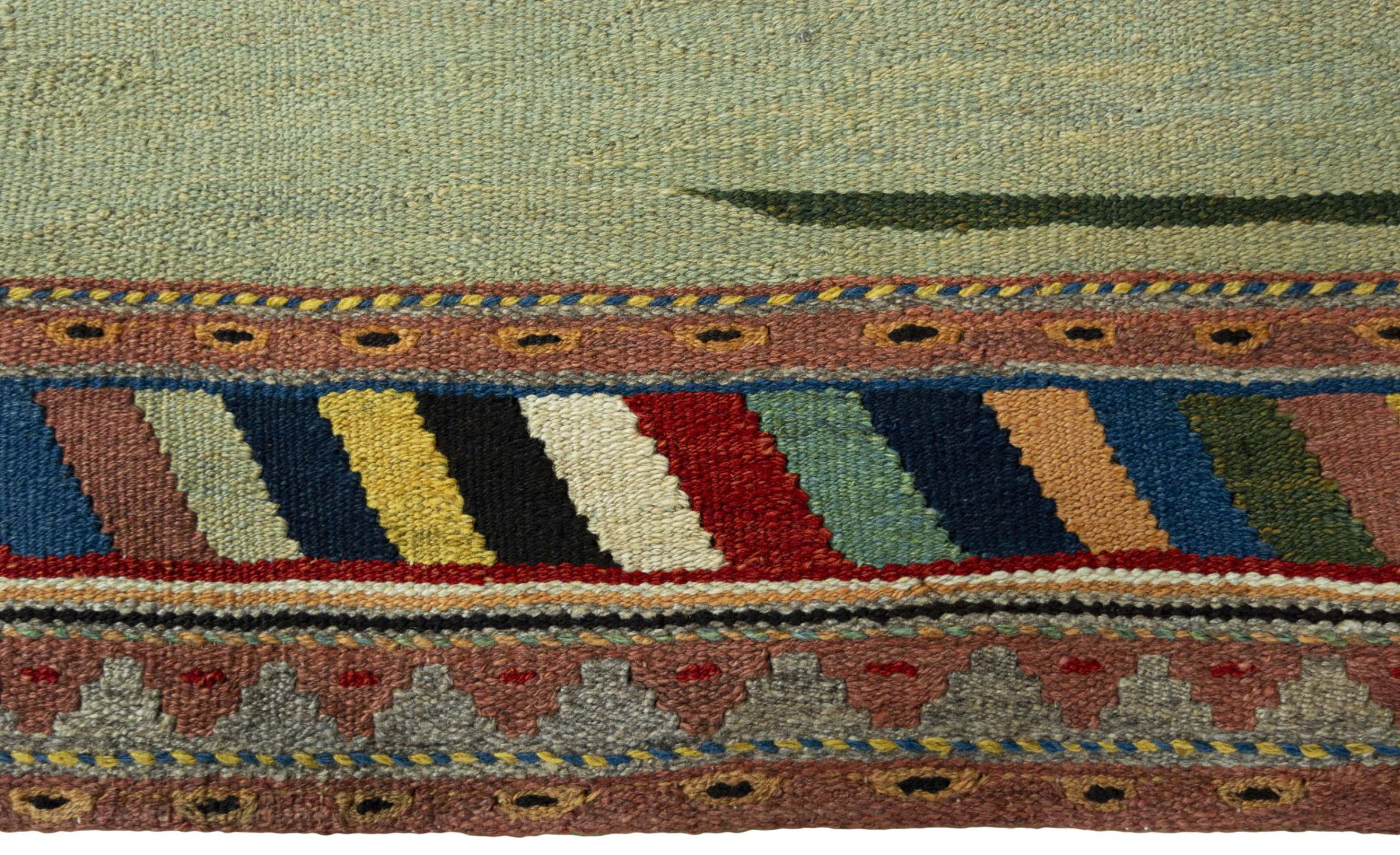 Questo tappeto è stato realizzato a mano su un telaio come una trama piatta. Flatweave è il termine usato per descrivere i tappeti che non hanno pelo. Come promette il nome, questi tappeti sono tessuti e non annodati. Il risultato è un tappeto piatto con una superficie strutturata. Le trame piatte non sono così morbide e di solito più sottili dei tappeti annodati. Allo stesso tempo sono molto meno complessi da produrre e di solito possono essere disposti da entrambi i lati (davanti e dietro). I loro motivi sono di solito geometrici, che è determinato dal tessuto.
