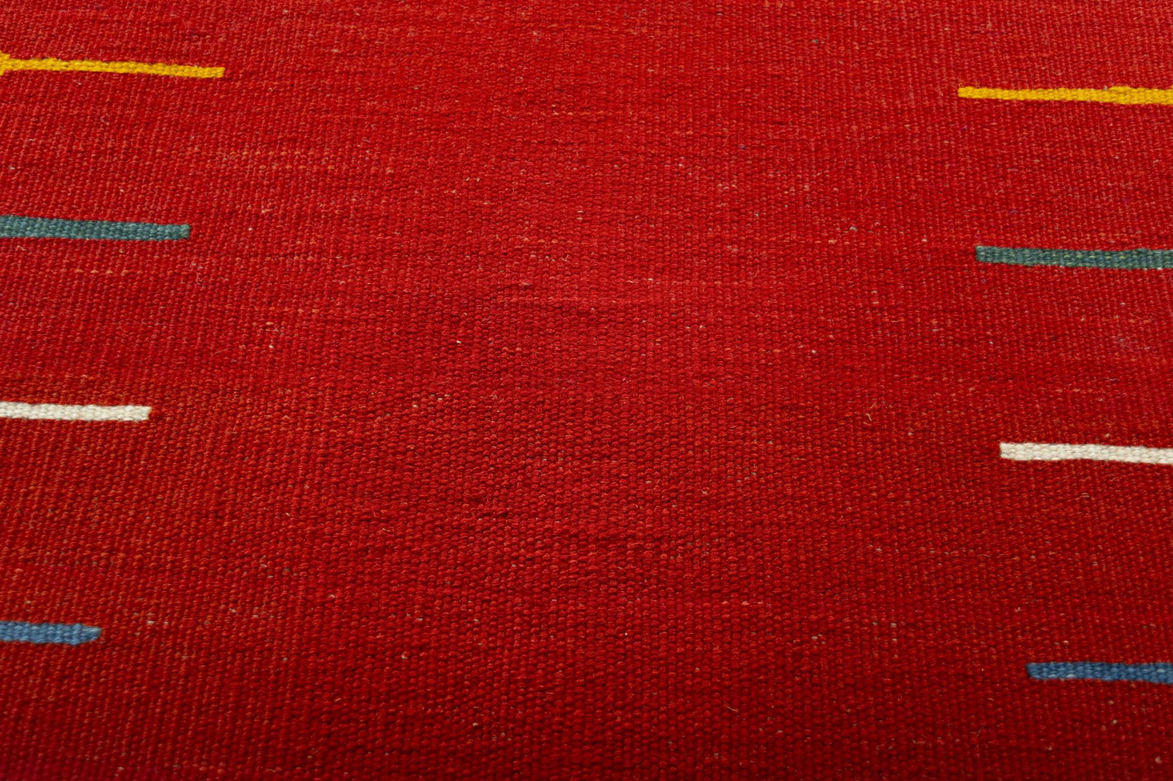 Questo tappeto è stato realizzato a mano su un telaio come una trama piatta. Flatweave è il termine usato per descrivere i tappeti che non hanno pelo. Come promette il nome, questi tappeti sono tessuti e non annodati. Il risultato è un tappeto piatto con una superficie strutturata. Le trame piatte non sono così morbide e di solito più sottili dei tappeti annodati. Allo stesso tempo sono molto meno complessi da produrre e di solito possono essere disposti da entrambi i lati (davanti e dietro). I loro motivi sono di solito geometrici, che è determinato dal tessuto.