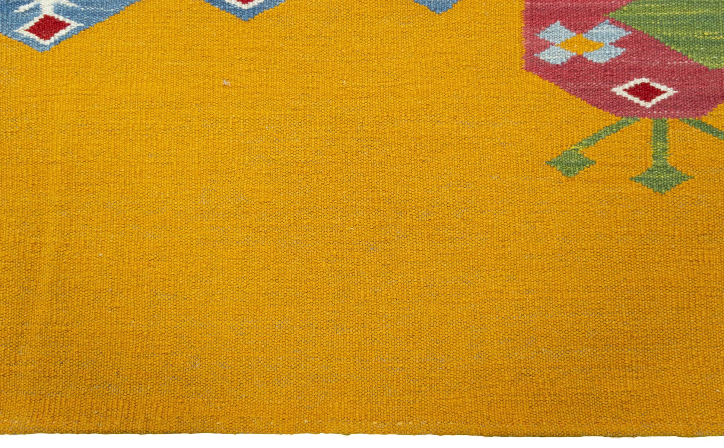 Questo tappeto è stato realizzato a mano su un telaio come una trama piatta. Flatweave è il termine usato per descrivere i tappeti che non hanno pelo. Come promette il nome, questi tappeti sono tessuti e non annodati. Il risultato è un tappeto piatto con una superficie strutturata. Le trame piatte non sono così morbide e di solito più sottili dei tappeti annodati. Allo stesso tempo sono molto meno complessi da produrre e di solito possono essere disposti da entrambi i lati (davanti e dietro). I loro motivi sono di solito geometrici, che è determinato dal tessuto.