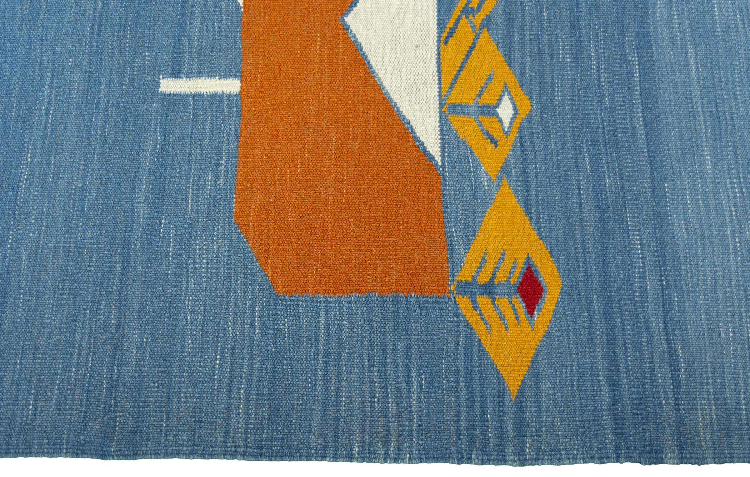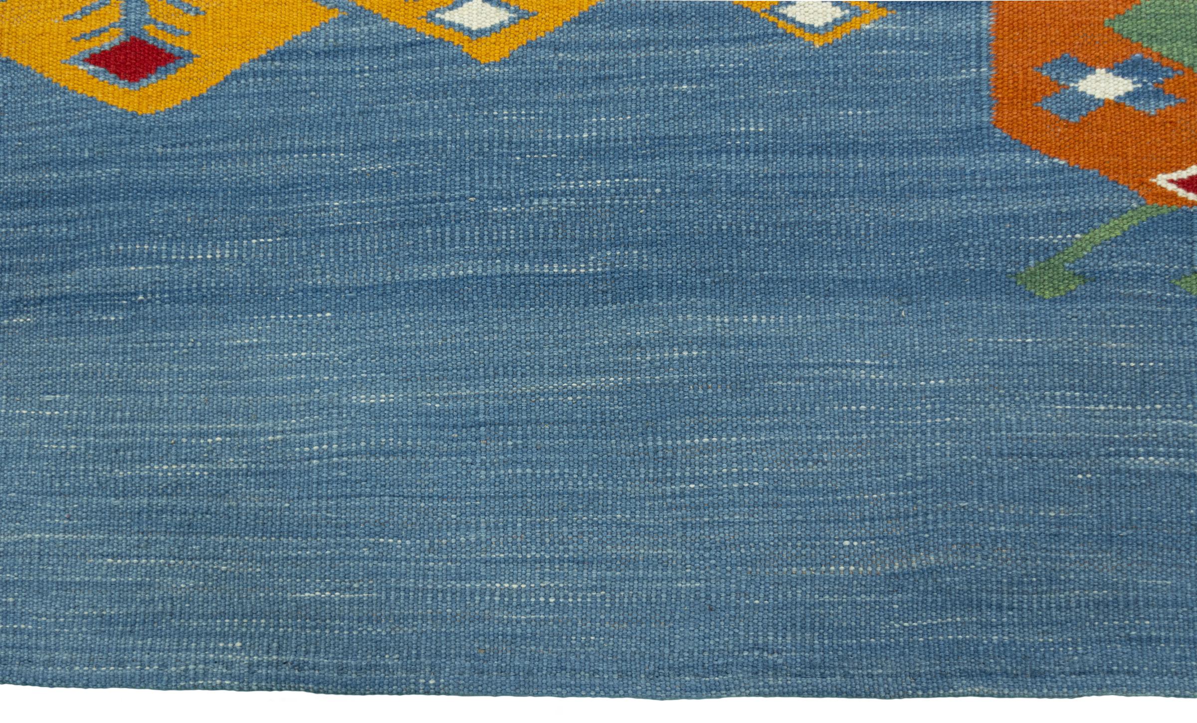 Questo tappeto è stato realizzato a mano su un telaio come una trama piatta. Flatweave è il termine usato per descrivere i tappeti che non hanno pelo. Come promette il nome, questi tappeti sono tessuti e non annodati. Il risultato è un tappeto piatto con una superficie strutturata. Le trame piatte non sono così morbide e di solito più sottili dei tappeti annodati. Allo stesso tempo sono molto meno complessi da produrre e di solito possono essere disposti da entrambi i lati (davanti e dietro). I loro motivi sono di solito geometrici, che è determinato dal tessuto.