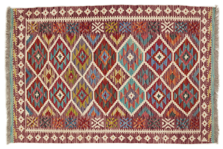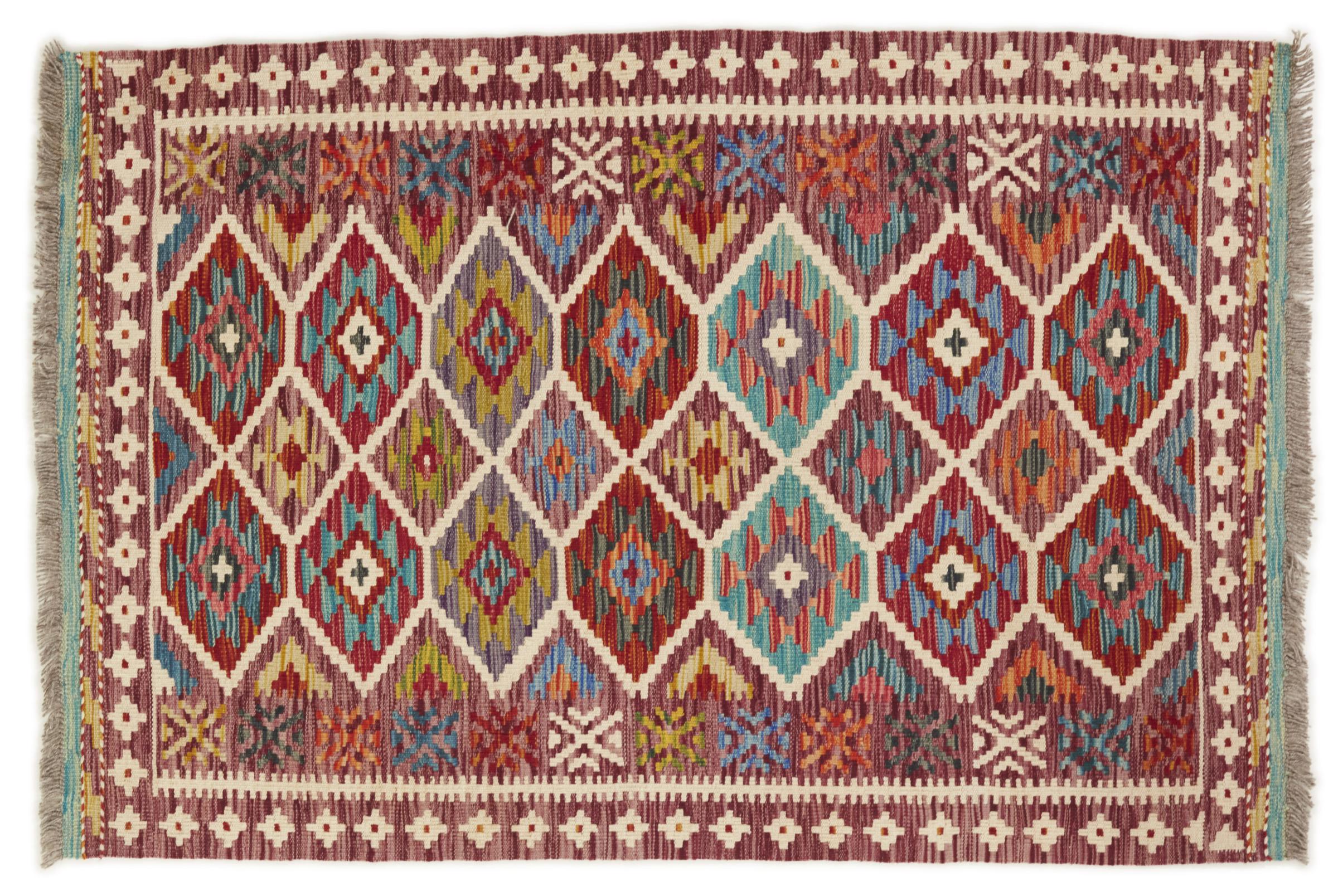 Questo kilim - afghano tessuto a mano è bello sia per i suoi colori e sia per il modello tipico. È stato tessuto a mano in Afghanistan con il 100% di lana. È anche robusto e durevole. Un vero e proprio profitto per voi e per la vostra casa.