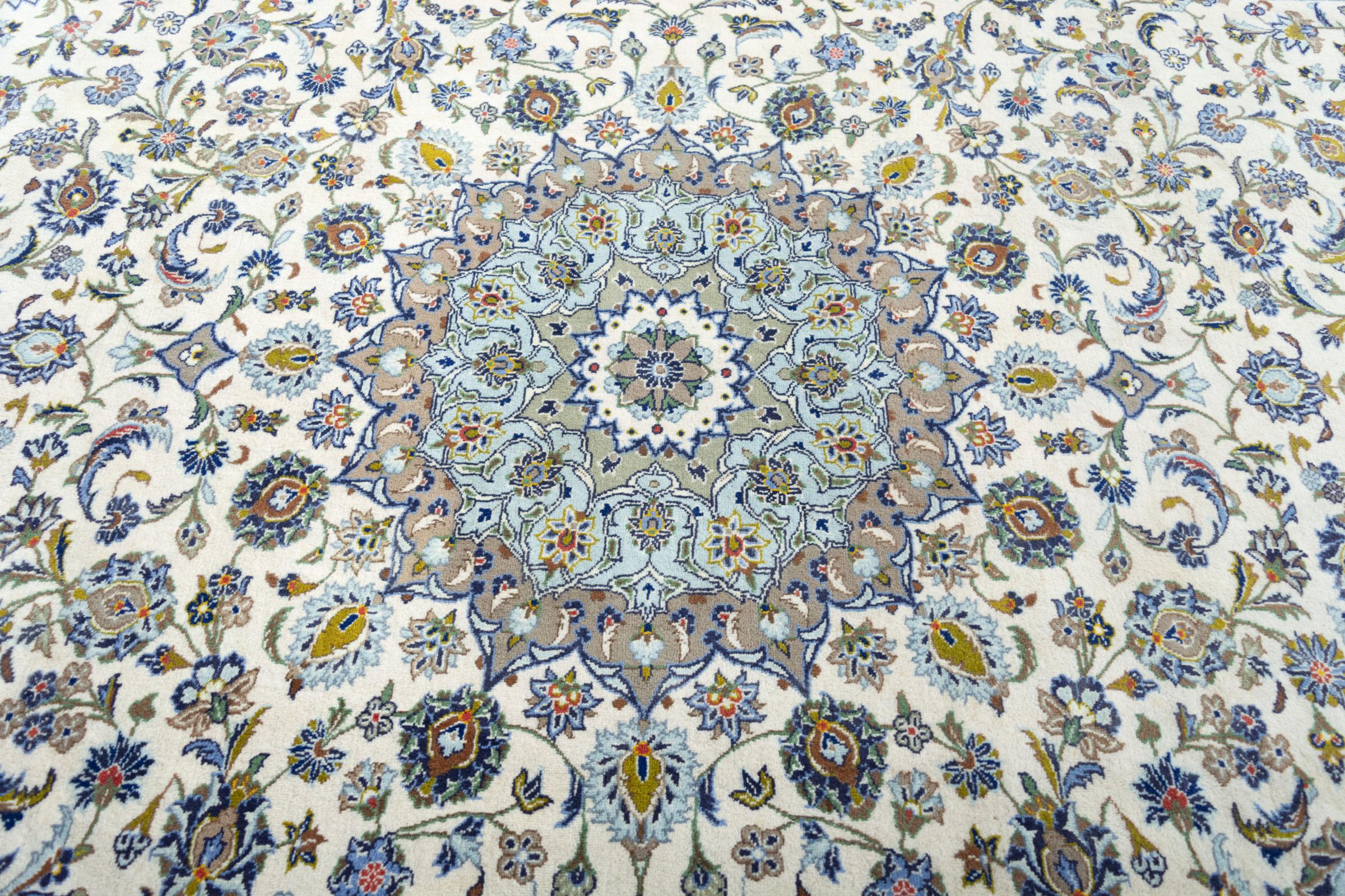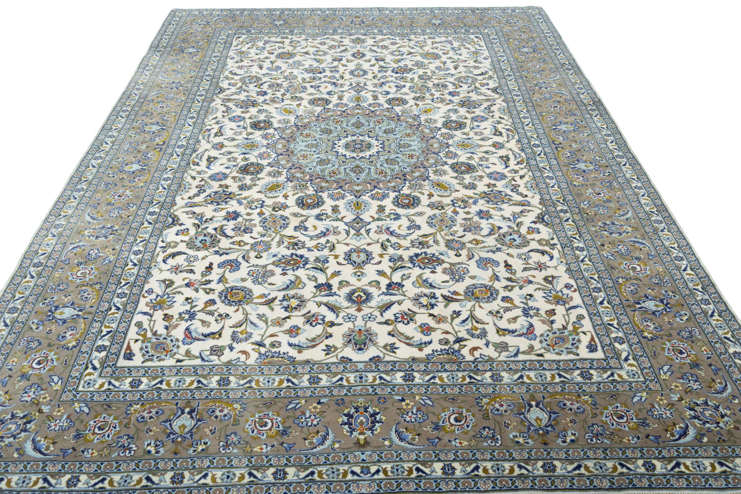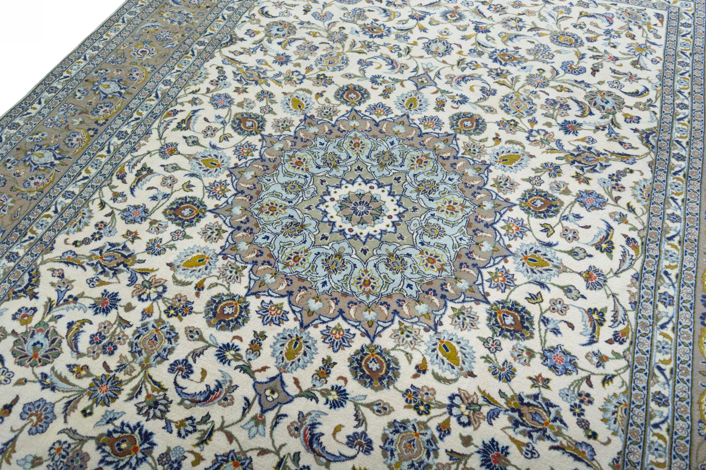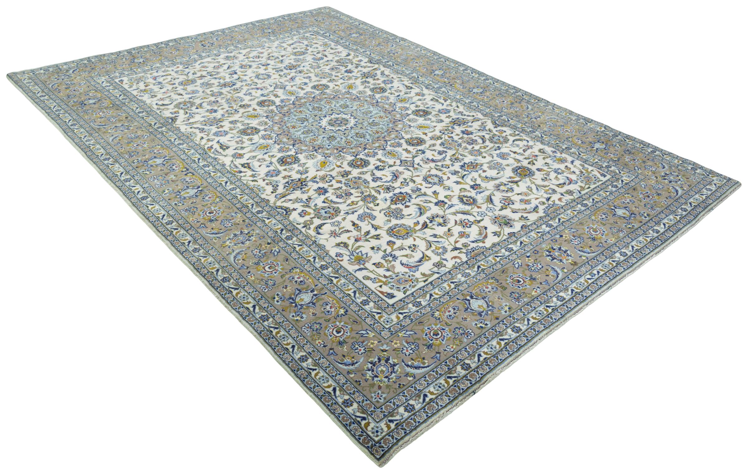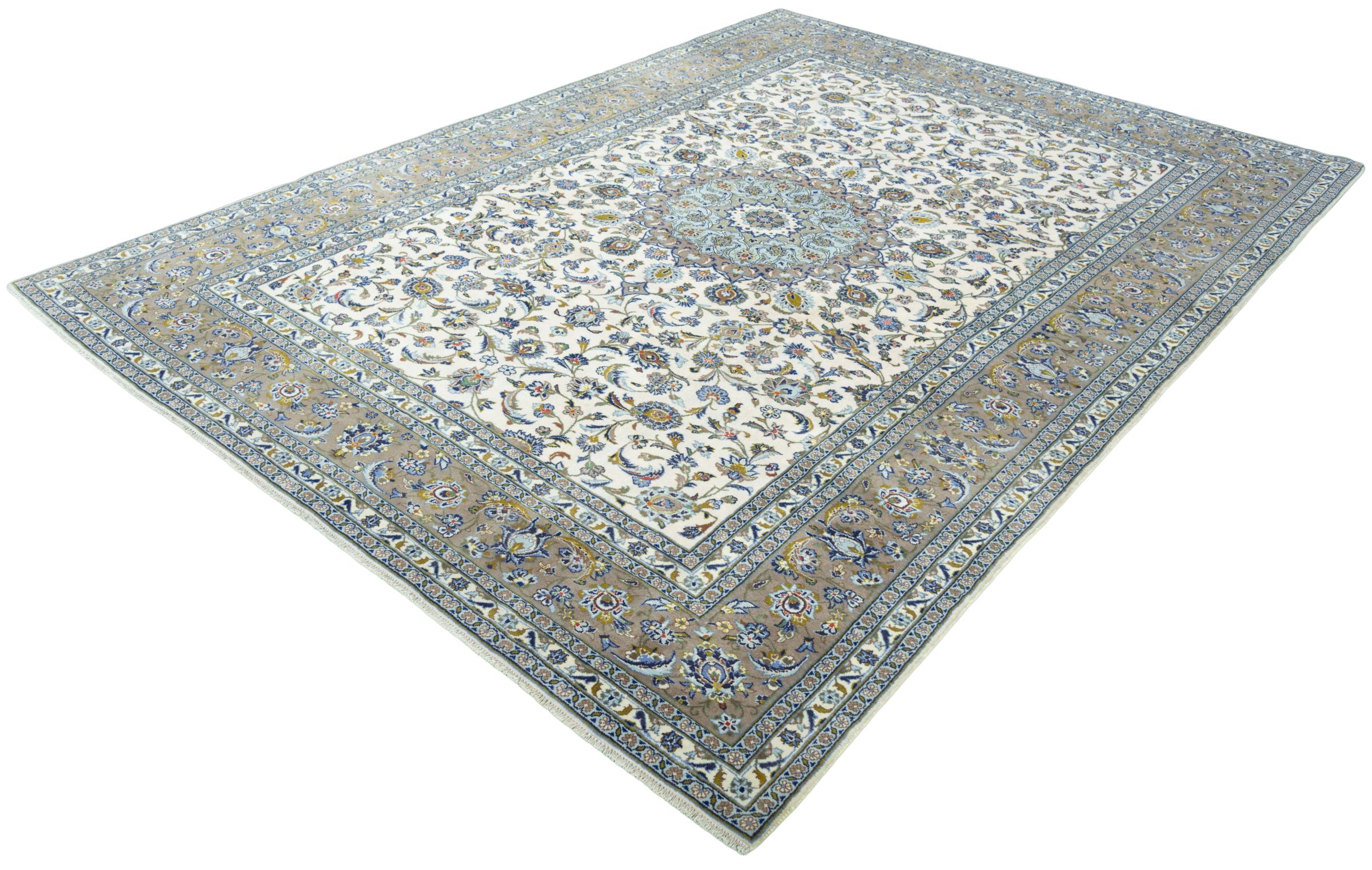Questo tappeto di Kashan (Keshan) è tenuto nel suo design persiano molto tradizionale e tipico con bellissimi ornamenti. I tappeti Kashan sono molto popolari grazie al loro design eccezionalmente elegante. Questi tappeti provengono da Kashan, una città sull'antica Via della Seta. Questo tappeto è stato annodato a mano con lana di pecora di alta qualità e sarà un pezzo unico nella tua casa.
