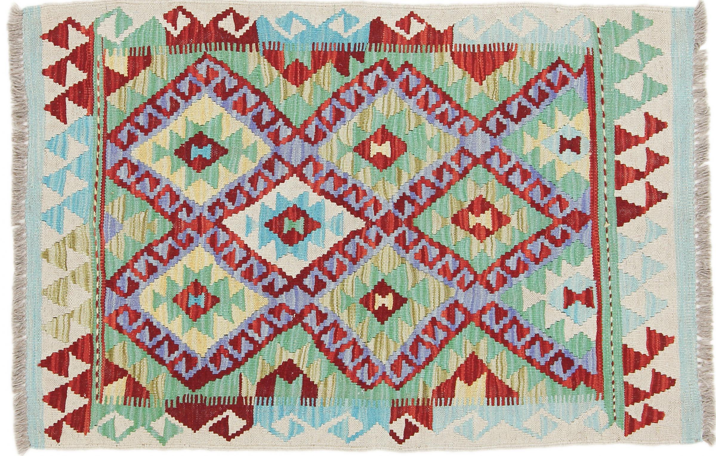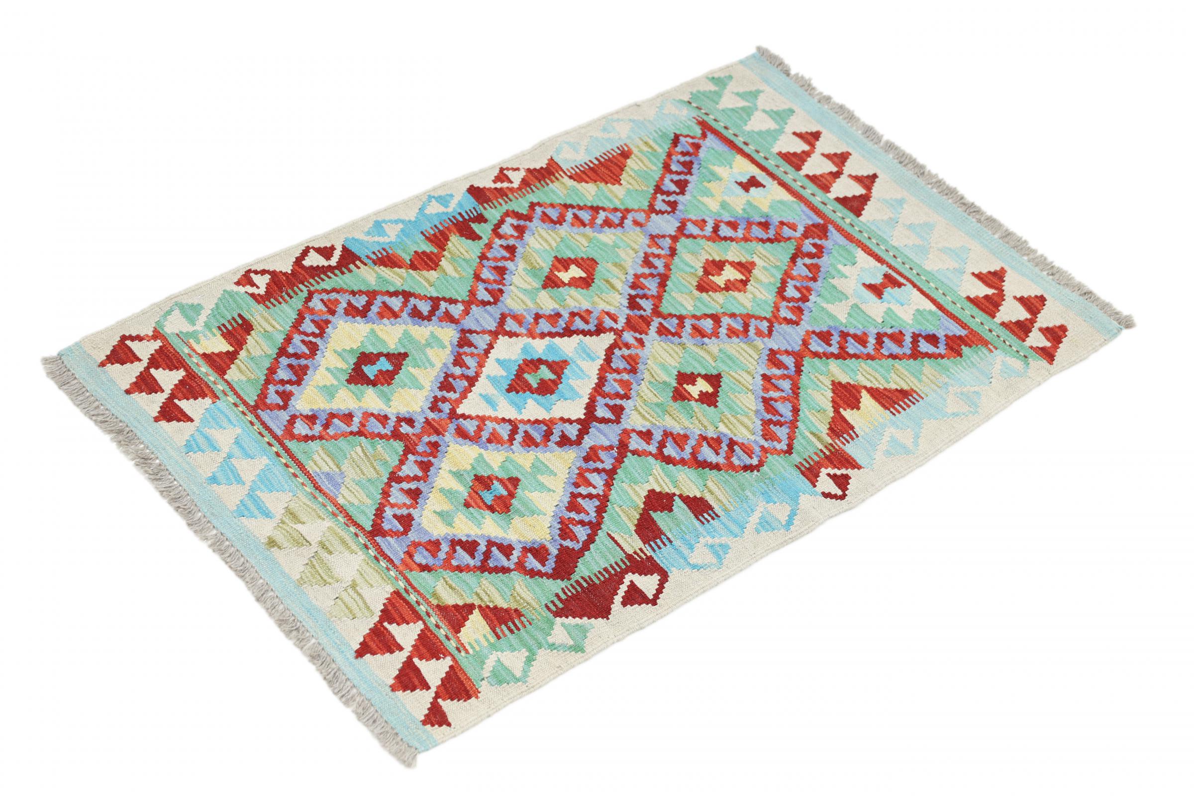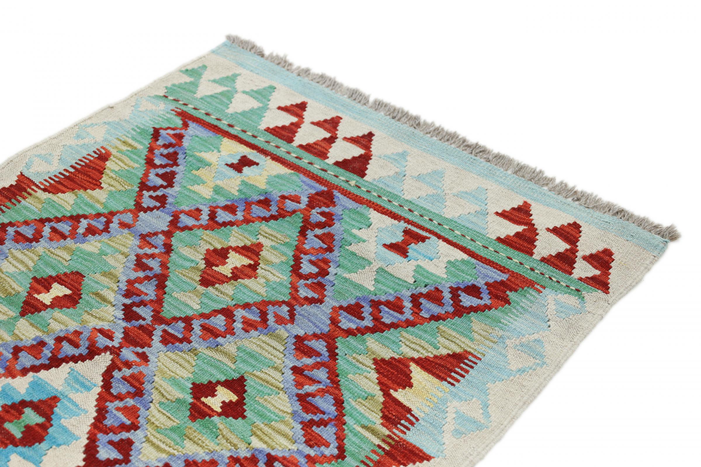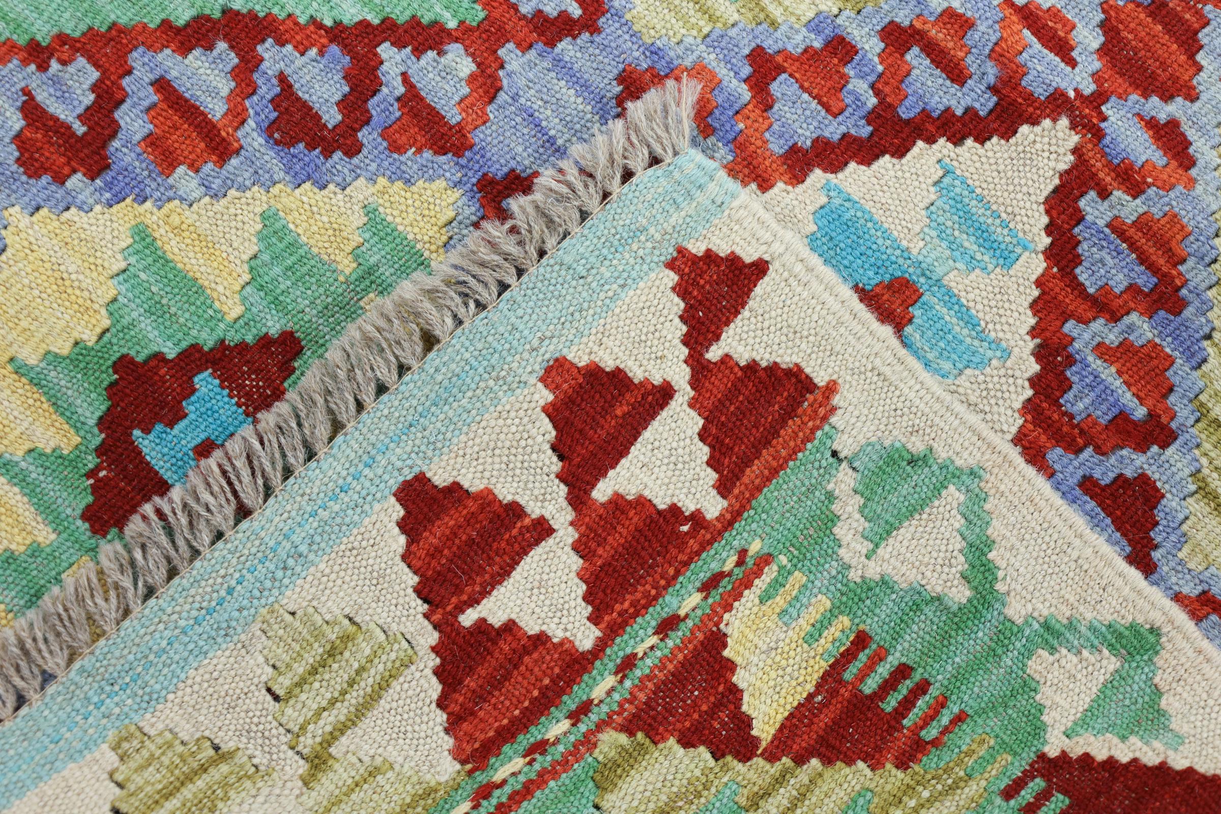Questo kilim - afghano tessuto a mano è bello sia per i suoi colori e sia per il modello tipico. È stato tessuto a mano in Afghanistan con il 100% di lana. È anche robusto e durevole. Un vero e proprio profitto per voi e per la vostra casa.
