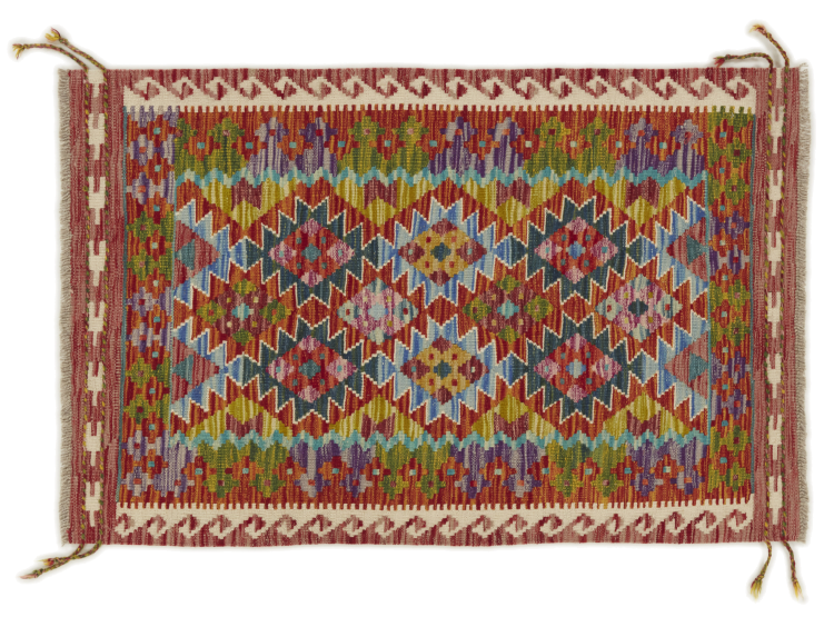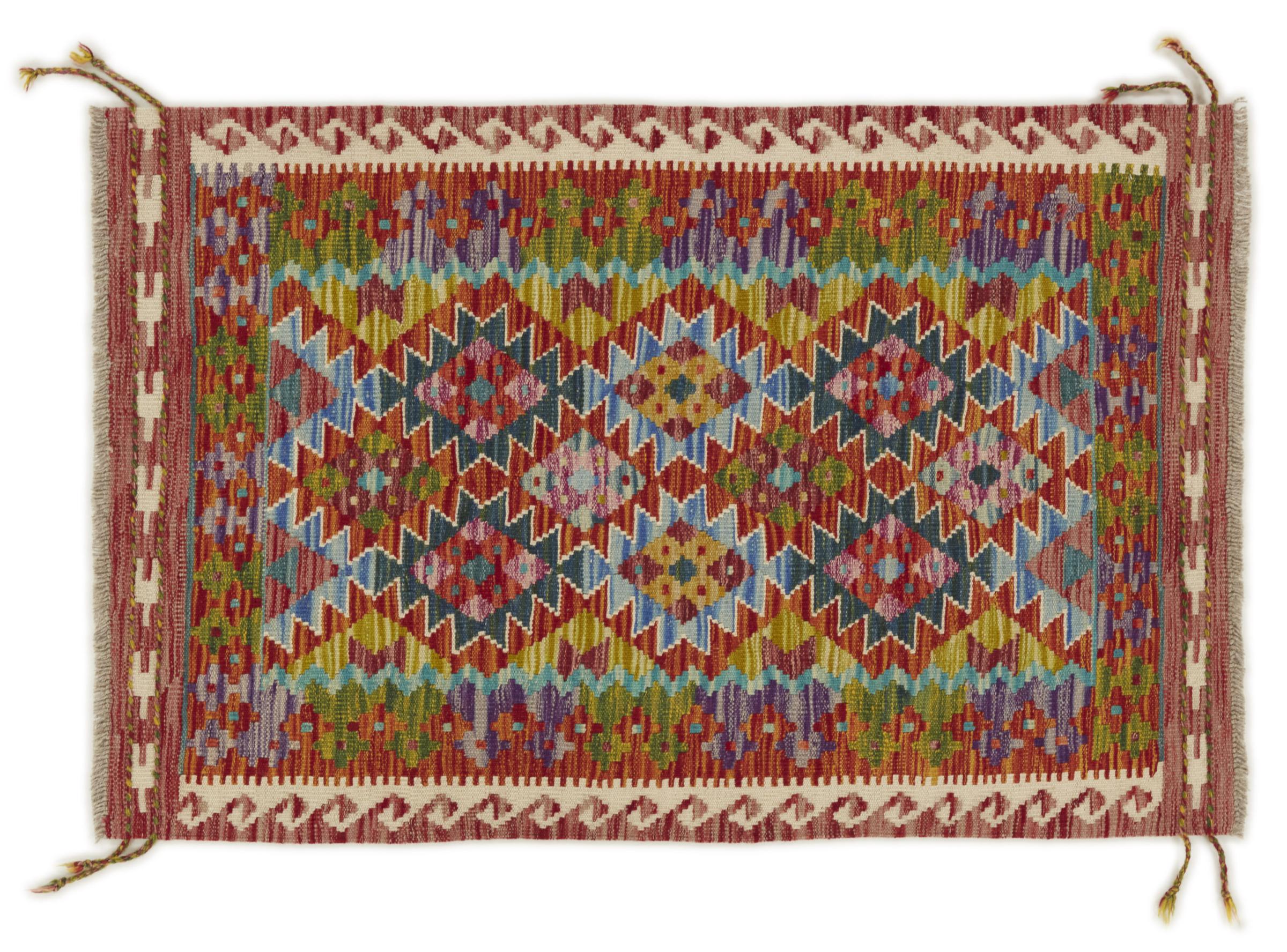 Questo kilim - afghano tessuto a mano è bello sia per i suoi colori e sia per il modello tipico. È stato tessuto a mano in Afghanistan con il 100% di lana. È anche robusto e durevole. Un vero e proprio profitto per voi e per la vostra casa.