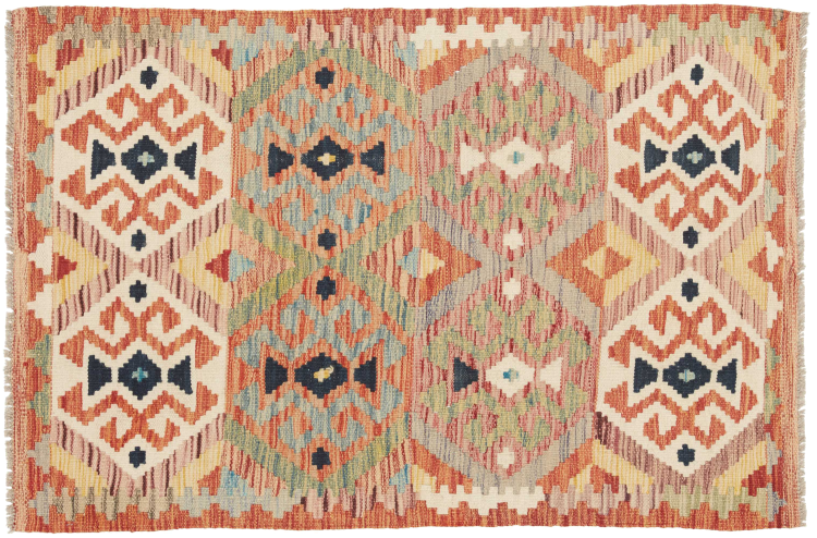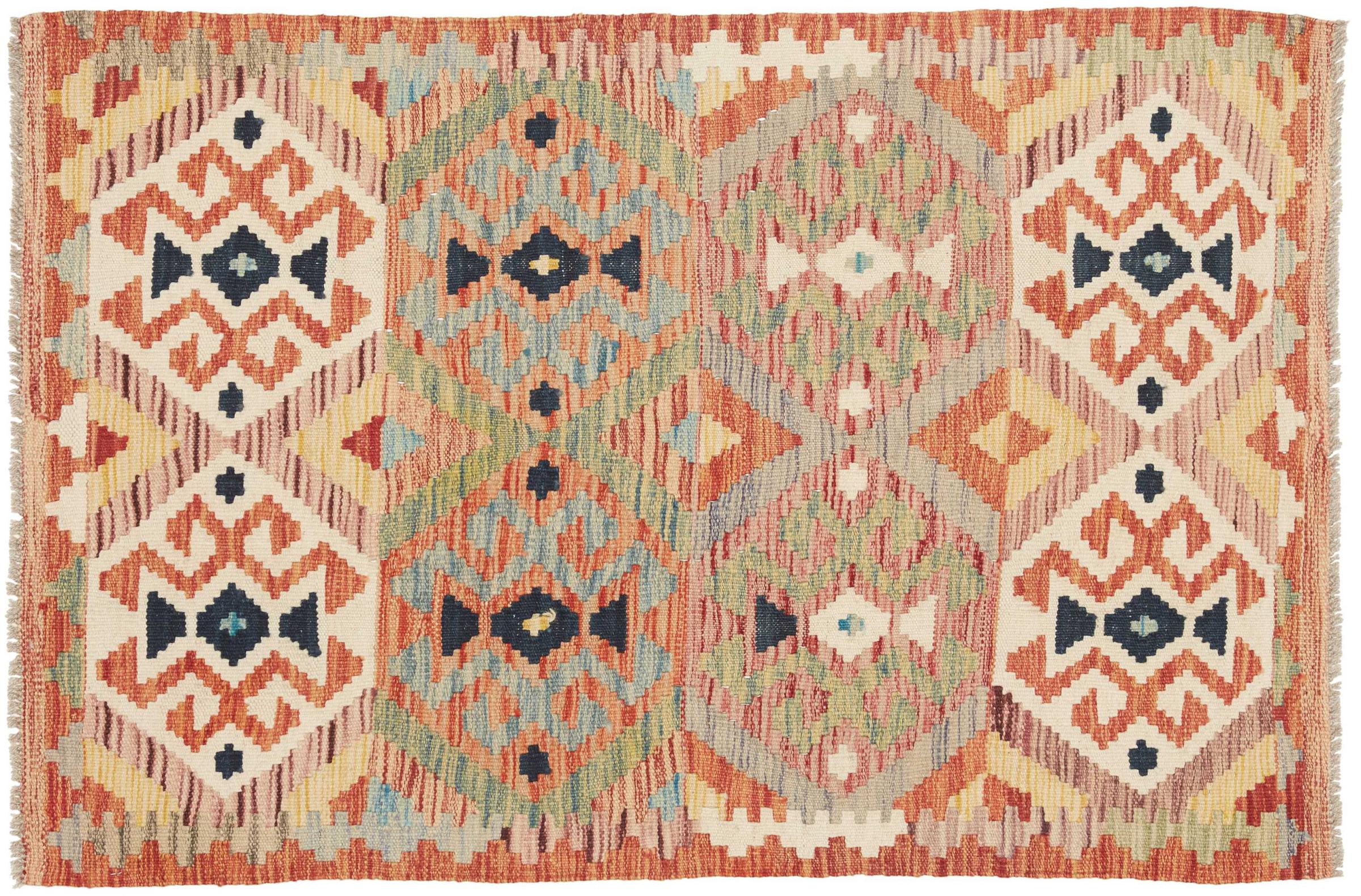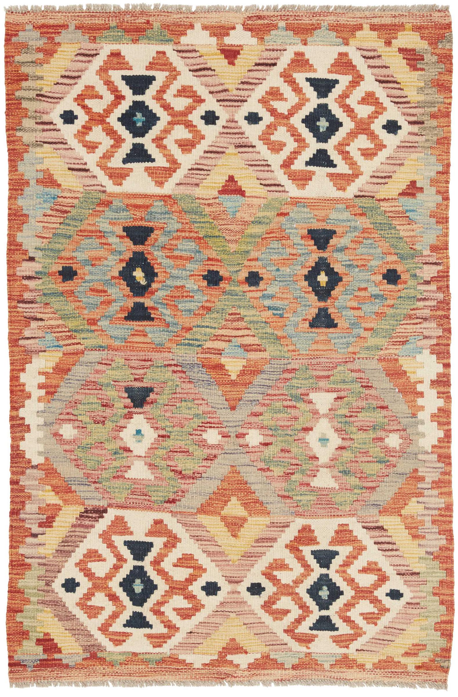 Questo kilim - afghano tessuto a mano è bello sia per i suoi colori e sia per il modello tipico. È stato tessuto a mano in Afghanistan con il 100% di lana. È anche robusto e durevole. Un vero e proprio profitto per voi e per la vostra casa.