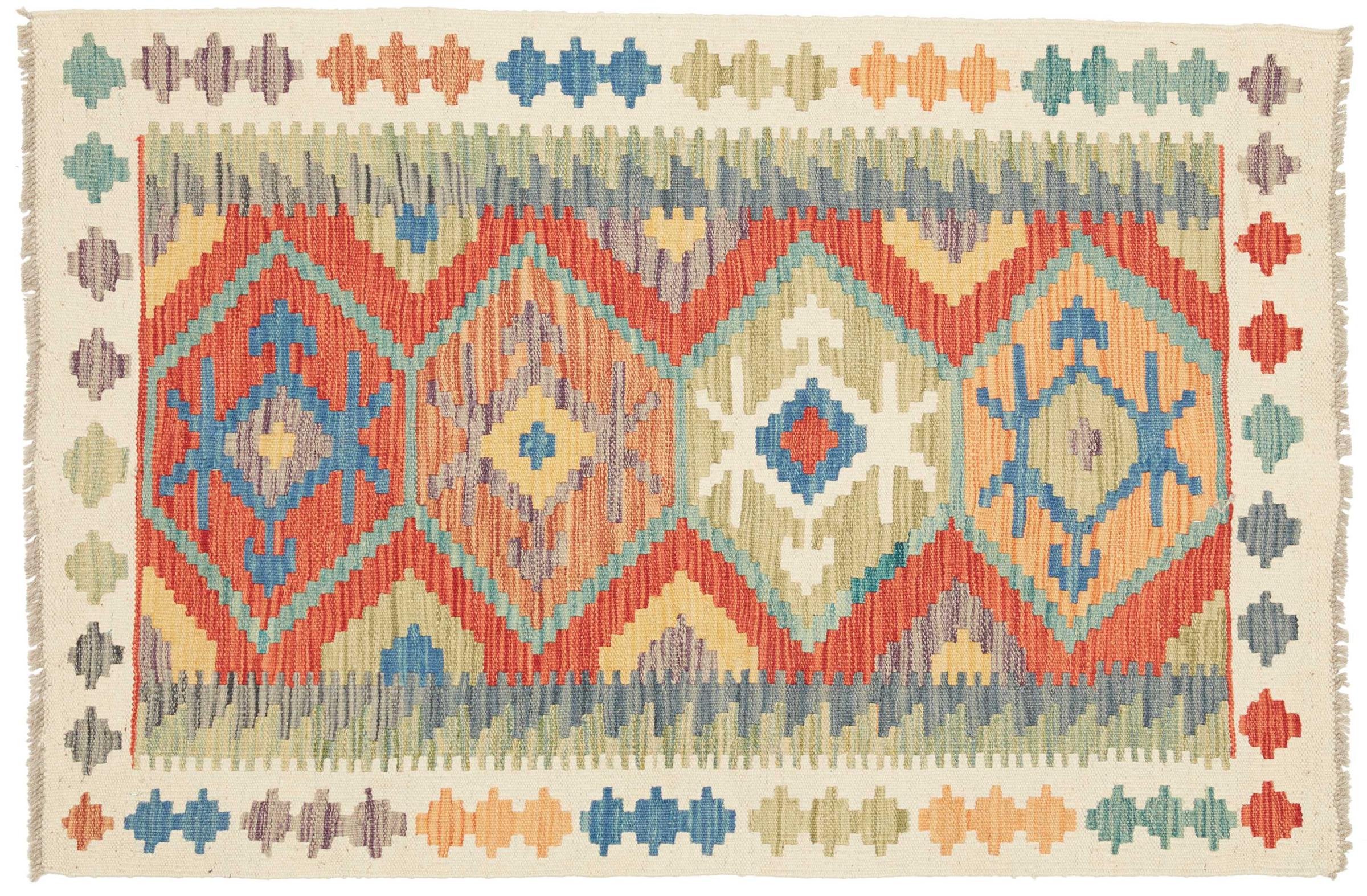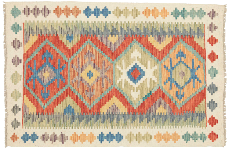 Questo kilim - afghano tessuto a mano è bello sia per i suoi colori e sia per il modello tipico. È stato tessuto a mano in Afghanistan con il 100% di lana. È anche robusto e durevole. Un vero e proprio profitto per voi e per la vostra casa.
