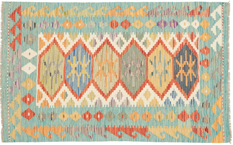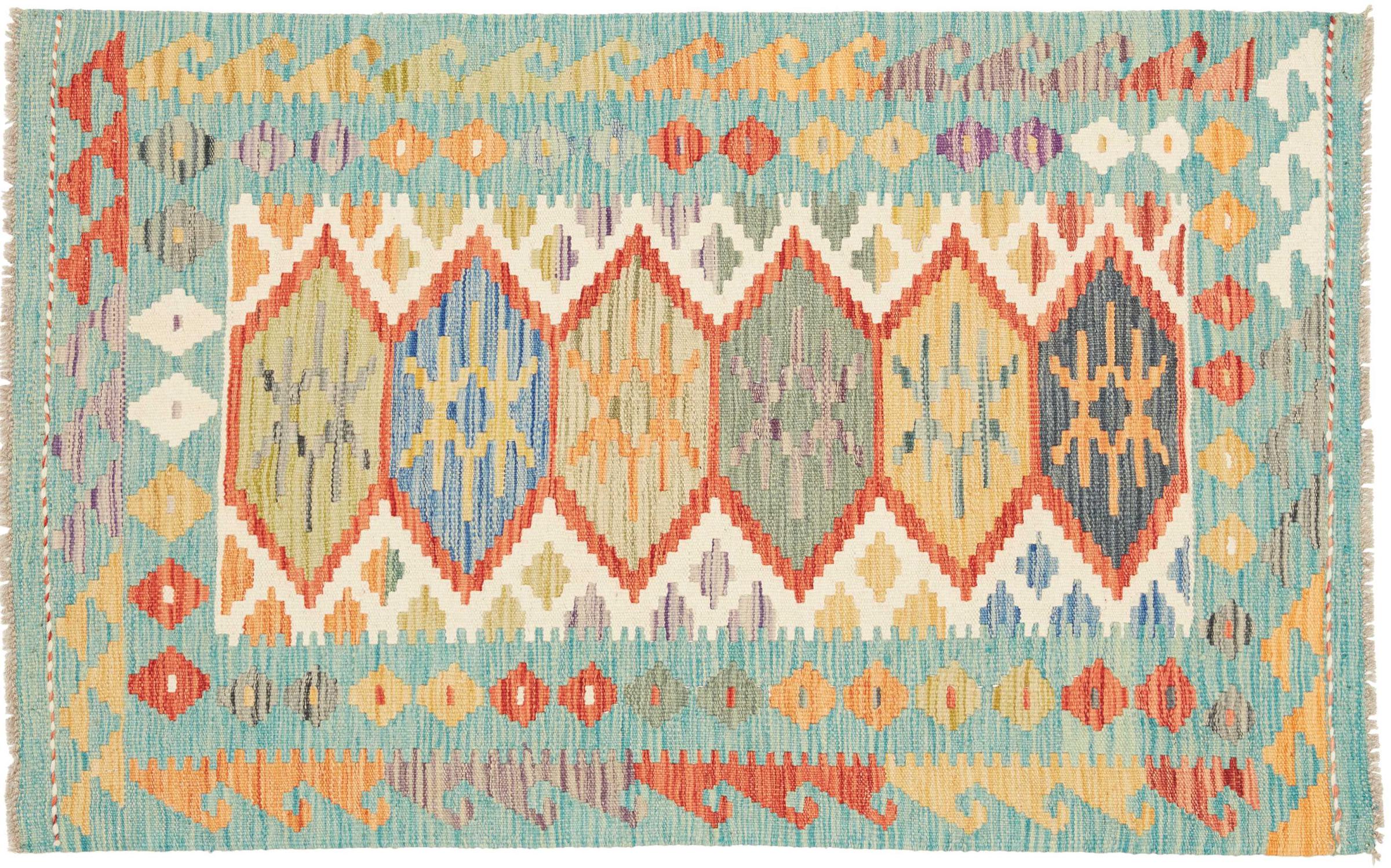 Questo kilim - afghano tessuto a mano è bello sia per i suoi colori e sia per il modello tipico. È stato tessuto a mano in Afghanistan con il 100% di lana. È anche robusto e durevole. Un vero e proprio profitto per voi e per la vostra casa.