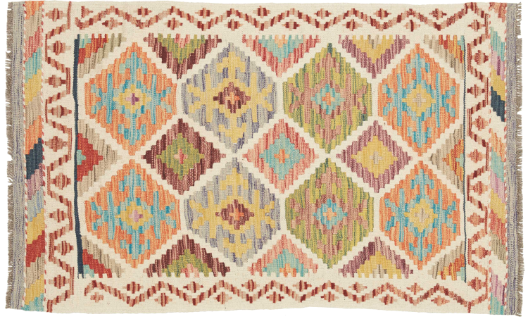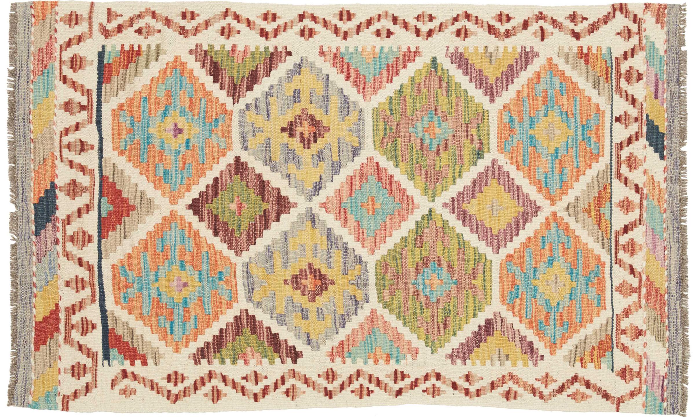 Questo kilim - afghano tessuto a mano è bello sia per i suoi colori e sia per il modello tipico. È stato tessuto a mano in Afghanistan con il 100% di lana. È anche robusto e durevole. Un vero e proprio profitto per voi e per la vostra casa.