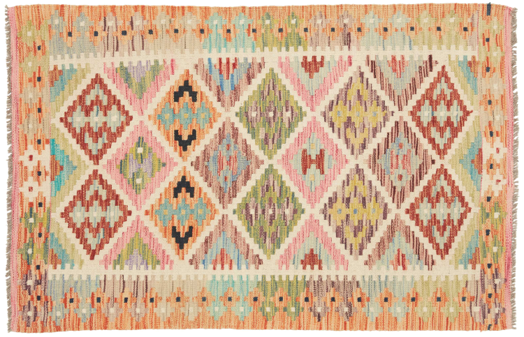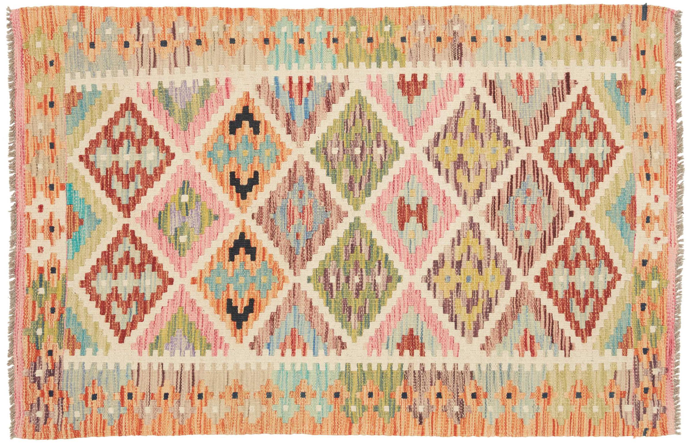 Questo kilim - afghano tessuto a mano è bello sia per i suoi colori e sia per il modello tipico. È stato tessuto a mano in Afghanistan con il 100% di lana. È anche robusto e durevole. Un vero e proprio profitto per voi e per la vostra casa.