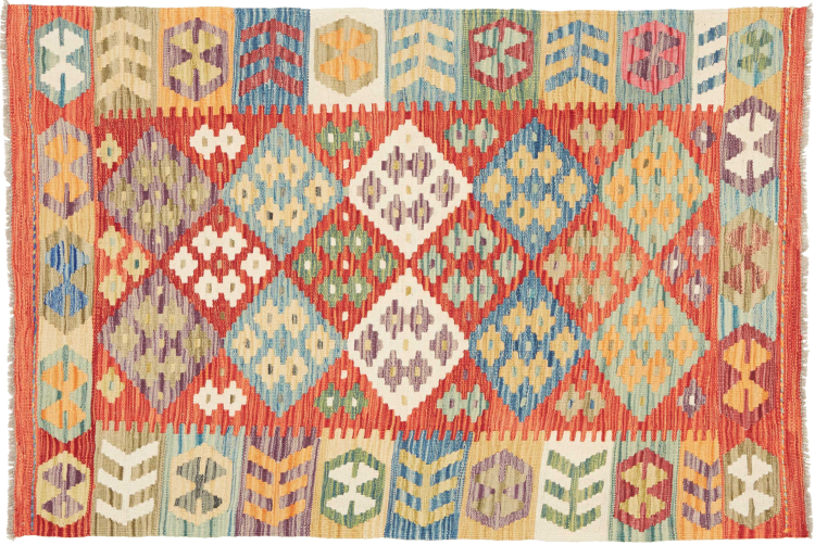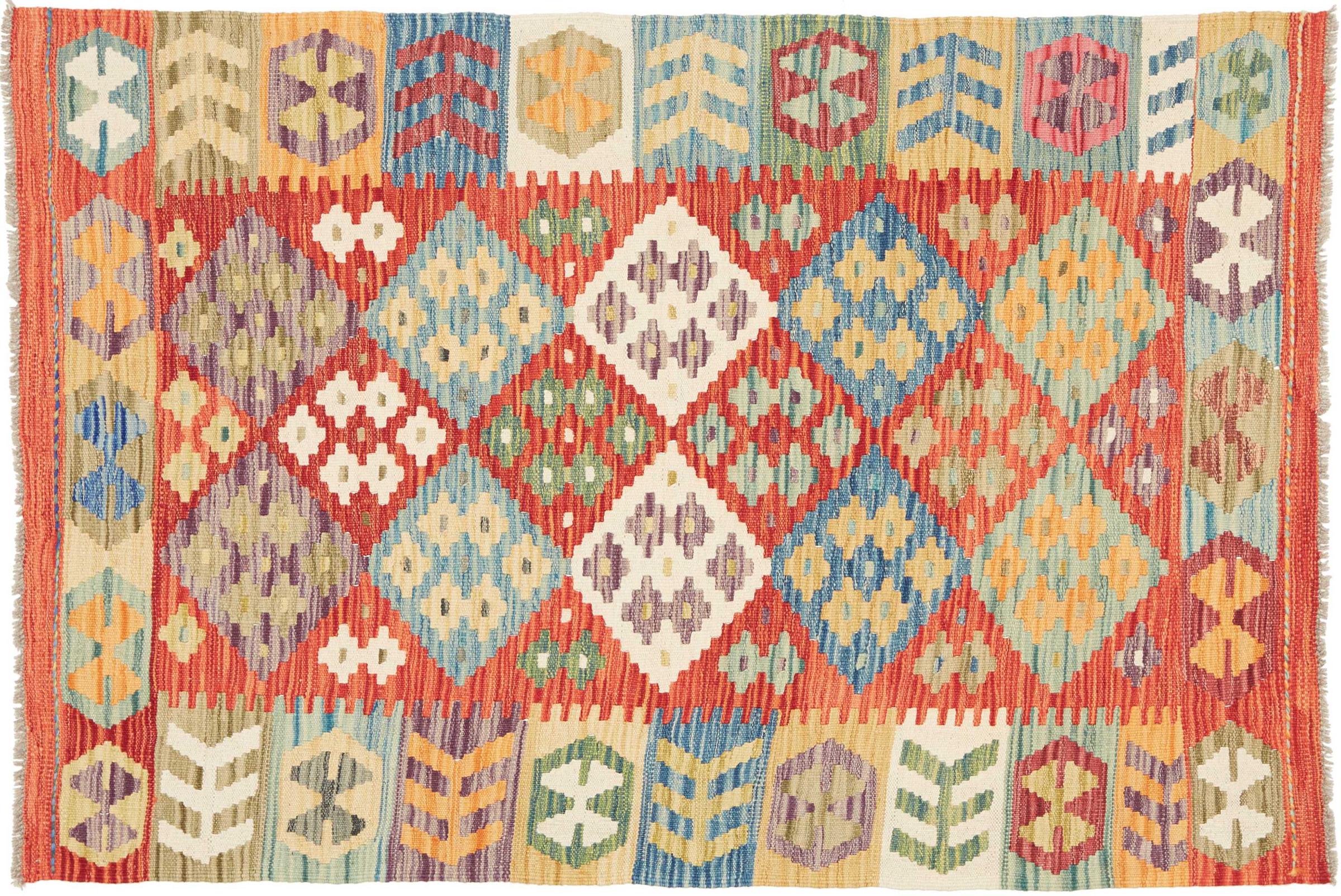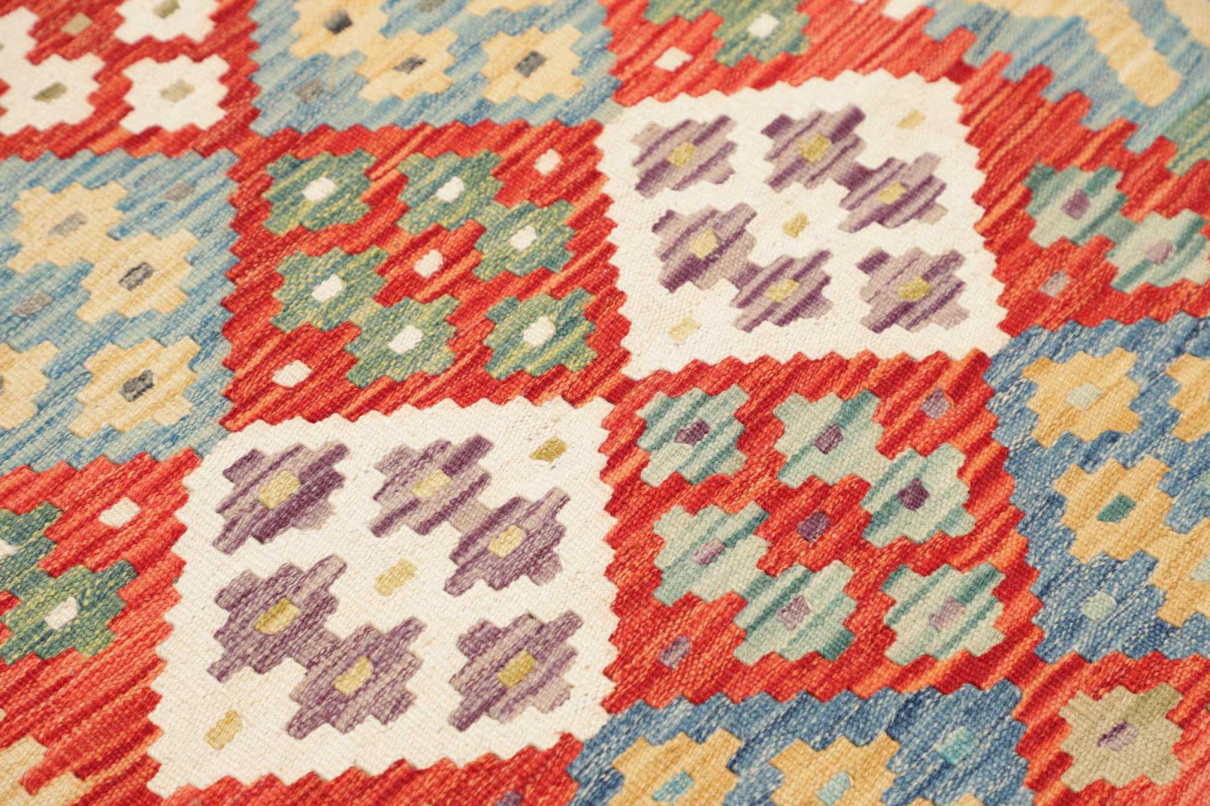 Questo kilim - afghano tessuto a mano è bello sia per i suoi colori e sia per il modello tipico. È stato tessuto a mano in Afghanistan con il 100% di lana. È anche robusto e durevole. Un vero e proprio profitto per voi e per la vostra casa.