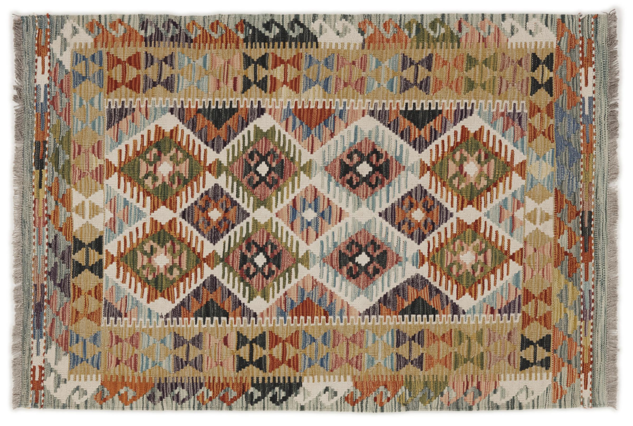 Questo kilim - afghano tessuto a mano è bello sia per i suoi colori e sia per il modello tipico. È stato tessuto a mano in Afghanistan con il 100% di lana. È anche robusto e durevole. Un vero e proprio profitto per voi e per la vostra casa.