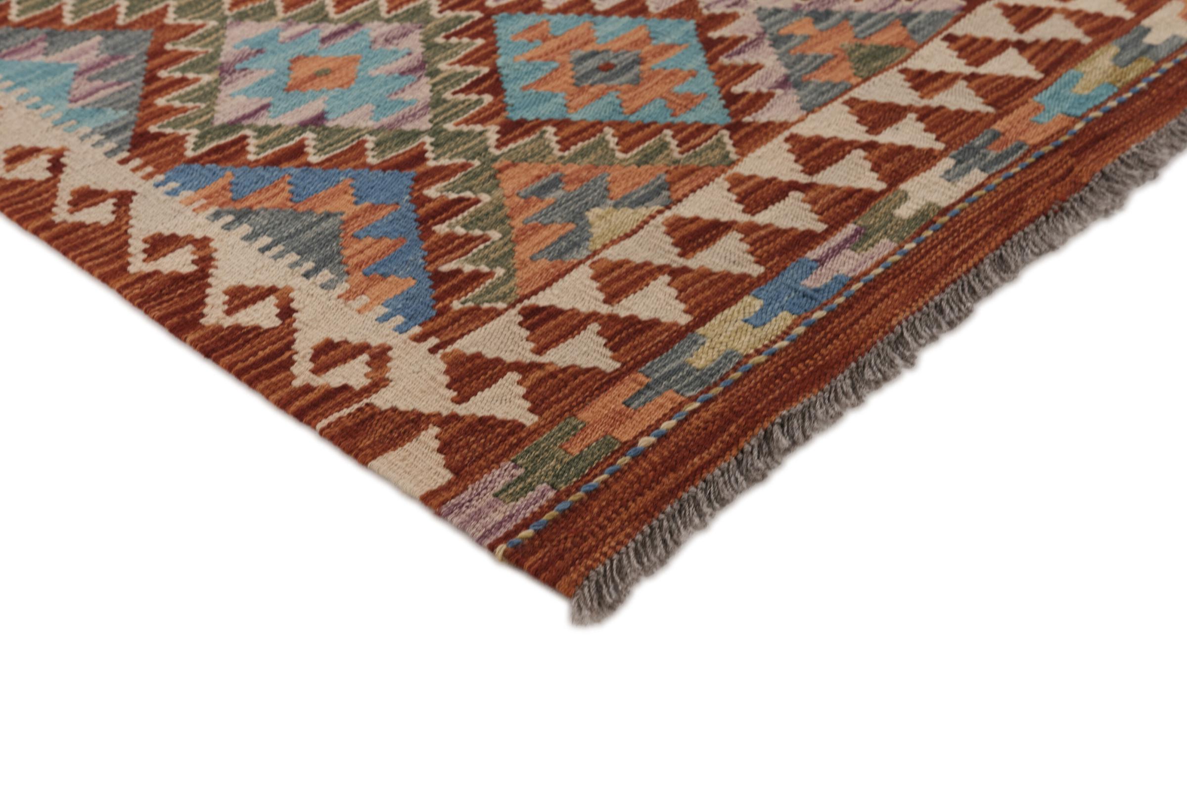 Questo kilim - afghano tessuto a mano è bello sia per i suoi colori e sia per il modello tipico. È stato tessuto a mano in Afghanistan con il 100% di lana. È anche robusto e durevole. Un vero e proprio profitto per voi e per la vostra casa.