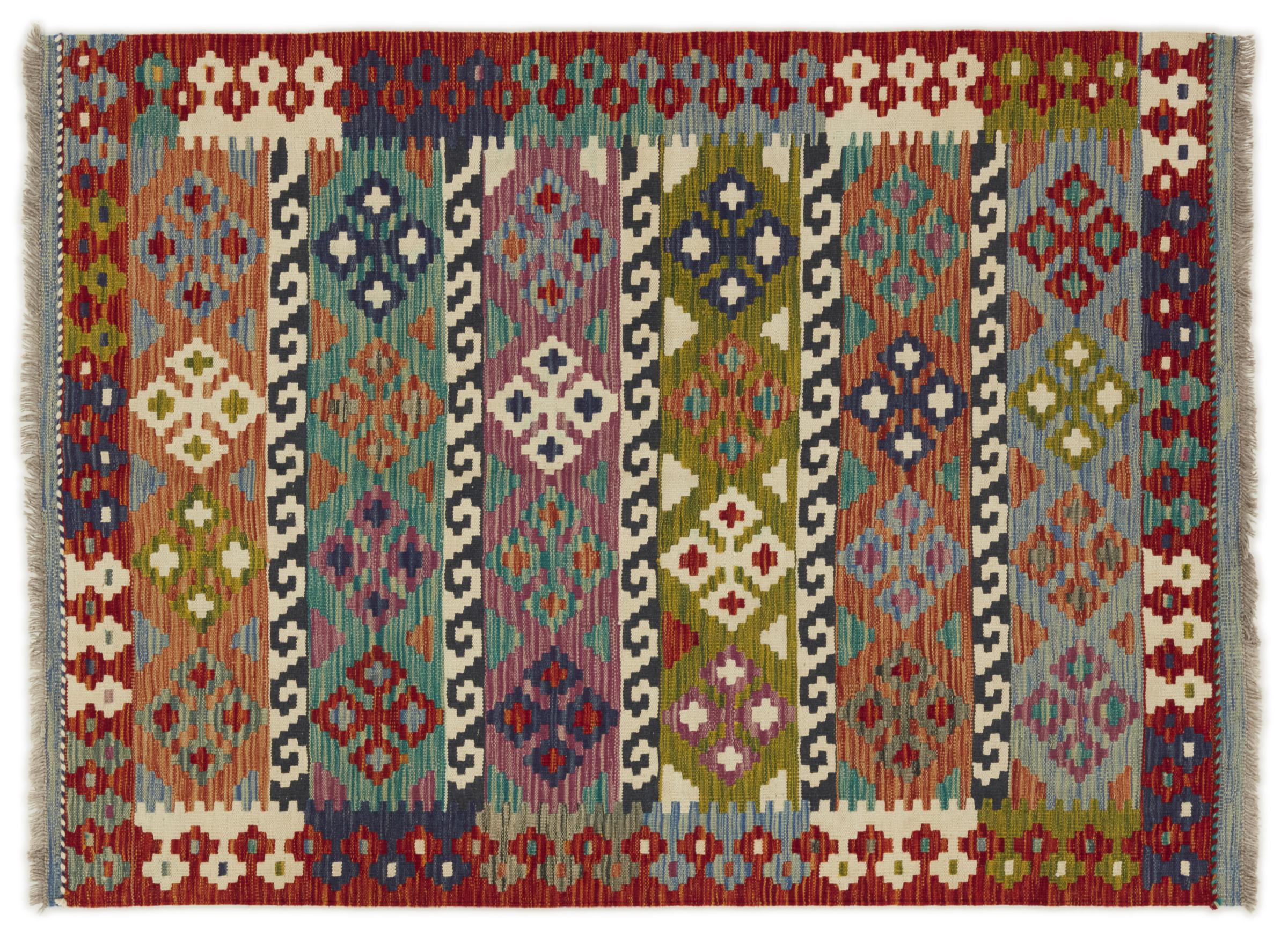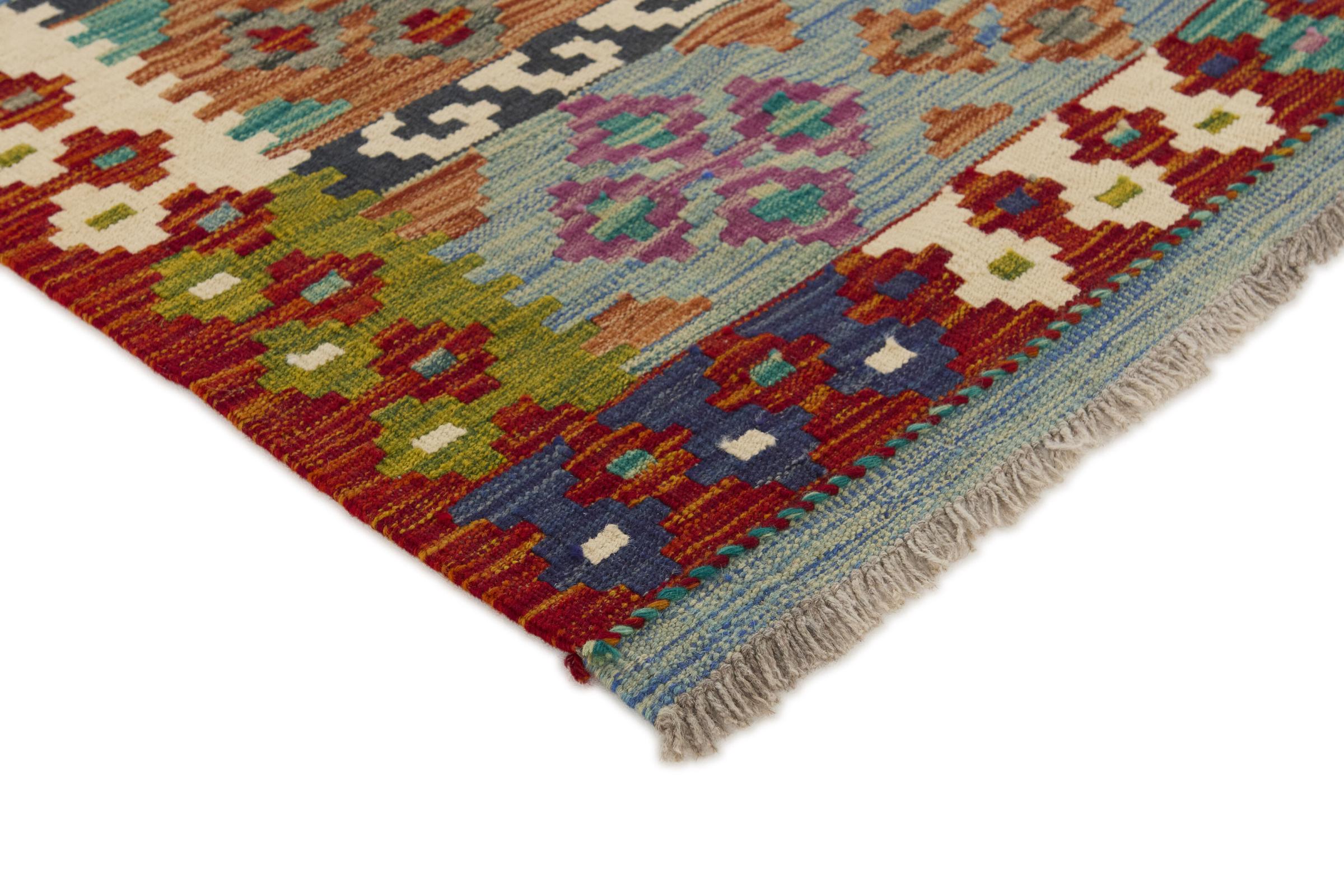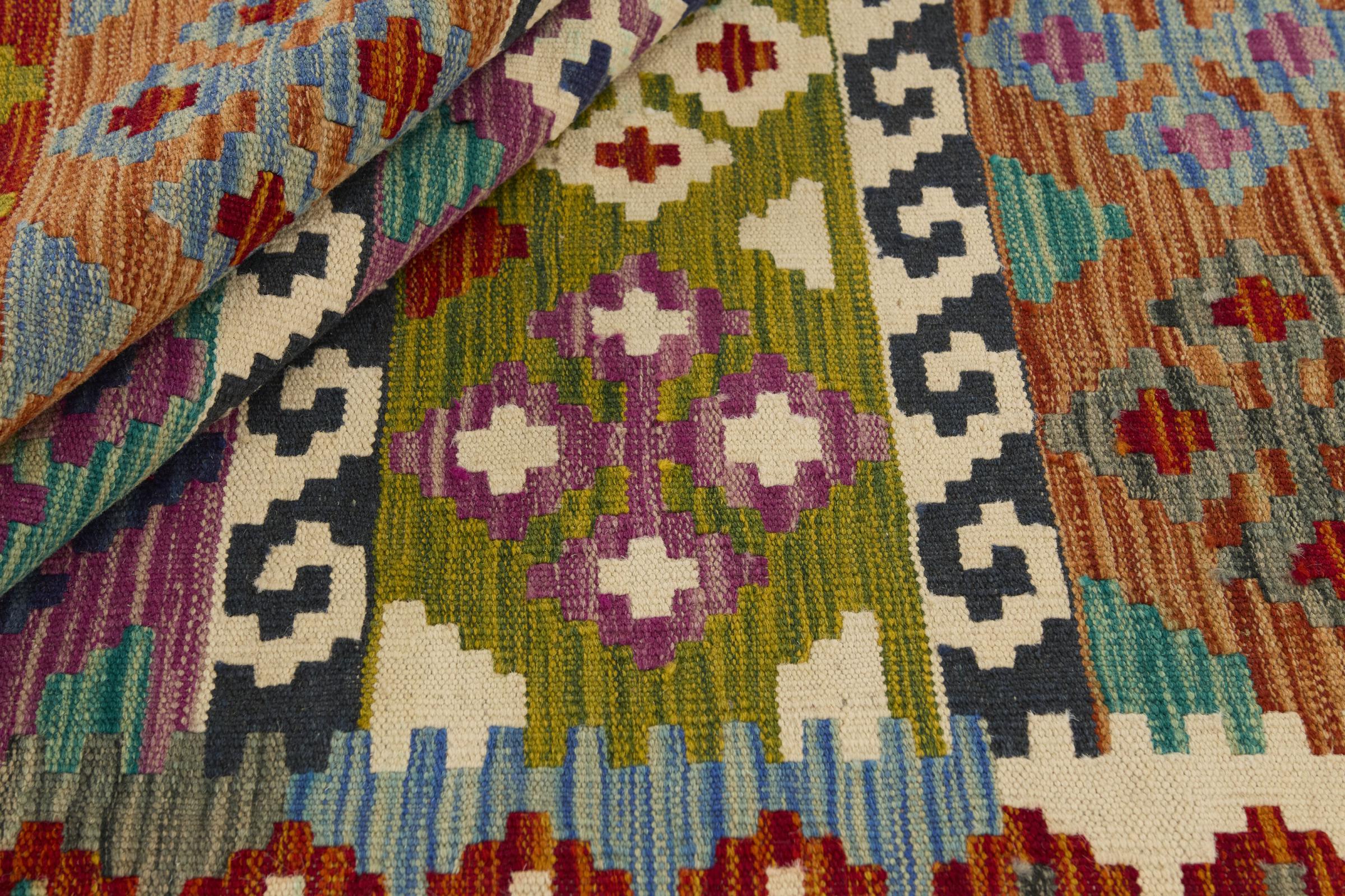 Questo kilim - afghano tessuto a mano è bello sia per i suoi colori e sia per il modello tipico. È stato tessuto a mano in Afghanistan con il 100% di lana. È anche robusto e durevole. Un vero e proprio profitto per voi e per la vostra casa.