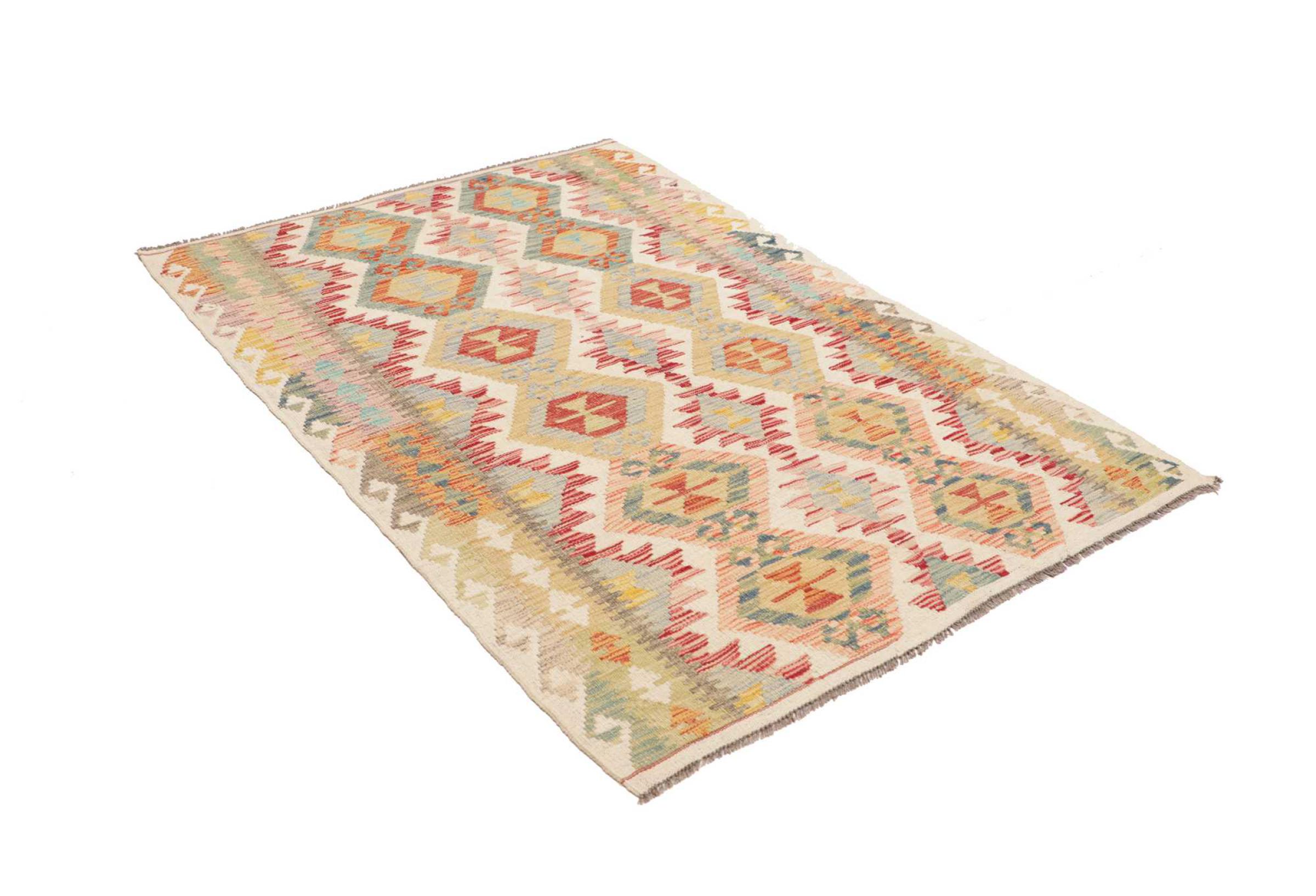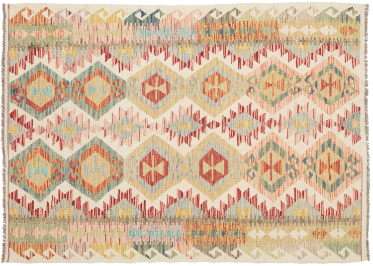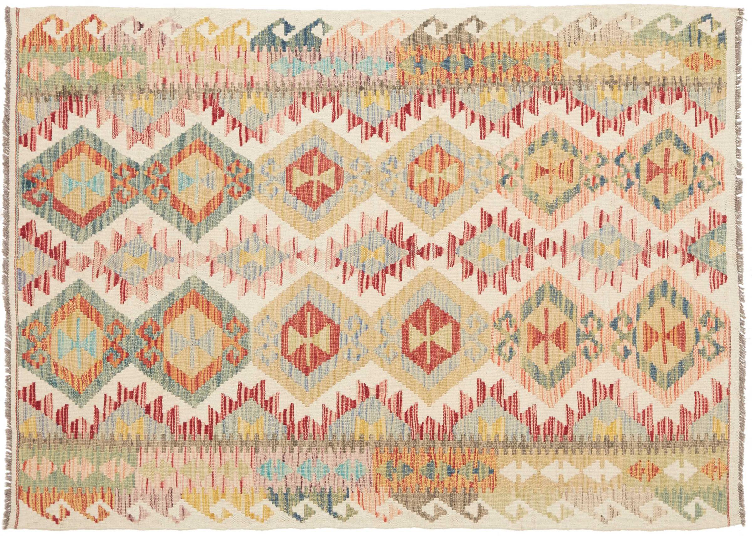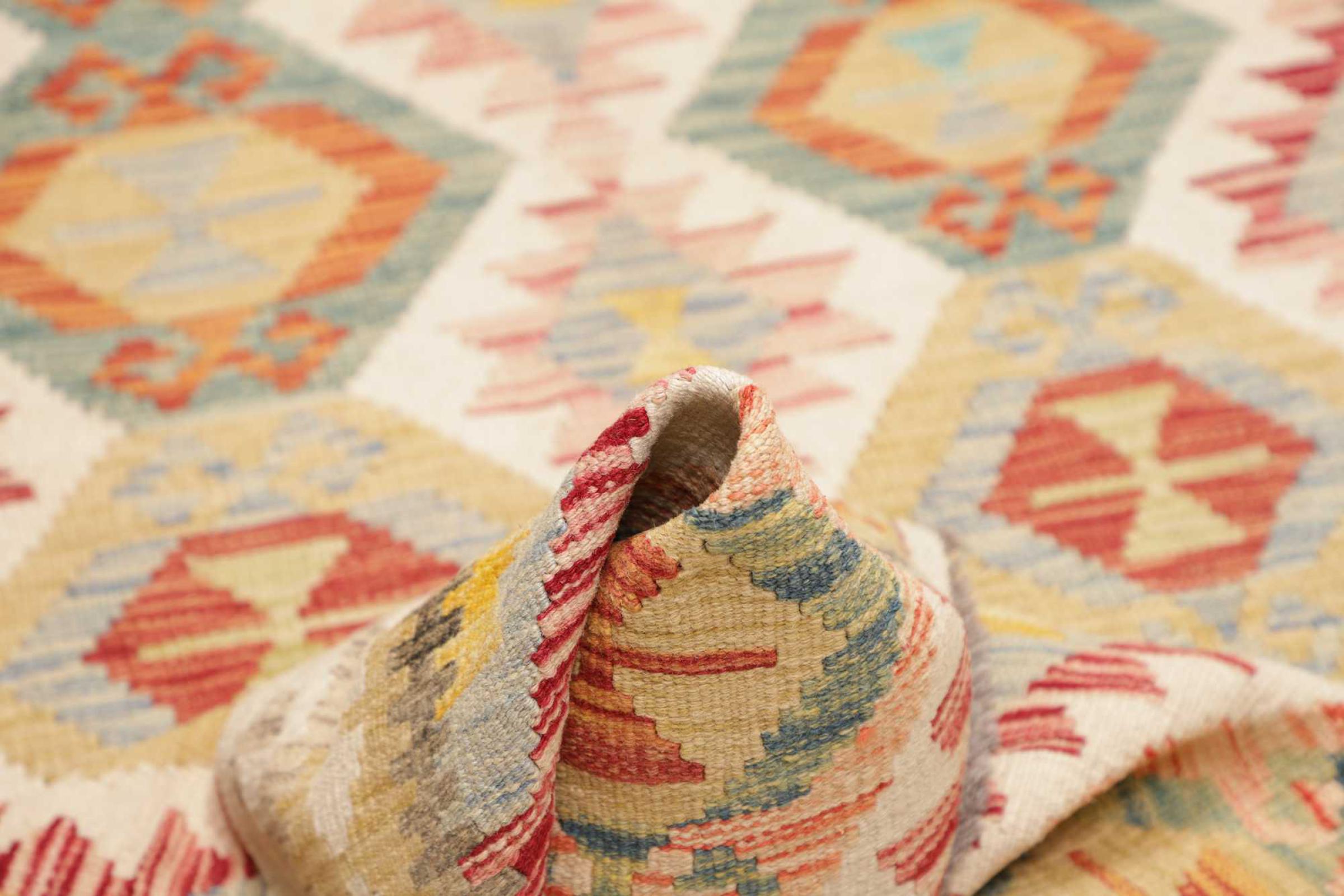 Questo kilim - afghano tessuto a mano è bello sia per i suoi colori e sia per il modello tipico. È stato tessuto a mano in Afghanistan con il 100% di lana. È anche robusto e durevole. Un vero e proprio profitto per voi e per la vostra casa.