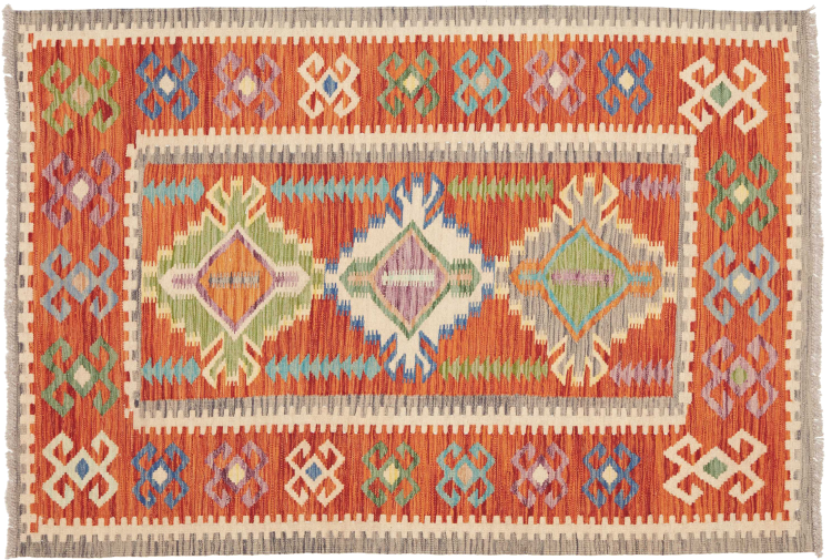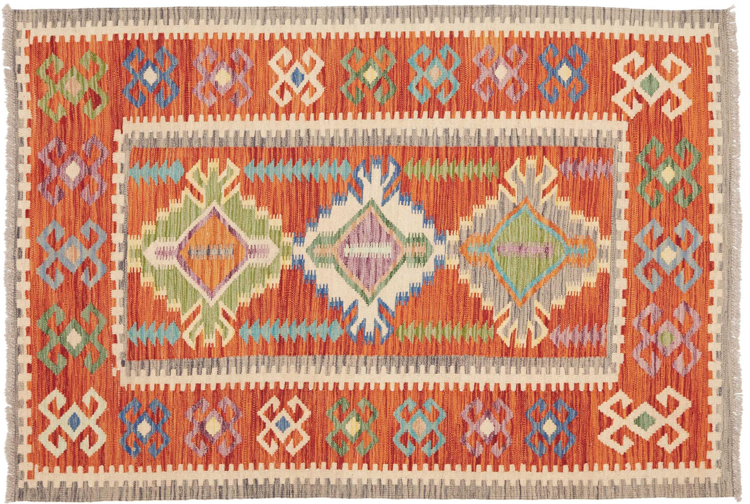 Questo kilim - afghano tessuto a mano è bello sia per i suoi colori e sia per il modello tipico. È stato tessuto a mano in Afghanistan con il 100% di lana. È anche robusto e durevole. Un vero e proprio profitto per voi e per la vostra casa.