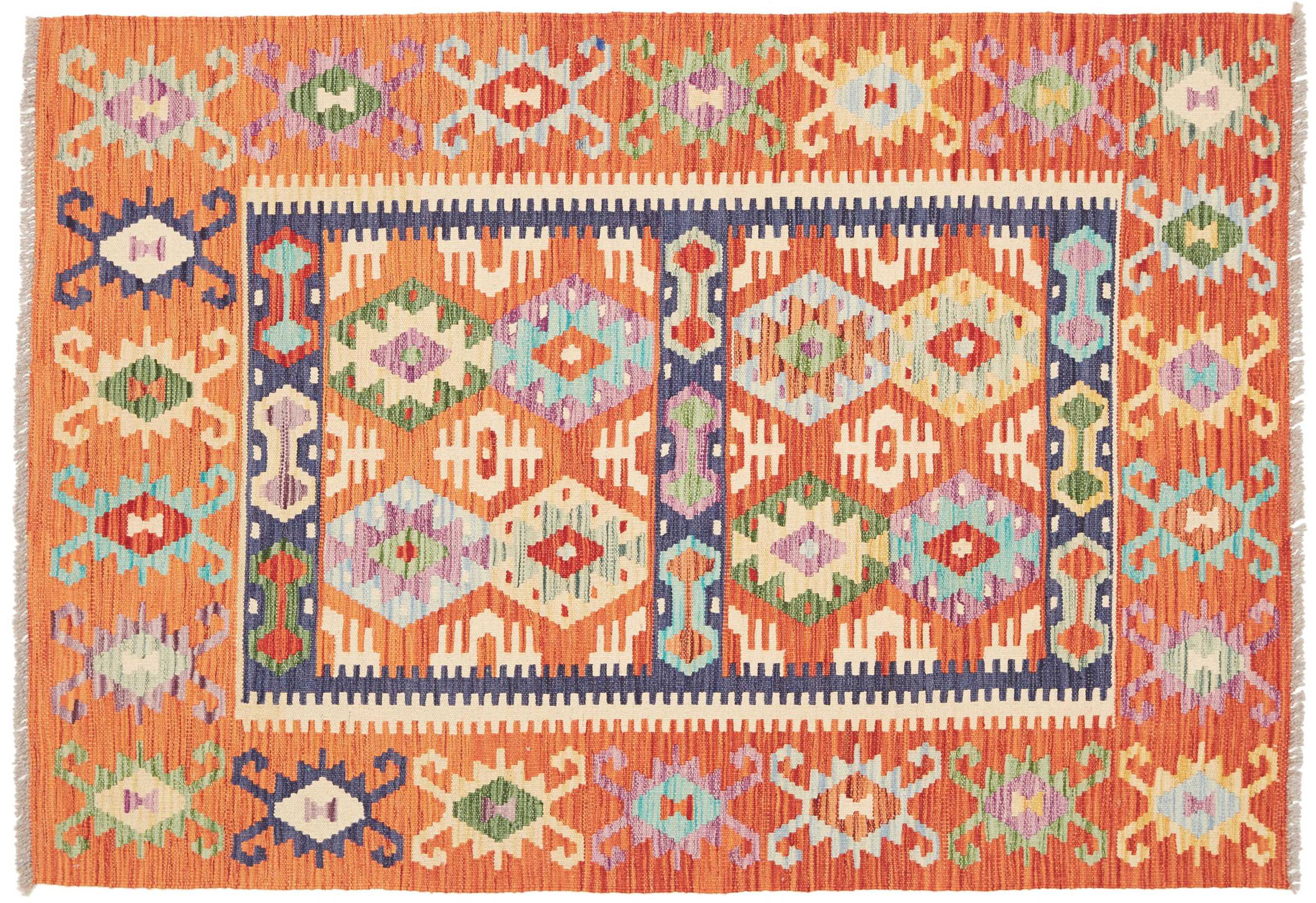 Questo kilim - afghano tessuto a mano è bello sia per i suoi colori e sia per il modello tipico. È stato tessuto a mano in Afghanistan con il 100% di lana. È anche robusto e durevole. Un vero e proprio profitto per voi e per la vostra casa.