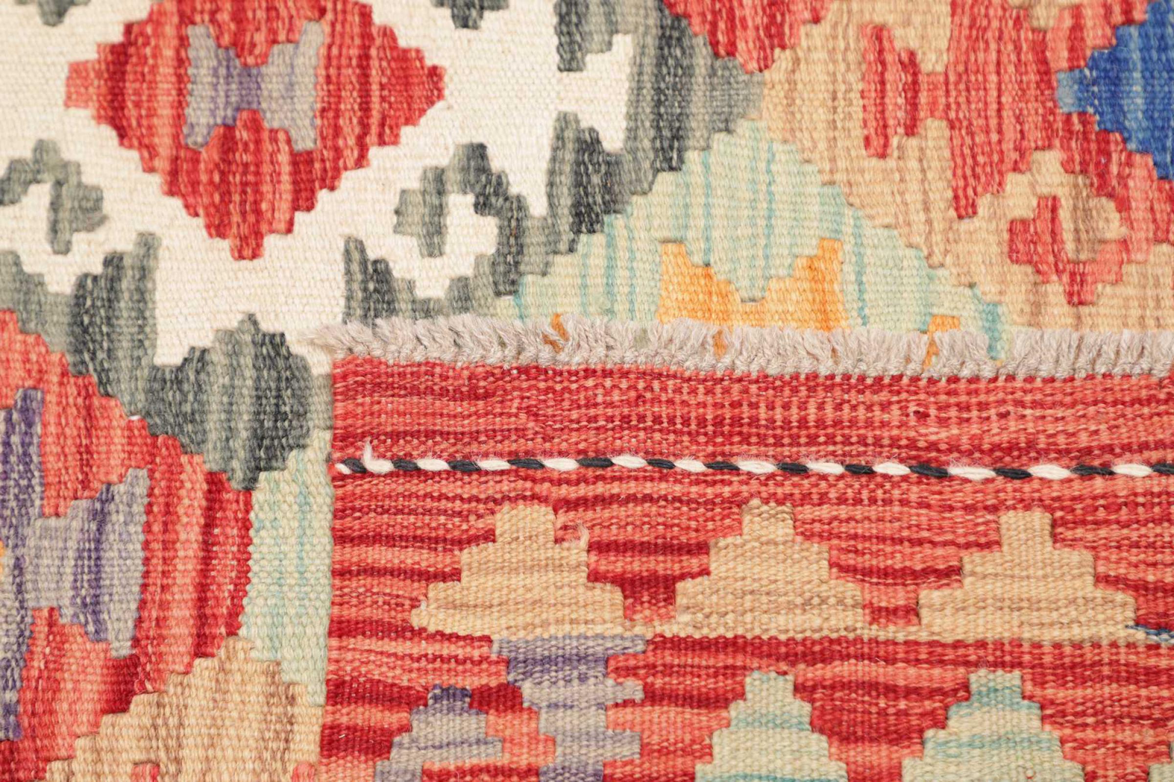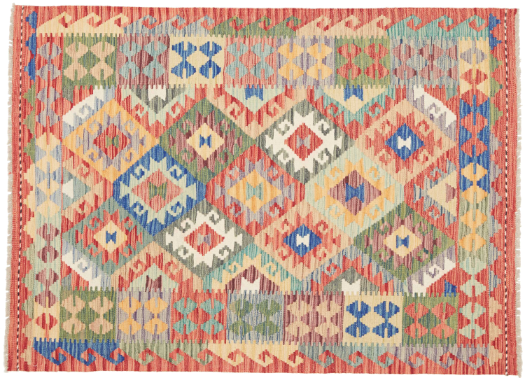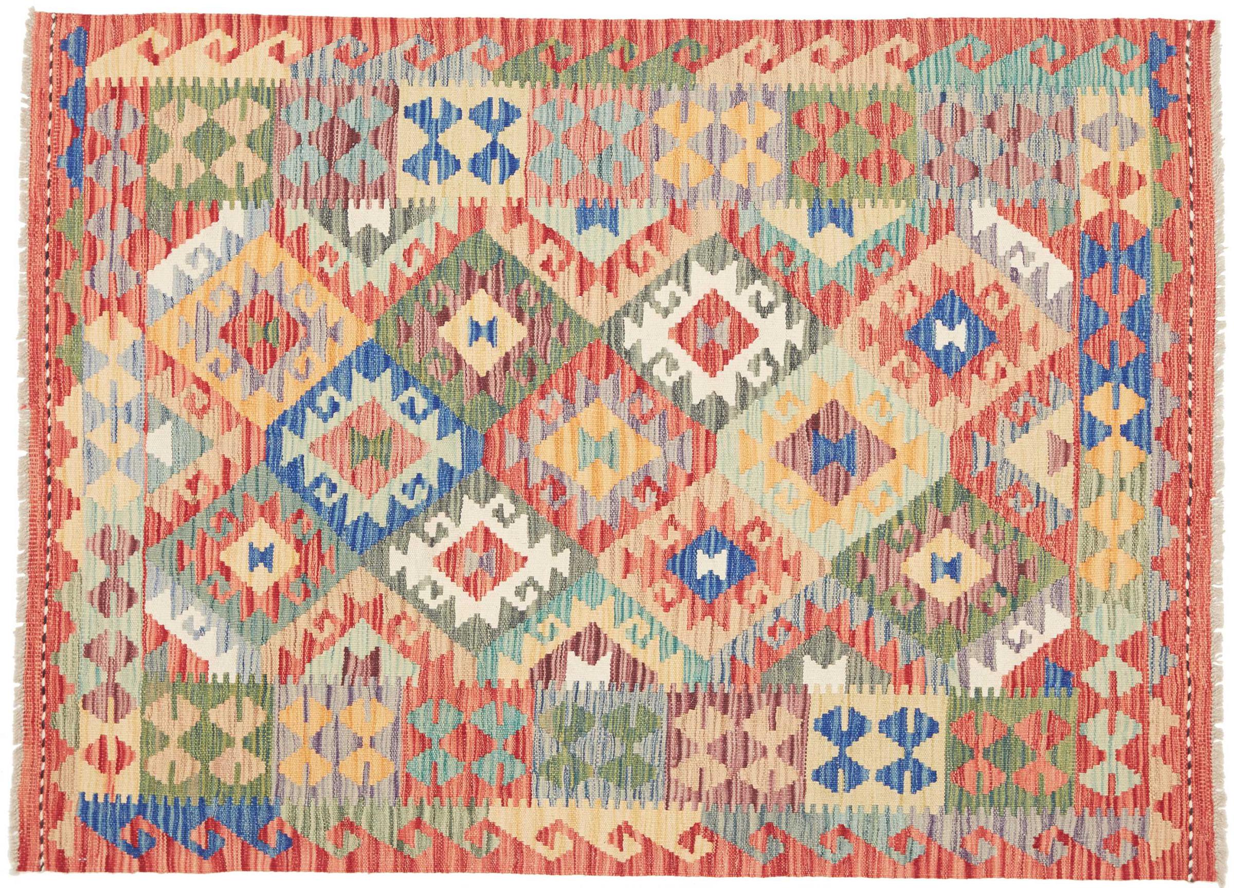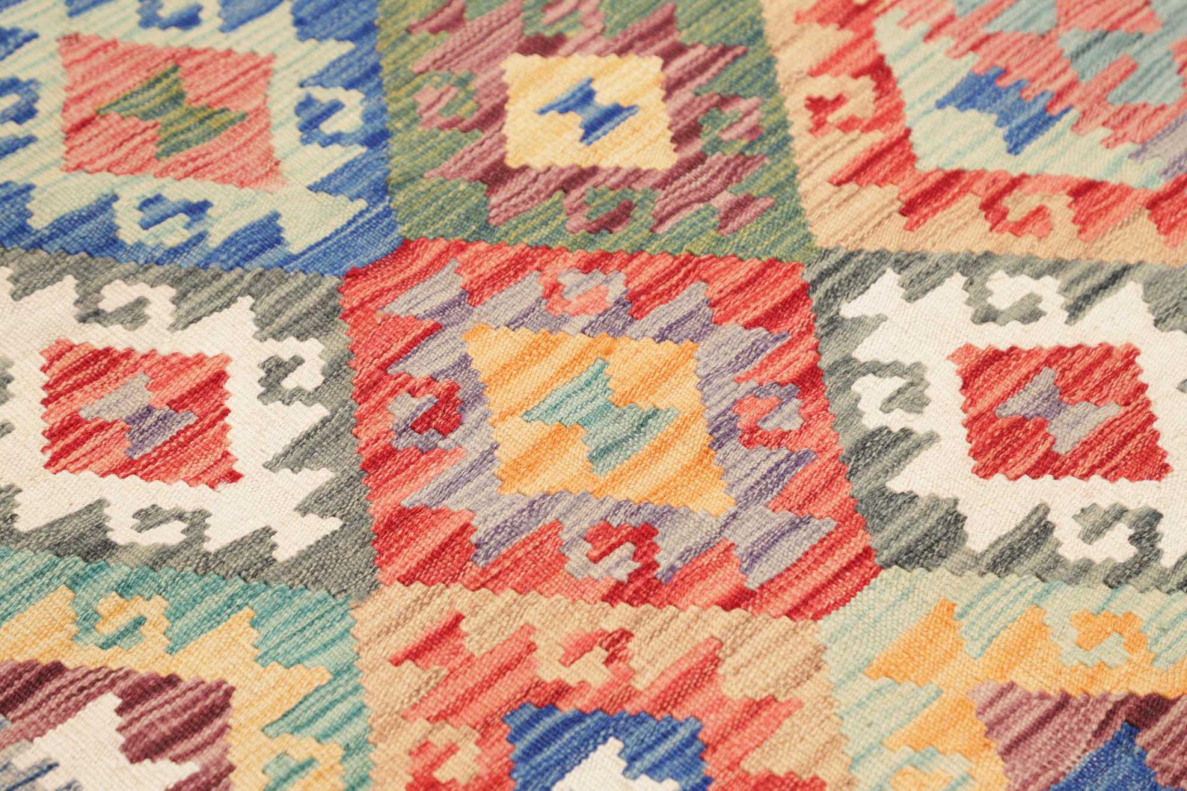 Questo kilim - afghano tessuto a mano è bello sia per i suoi colori e sia per il modello tipico. È stato tessuto a mano in Afghanistan con il 100% di lana. È anche robusto e durevole. Un vero e proprio profitto per voi e per la vostra casa.