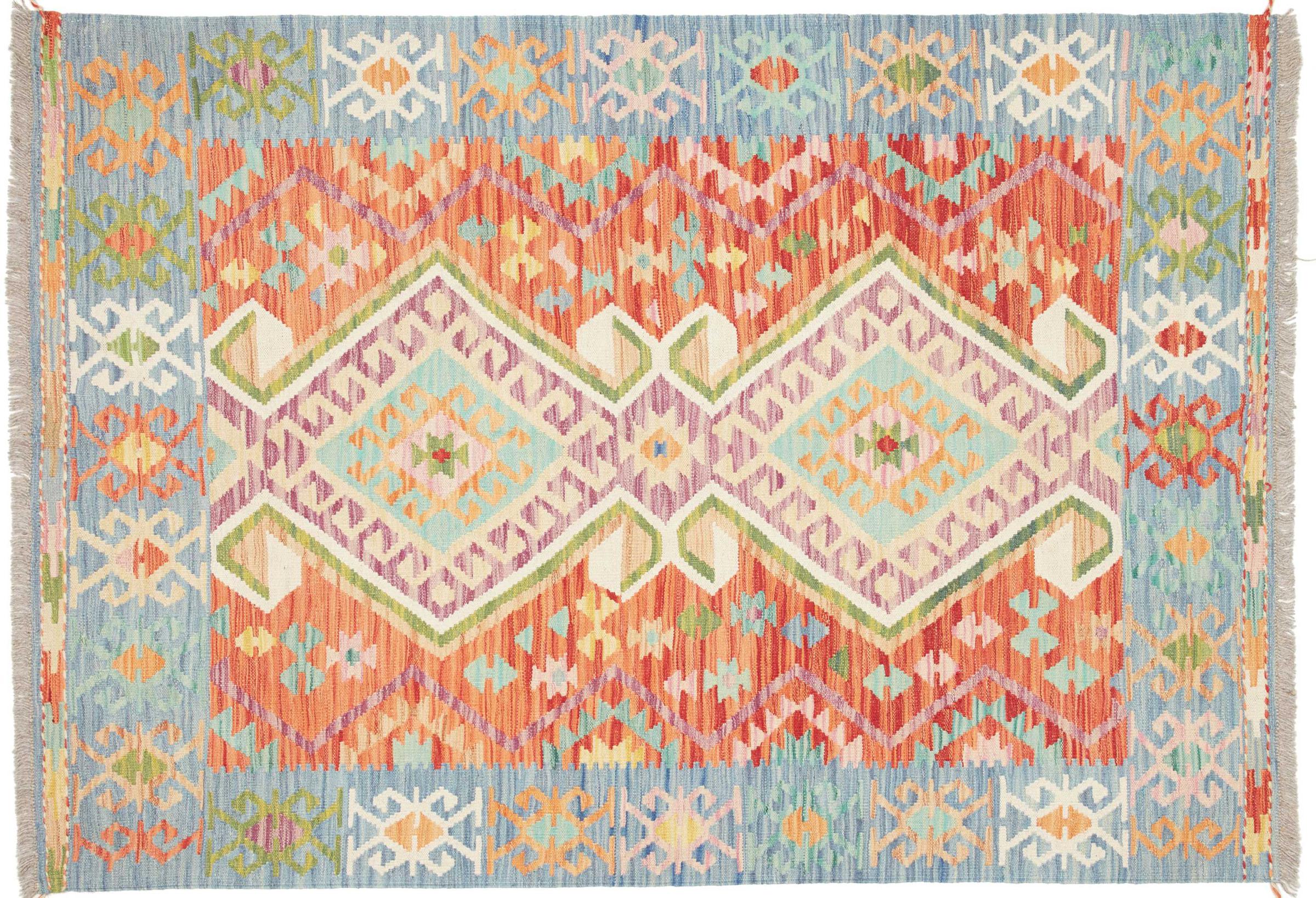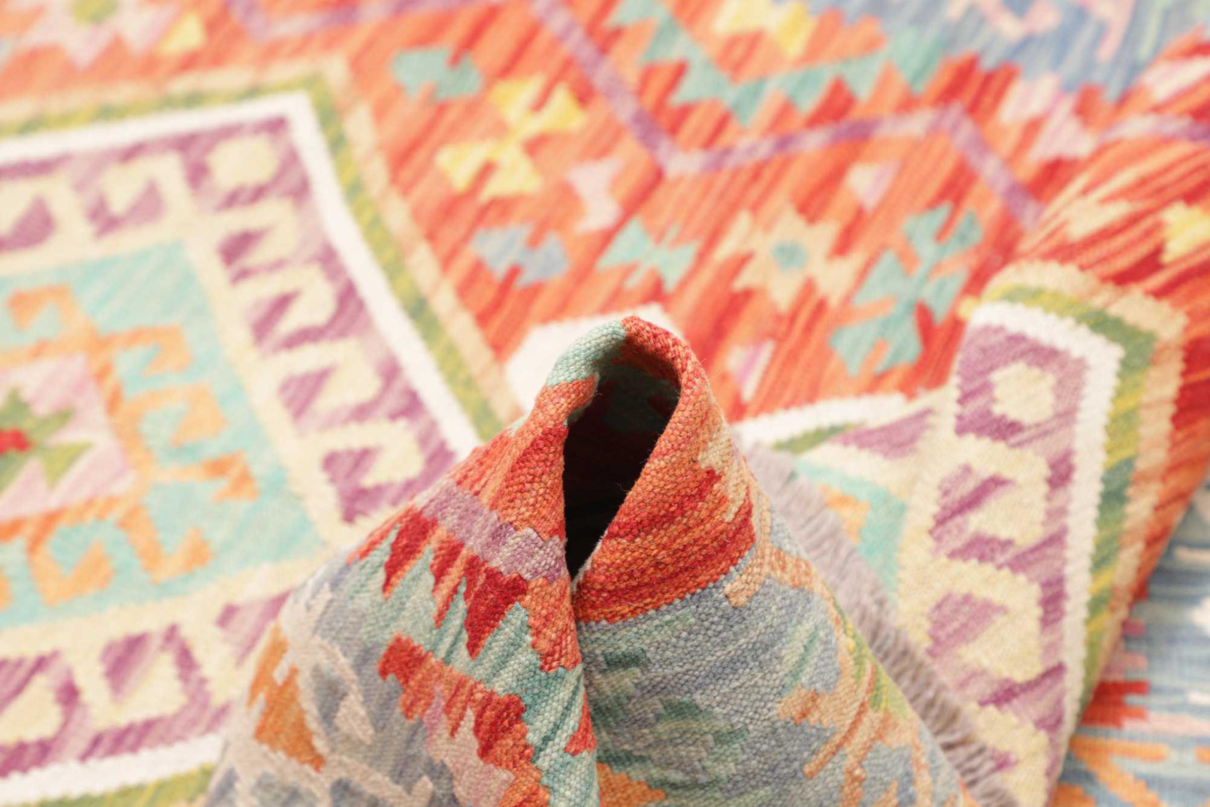 Questo kilim - afghano tessuto a mano è bello sia per i suoi colori e sia per il modello tipico. È stato tessuto a mano in Afghanistan con il 100% di lana. È anche robusto e durevole. Un vero e proprio profitto per voi e per la vostra casa.
