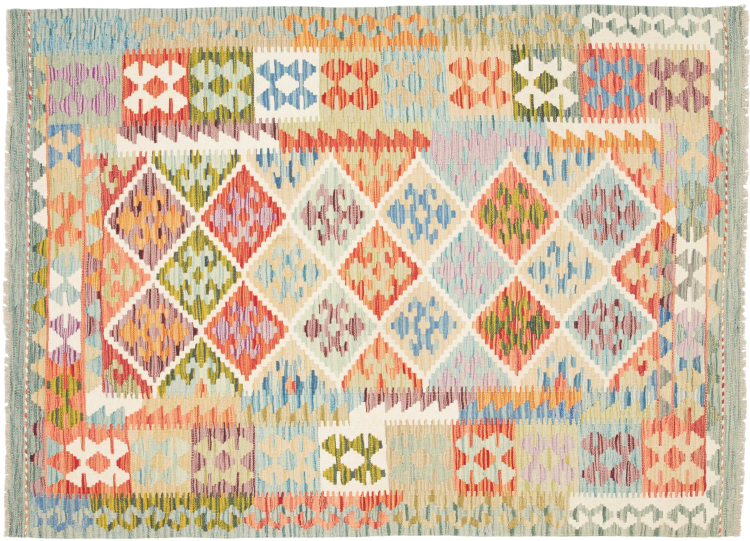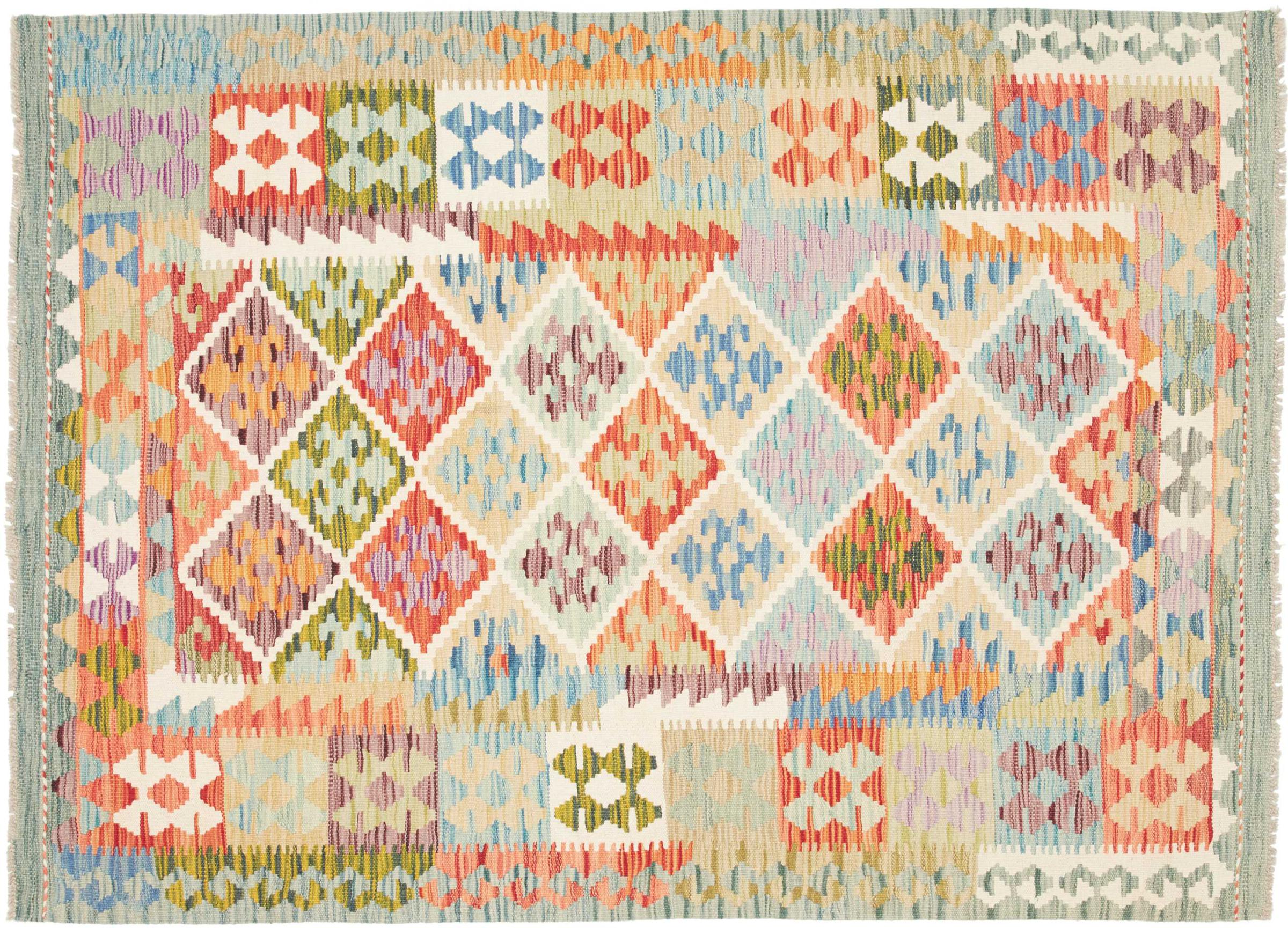 Questo kilim - afghano tessuto a mano è bello sia per i suoi colori e sia per il modello tipico. È stato tessuto a mano in Afghanistan con il 100% di lana. È anche robusto e durevole. Un vero e proprio profitto per voi e per la vostra casa.