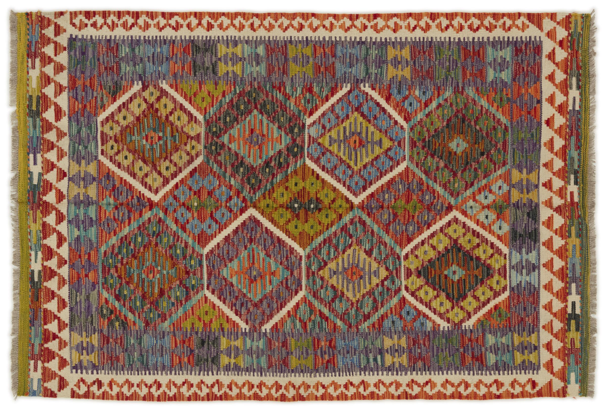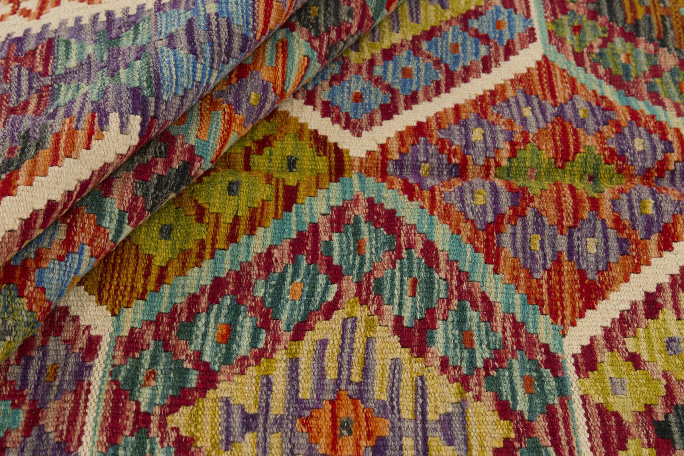 Questo kilim - afghano tessuto a mano è bello sia per i suoi colori e sia per il modello tipico. È stato tessuto a mano in Afghanistan con il 100% di lana. È anche robusto e durevole. Un vero e proprio profitto per voi e per la vostra casa.