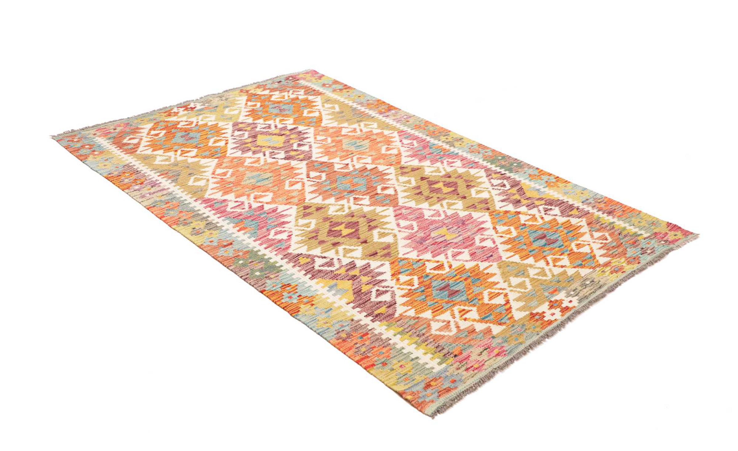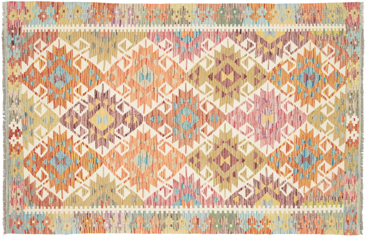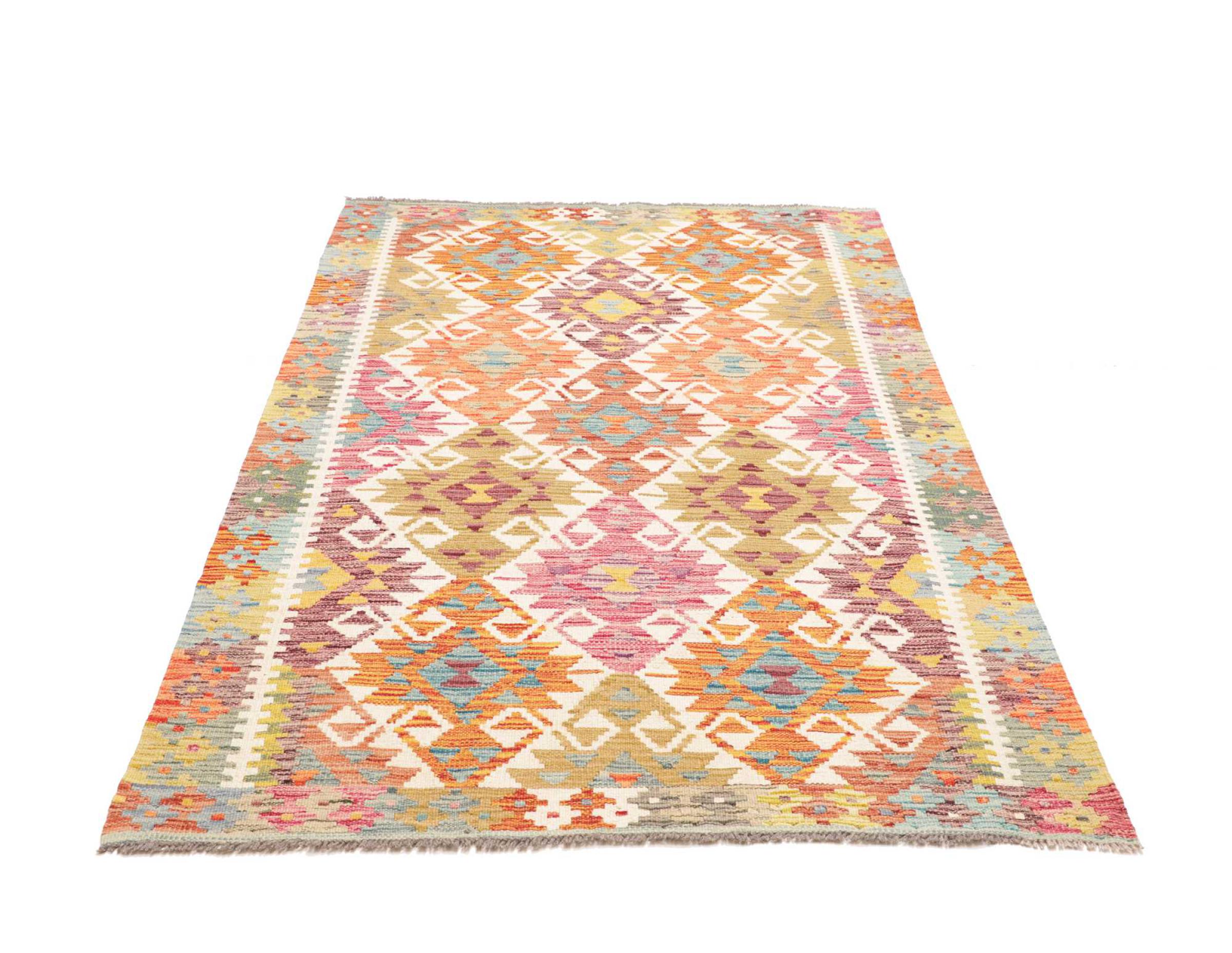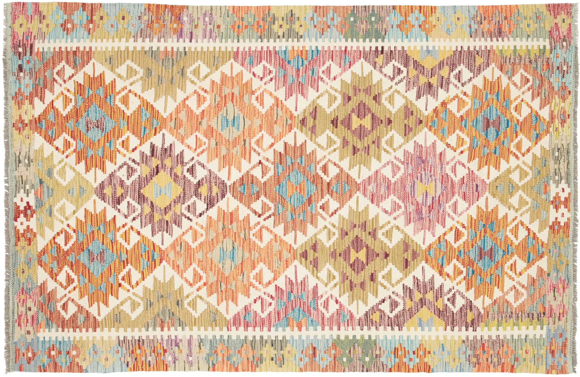 Questo kilim - afghano tessuto a mano è bello sia per i suoi colori e sia per il modello tipico. È stato tessuto a mano in Afghanistan con il 100% di lana. È anche robusto e durevole. Un vero e proprio profitto per voi e per la vostra casa.
