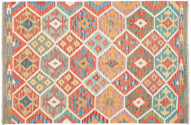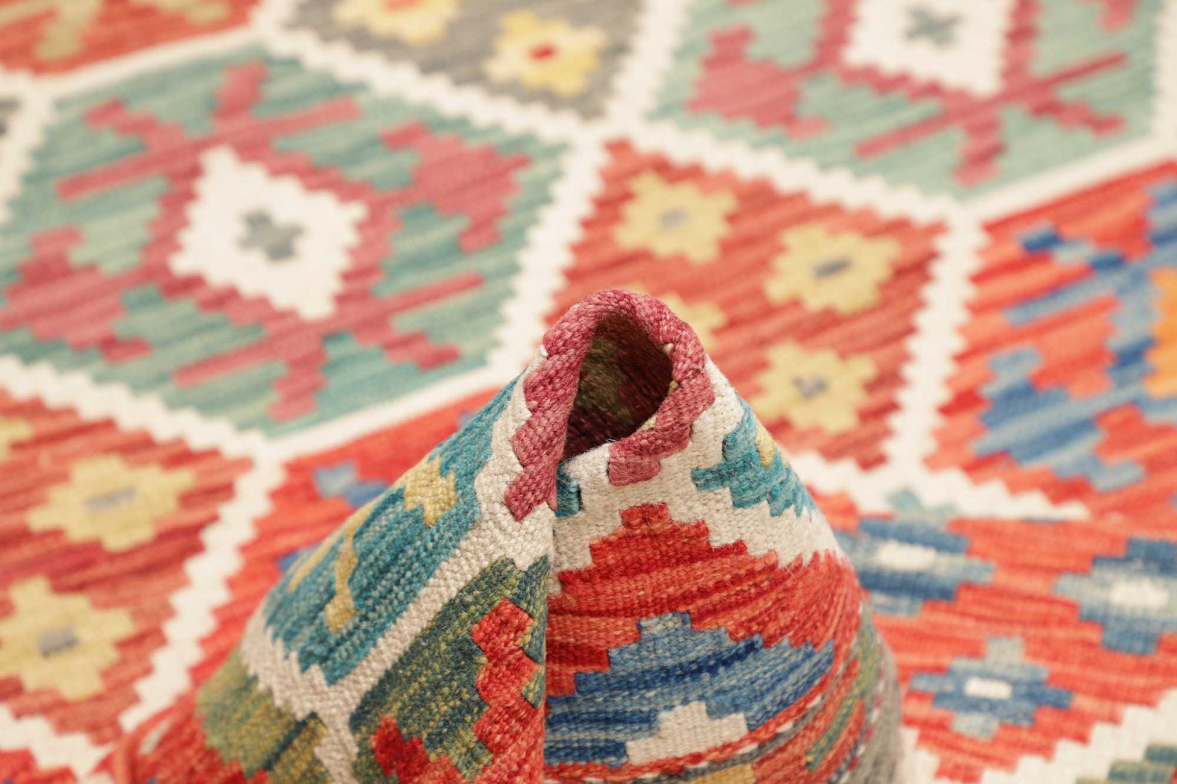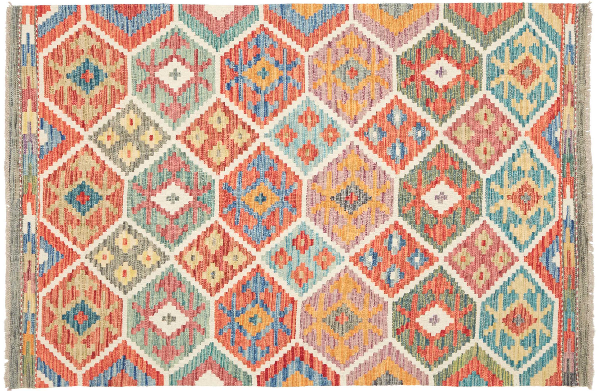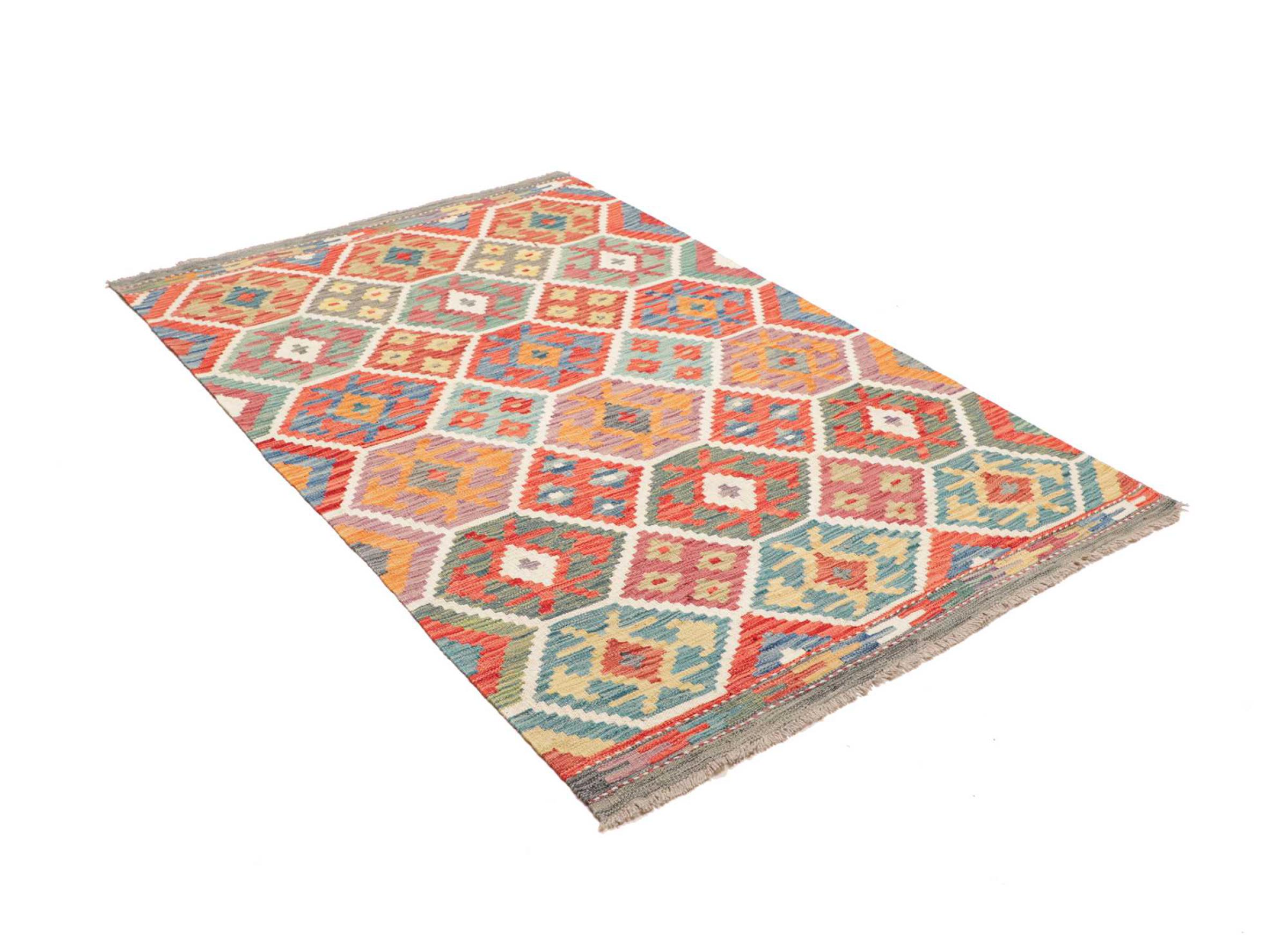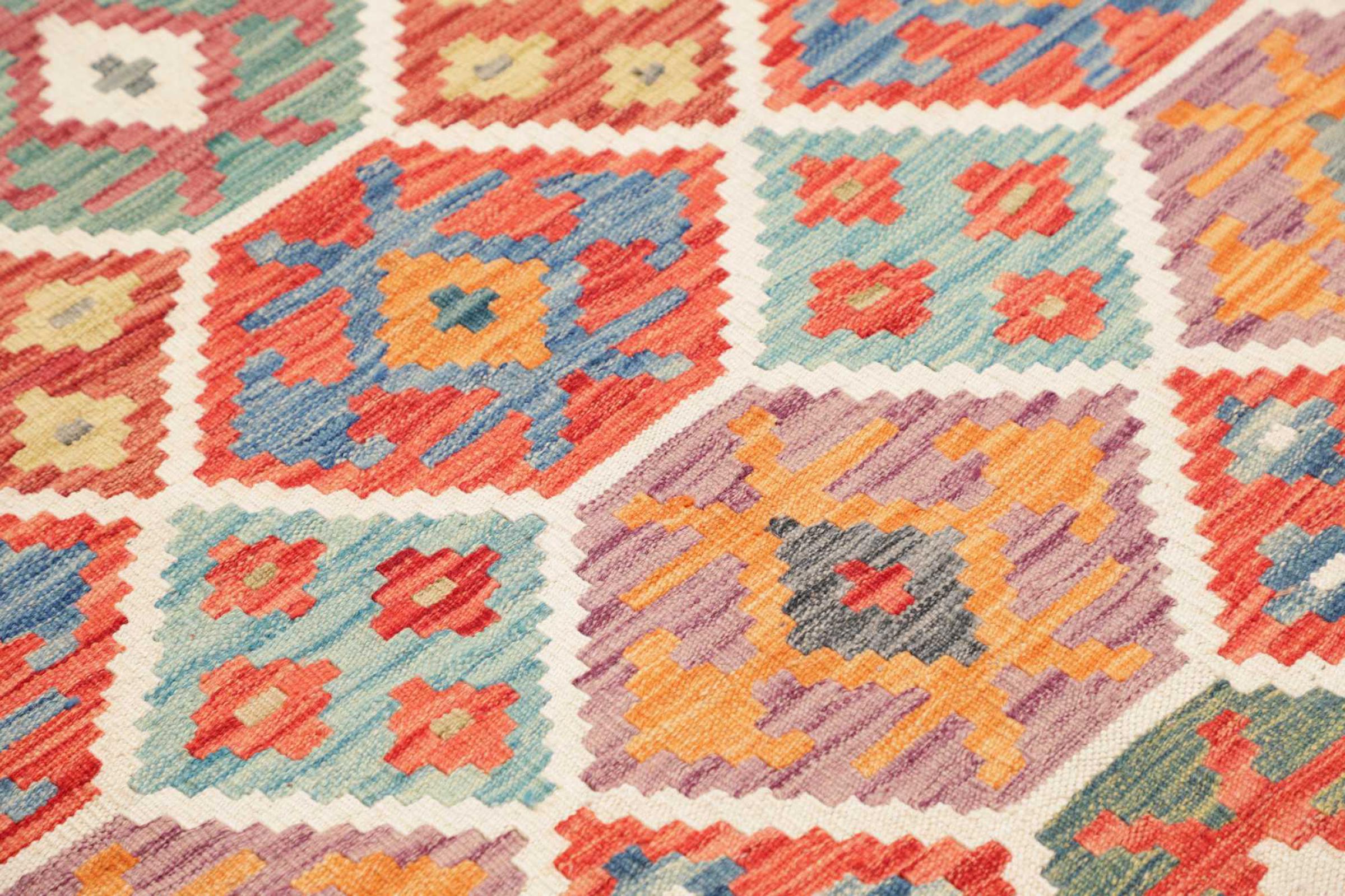 Questo kilim - afghano tessuto a mano è bello sia per i suoi colori e sia per il modello tipico. È stato tessuto a mano in Afghanistan con il 100% di lana. È anche robusto e durevole. Un vero e proprio profitto per voi e per la vostra casa.