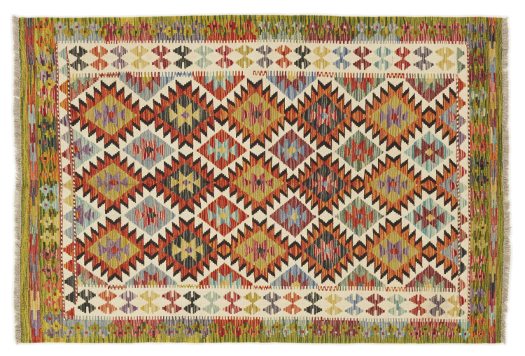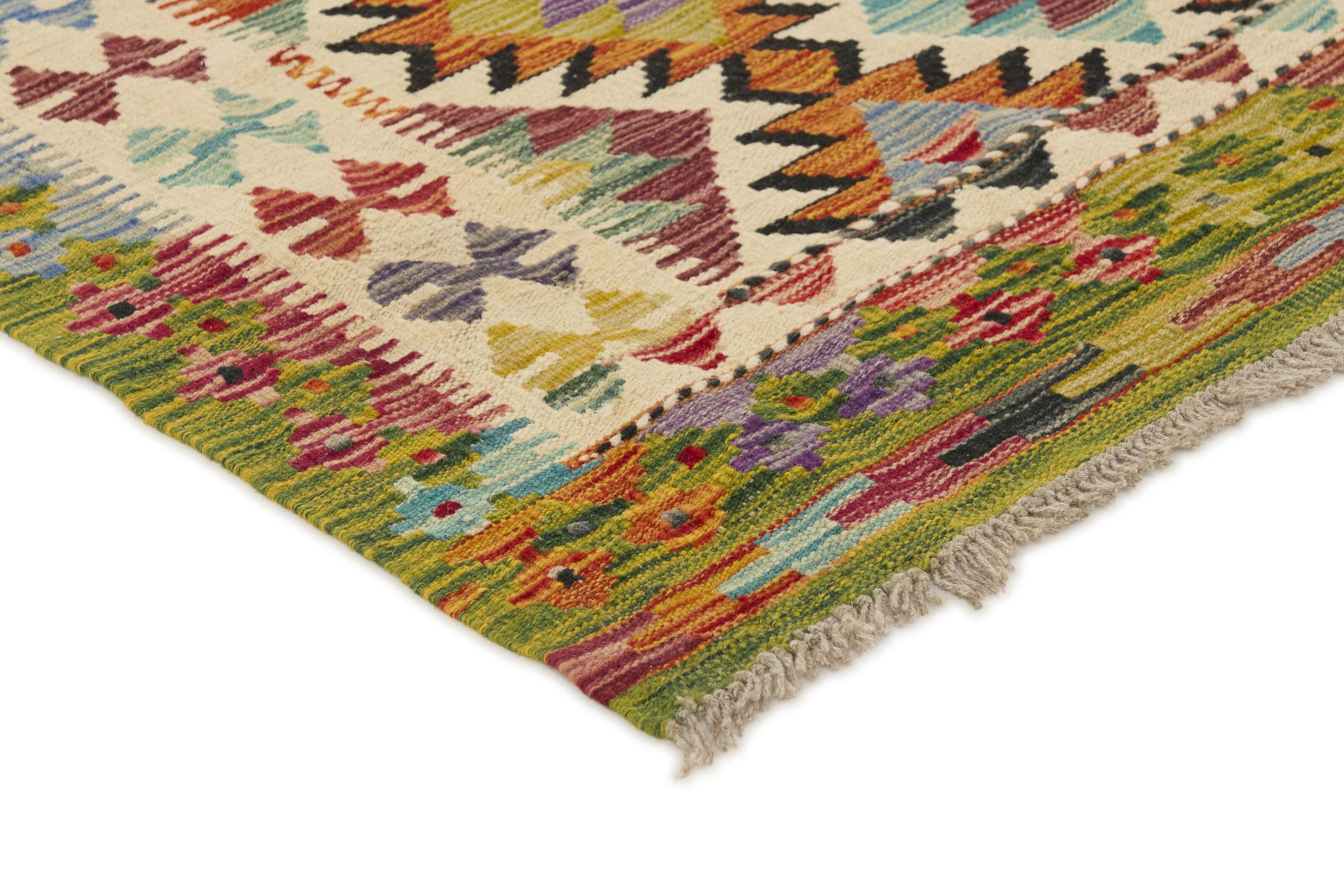 Questo kilim - afghano tessuto a mano è bello sia per i suoi colori e sia per il modello tipico. È stato tessuto a mano in Afghanistan con il 100% di lana. È anche robusto e durevole. Un vero e proprio profitto per voi e per la vostra casa.