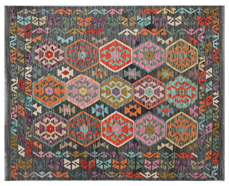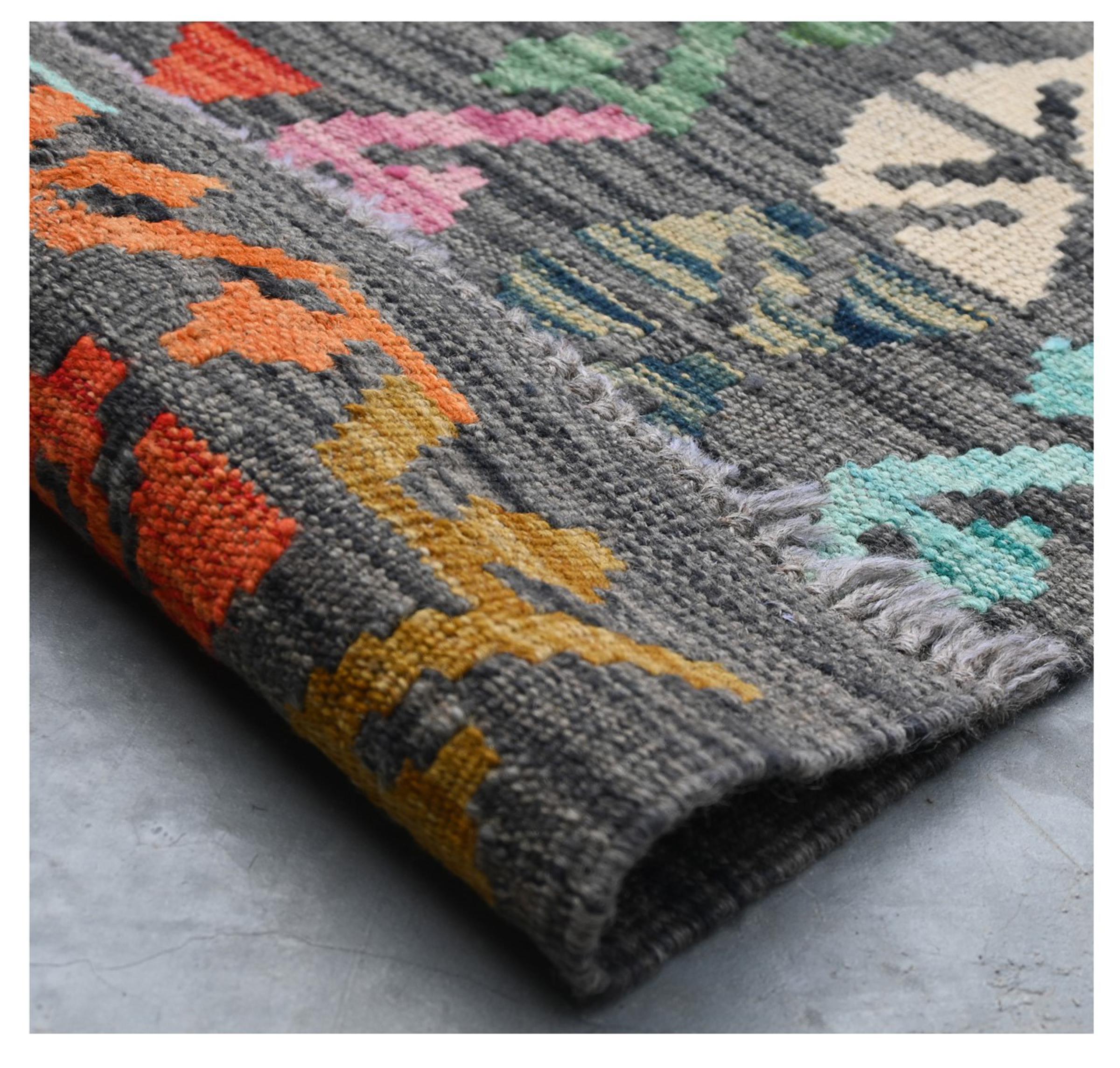 Questo kilim - afghano tessuto a mano è bello sia per i suoi colori e sia per il modello tipico. È stato tessuto a mano in Afghanistan con il 100% di lana. È anche robusto e durevole. Un vero e proprio profitto per voi e per la vostra casa.