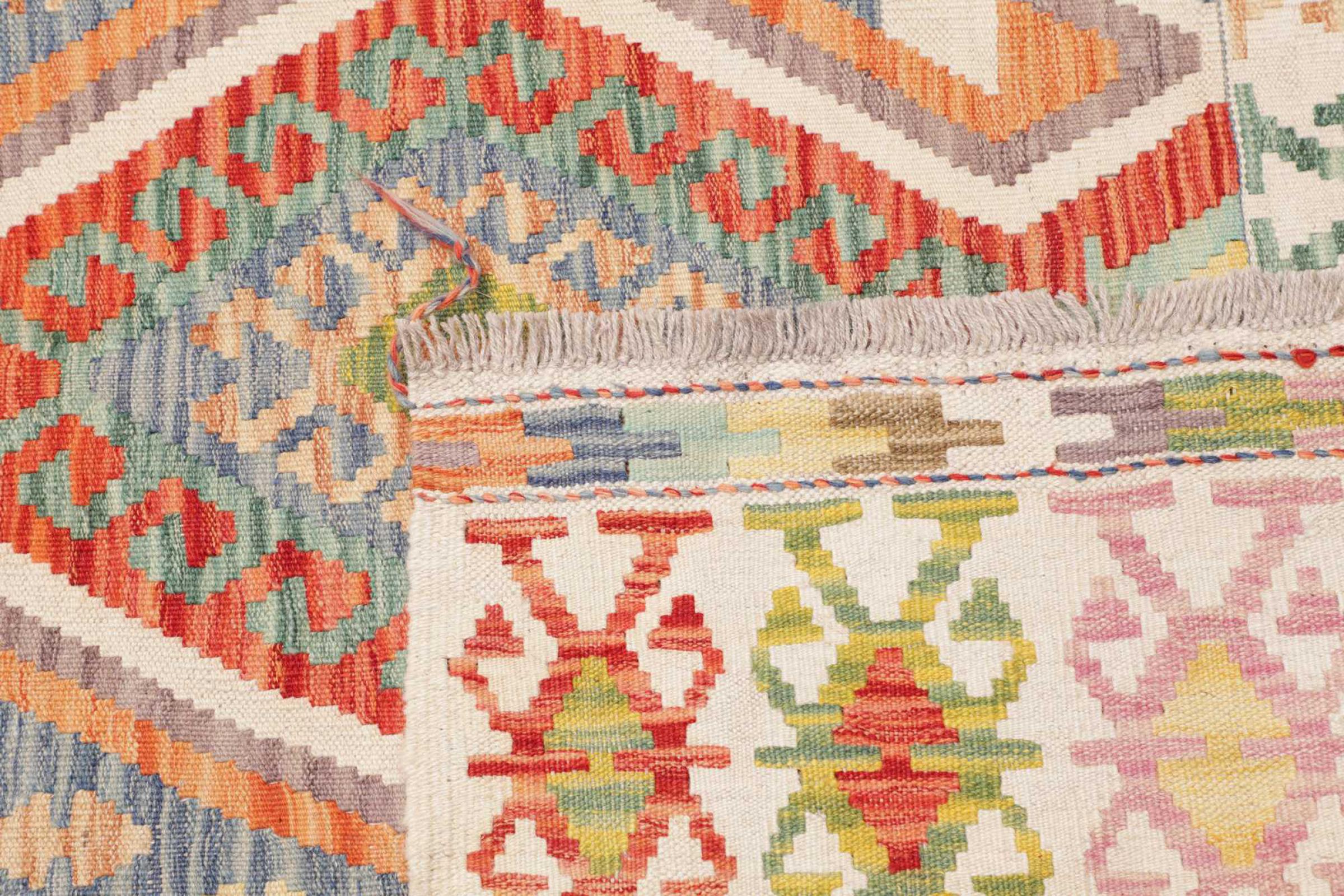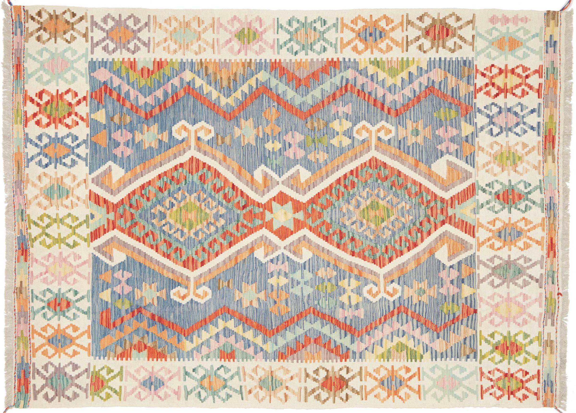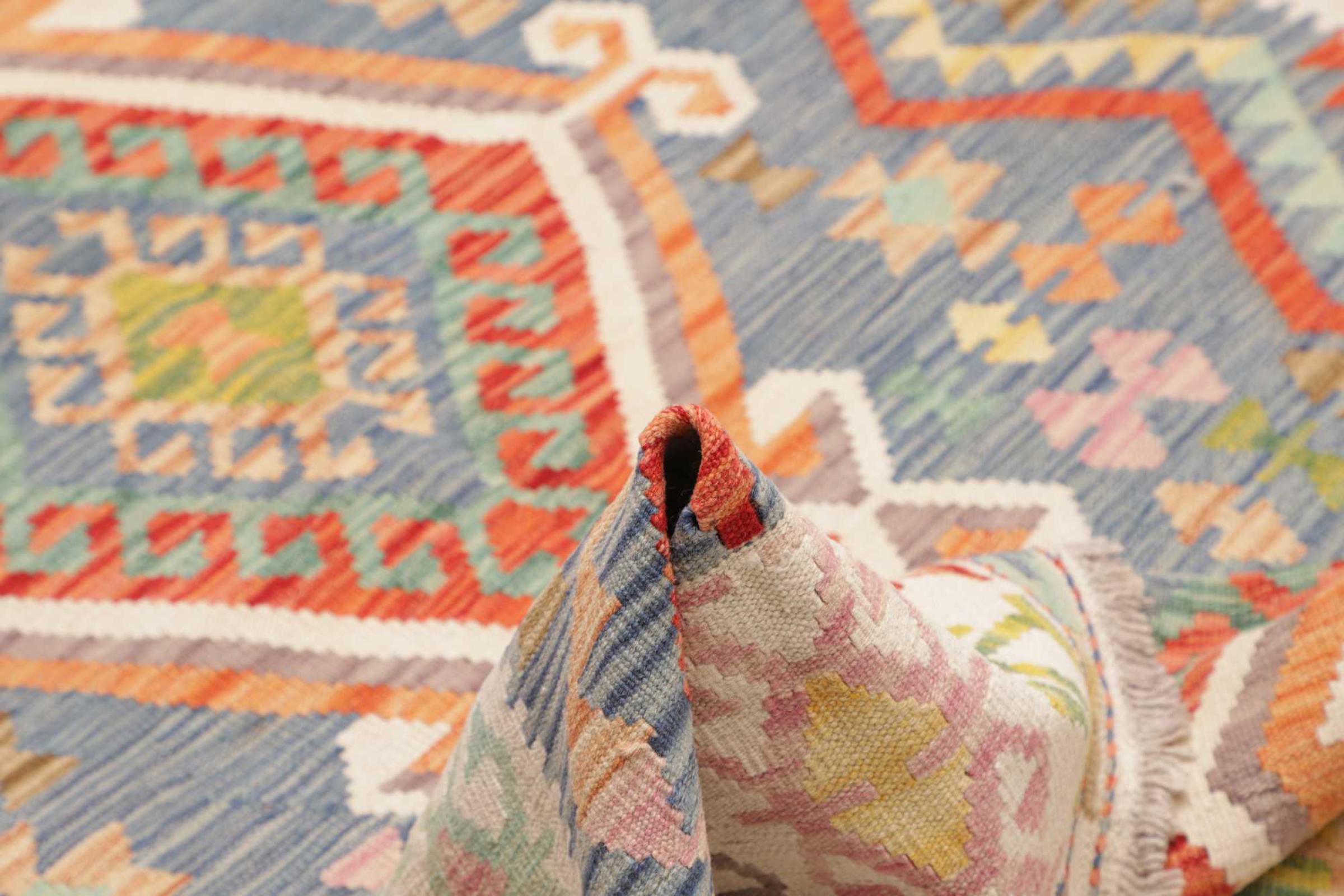 Questo kilim - afghano tessuto a mano è bello sia per i suoi colori e sia per il modello tipico. È stato tessuto a mano in Afghanistan con il 100% di lana. È anche robusto e durevole. Un vero e proprio profitto per voi e per la vostra casa.