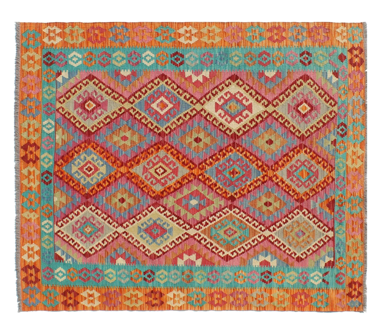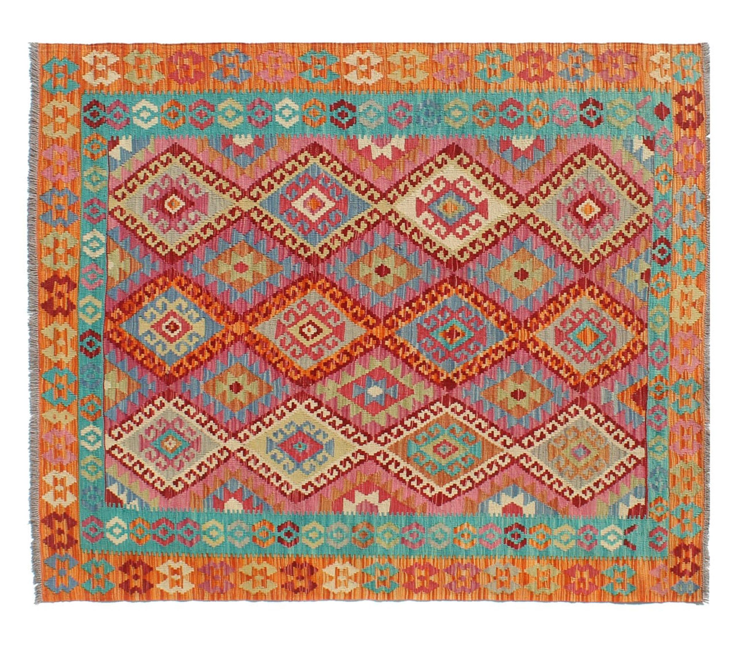 Questo kilim - afghano tessuto a mano è bello sia per i suoi colori e sia per il modello tipico. È stato tessuto a mano in Afghanistan con il 100% di lana. È anche robusto e durevole. Un vero e proprio profitto per voi e per la vostra casa.
