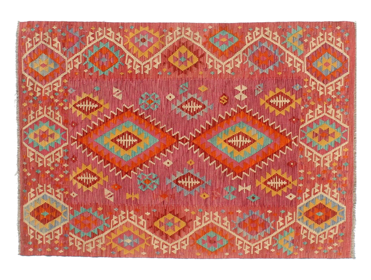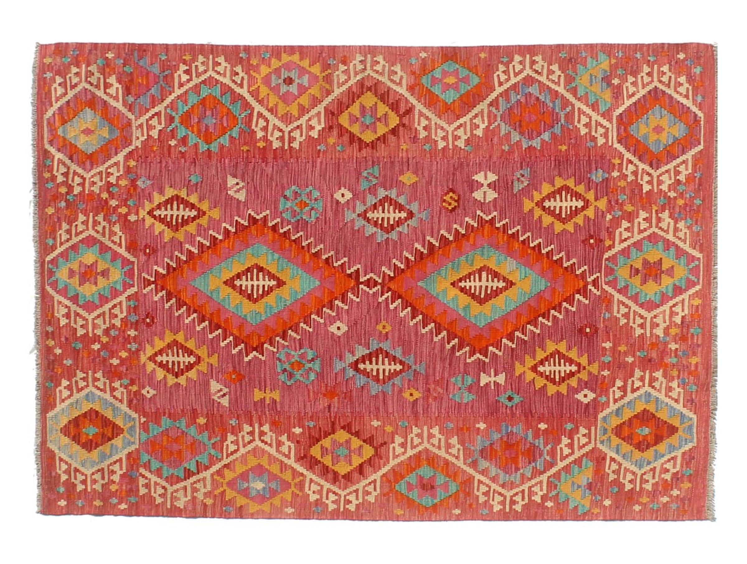 Questo kilim - afghano tessuto a mano è bello sia per i suoi colori e sia per il modello tipico. È stato tessuto a mano in Afghanistan con il 100% di lana. È anche robusto e durevole. Un vero e proprio profitto per voi e per la vostra casa.