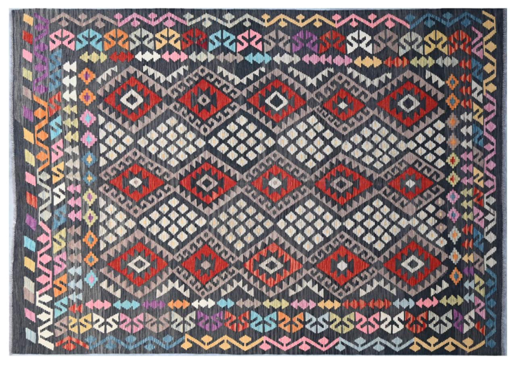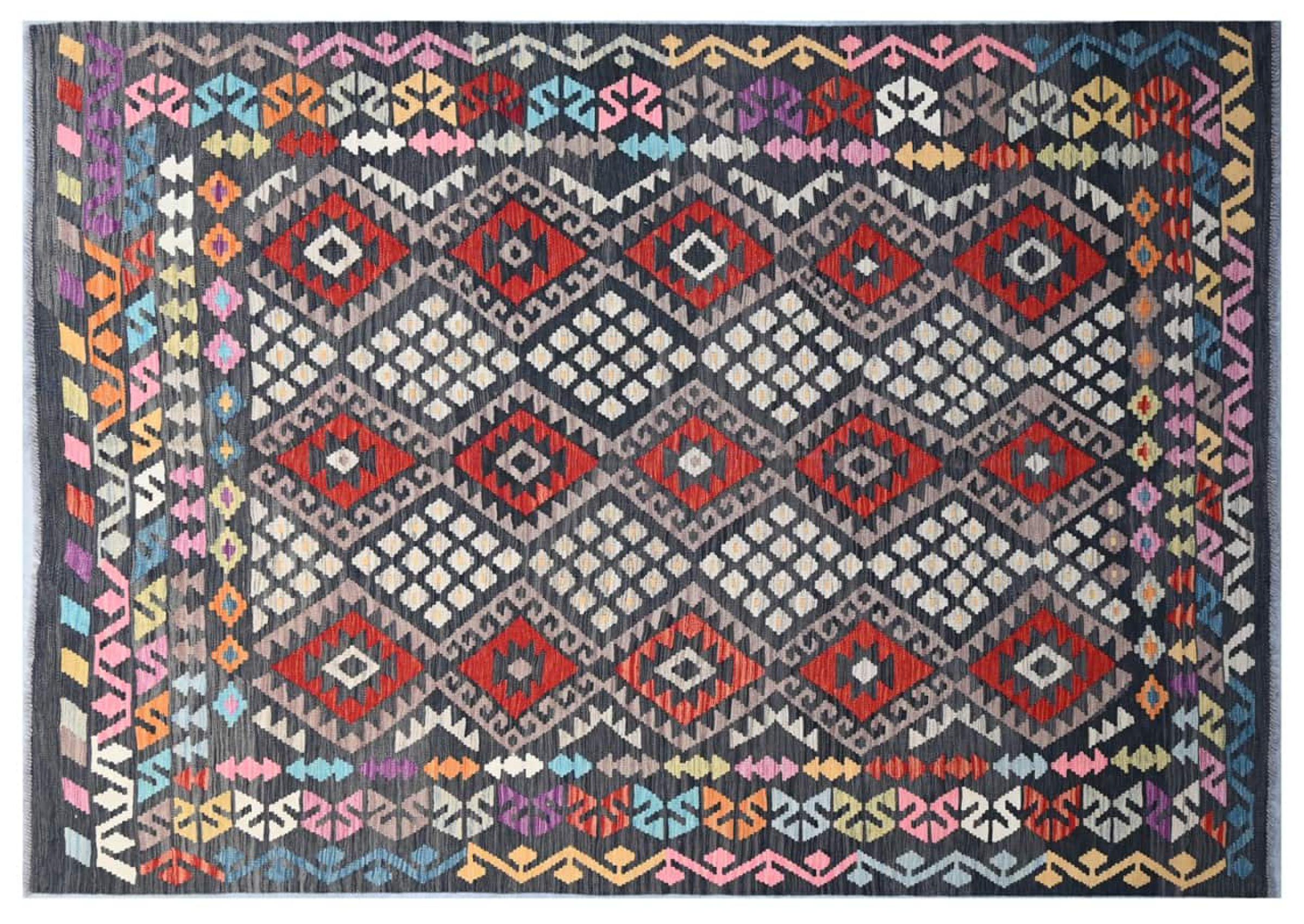 Questo kilim - afghano tessuto a mano è bello sia per i suoi colori e sia per il modello tipico. È stato tessuto a mano in Afghanistan con il 100% di lana. È anche robusto e durevole. Un vero e proprio profitto per voi e per la vostra casa.