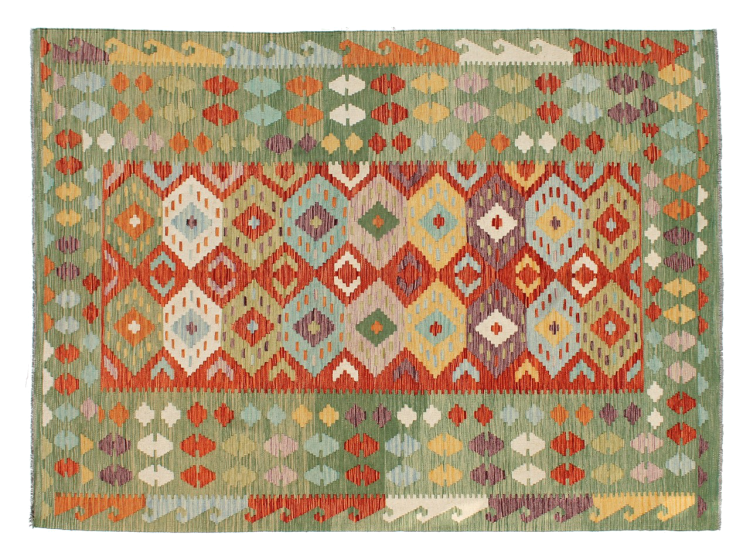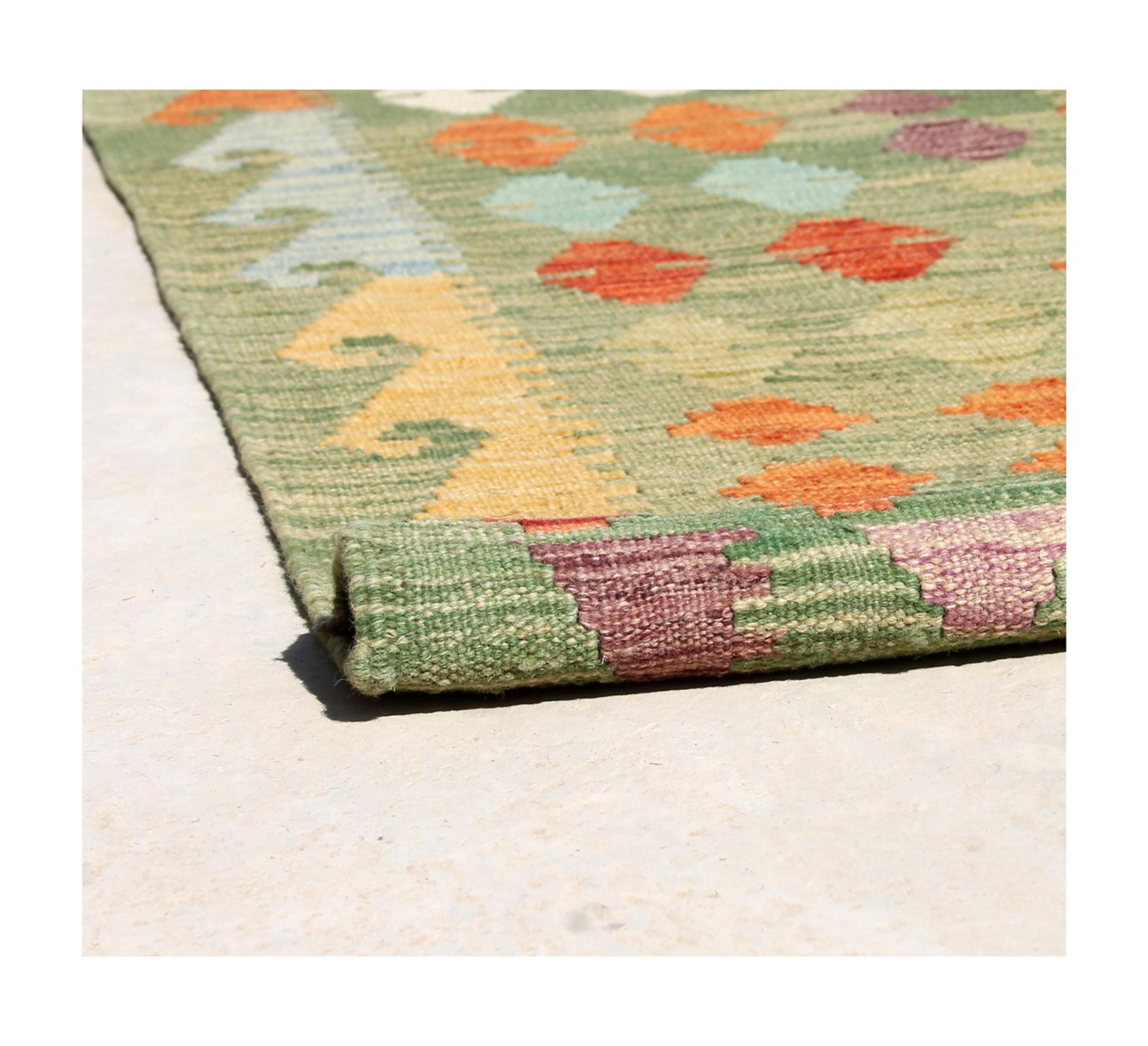 Questo kilim - afghano tessuto a mano è bello sia per i suoi colori e sia per il modello tipico. È stato tessuto a mano in Afghanistan con il 100% di lana. È anche robusto e durevole. Un vero e proprio profitto per voi e per la vostra casa.