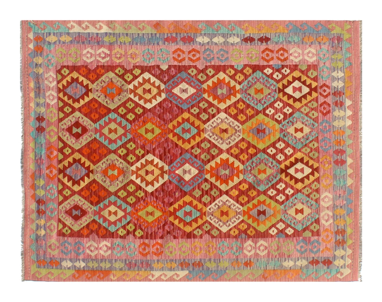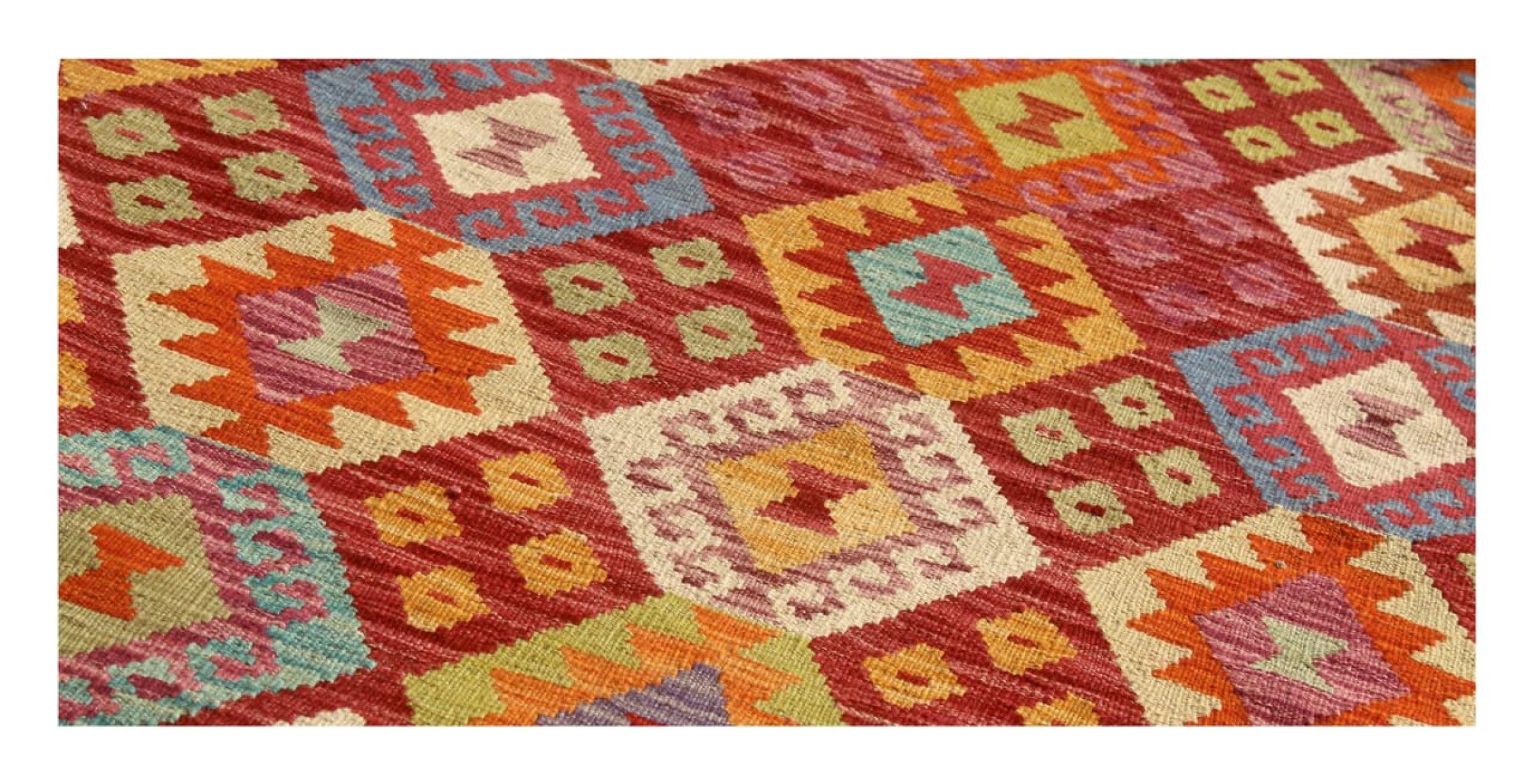 Questo kilim - afghano tessuto a mano è bello sia per i suoi colori e sia per il modello tipico. È stato tessuto a mano in Afghanistan con il 100% di lana. È anche robusto e durevole. Un vero e proprio profitto per voi e per la vostra casa.