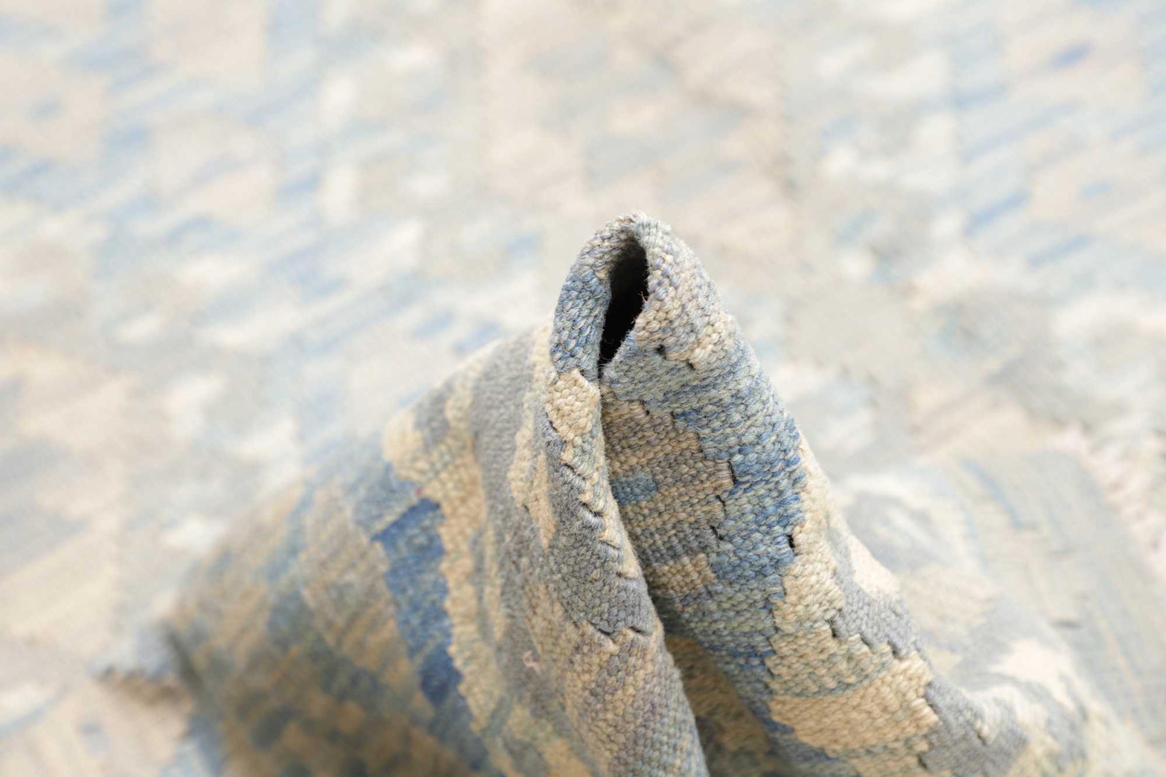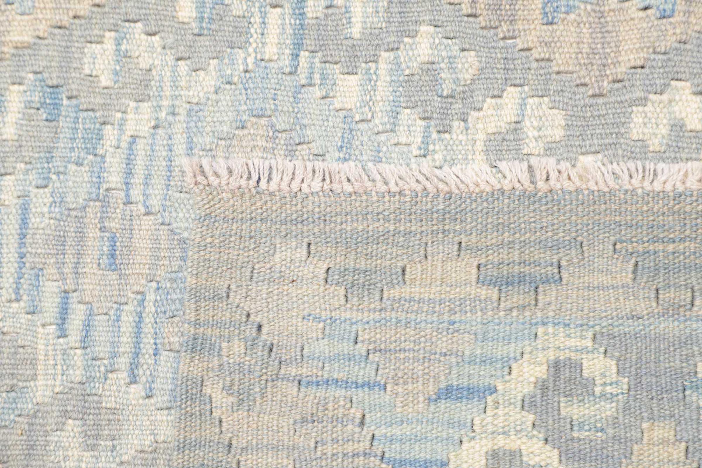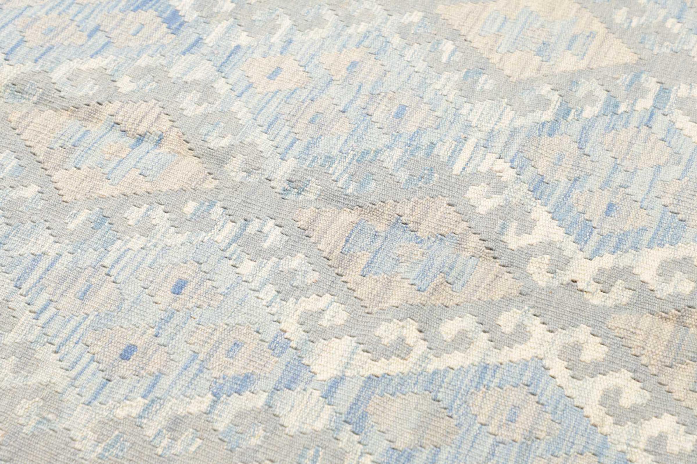Questo tappeto è stato realizzato a mano su un telaio come una trama piatta. Flatweave è il termine usato per descrivere i tappeti che non hanno pelo. Come promette il nome, questi tappeti sono tessuti e non annodati. Il risultato è un tappeto piatto con una superficie strutturata. Le trame piatte non sono così morbide e di solito più sottili dei tappeti annodati. Allo stesso tempo sono molto meno complessi da produrre e di solito possono essere disposti da entrambi i lati (davanti e dietro). I loro motivi sono di solito geometrici, che è determinato dal tessuto.