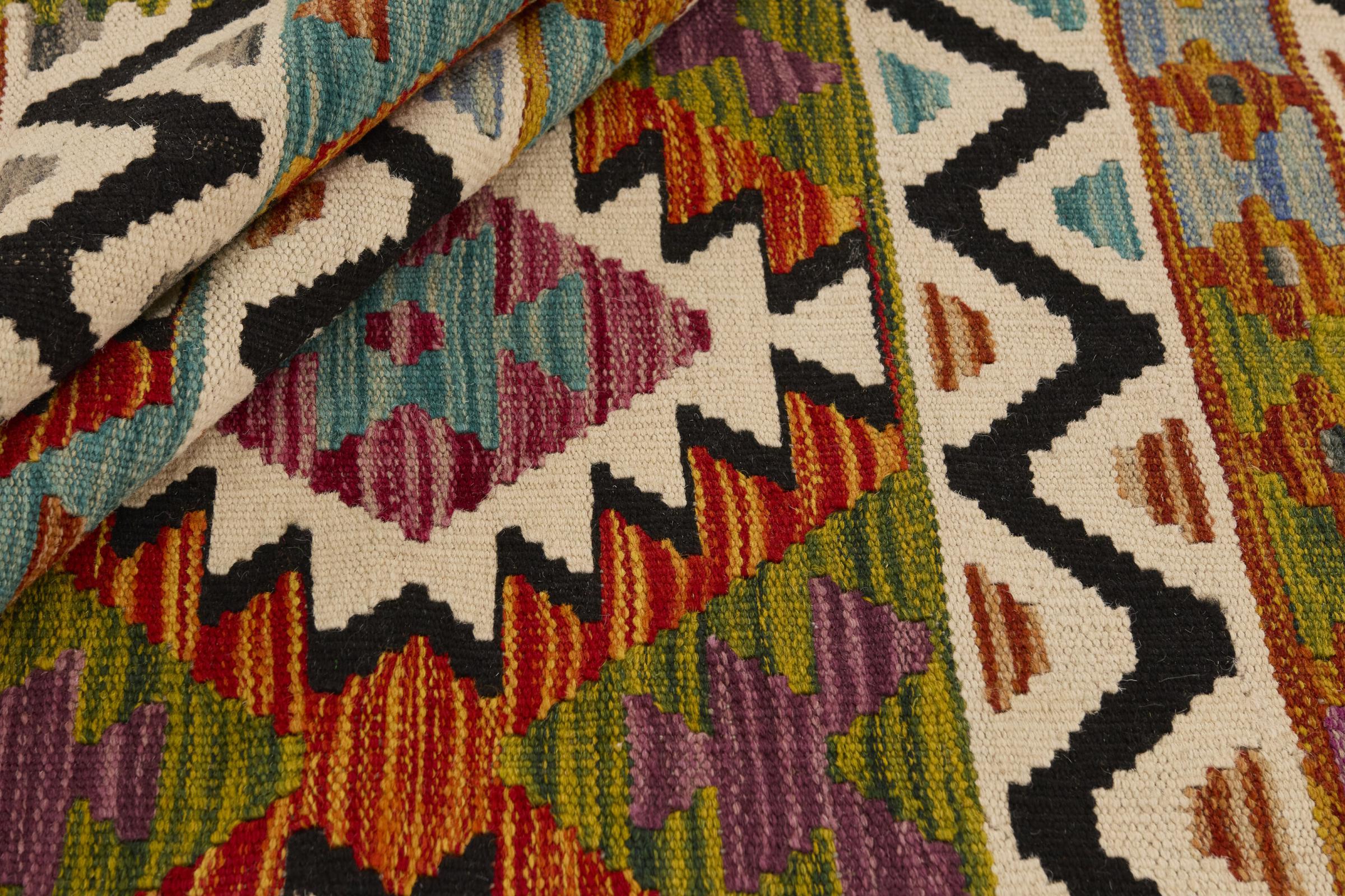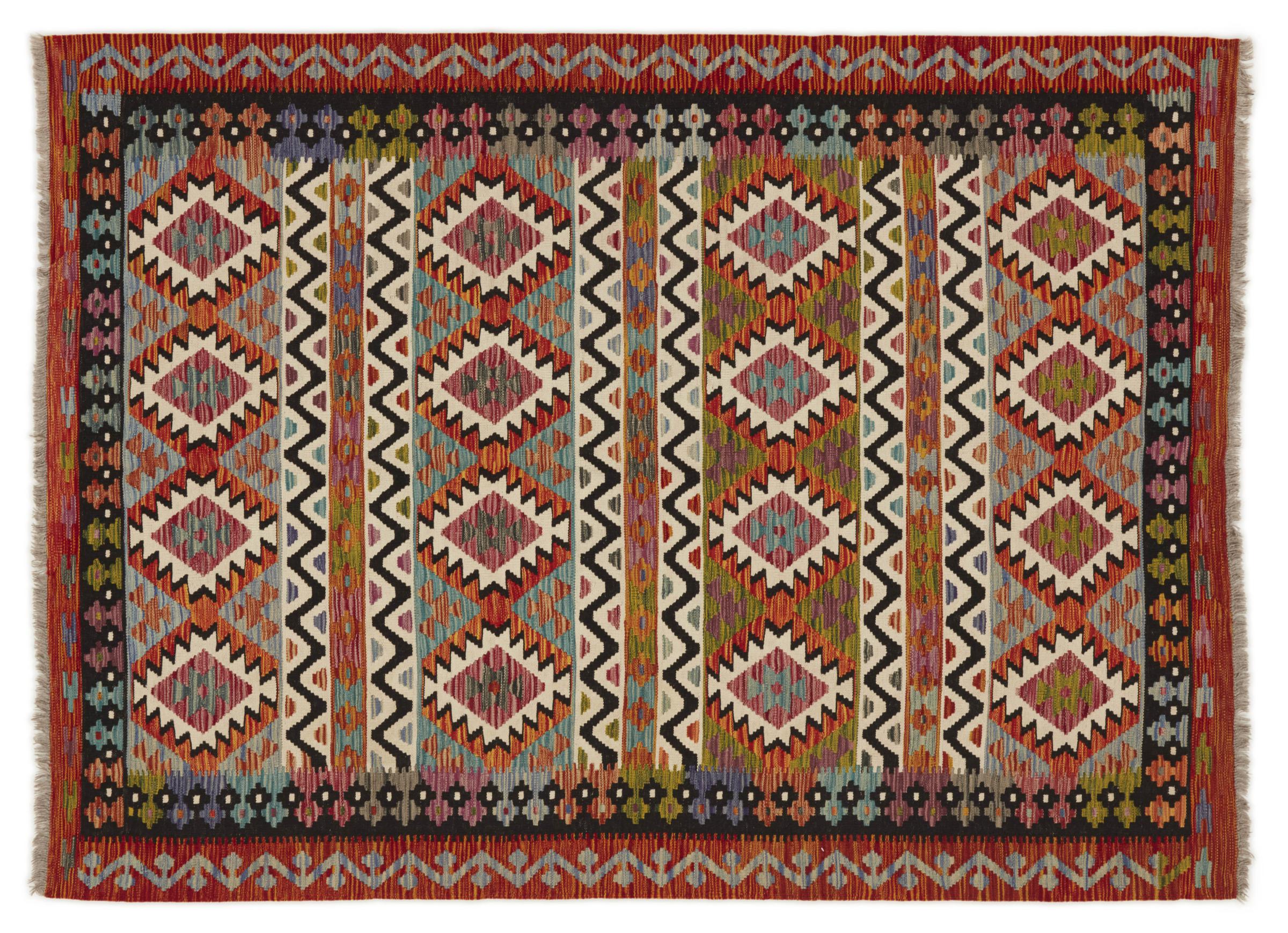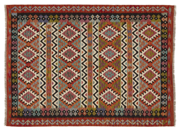 Questo kilim - afghano tessuto a mano è bello sia per i suoi colori e sia per il modello tipico. È stato tessuto a mano in Afghanistan con il 100% di lana. È anche robusto e durevole. Un vero e proprio profitto per voi e per la vostra casa.