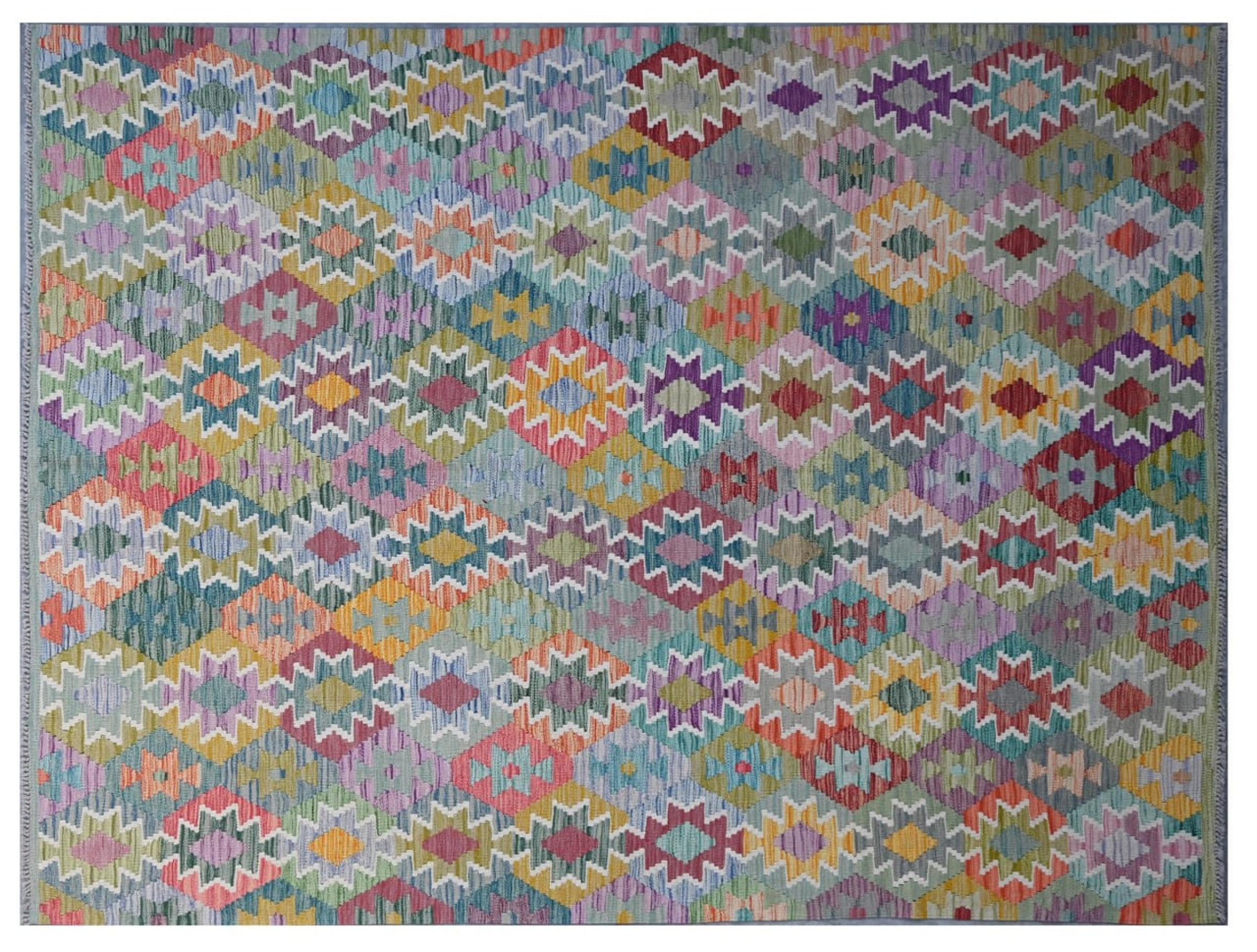 Questo kilim - afghano tessuto a mano è bello sia per i suoi colori e sia per il modello tipico. È stato tessuto a mano in Afghanistan con il 100% di lana. È anche robusto e durevole. Un vero e proprio profitto per voi e per la vostra casa.