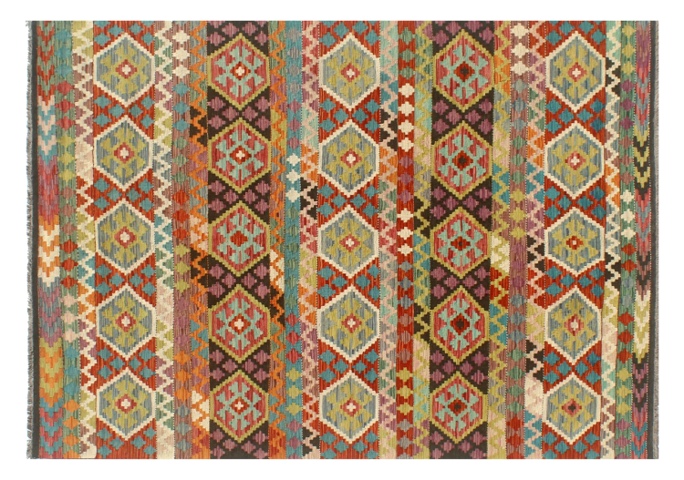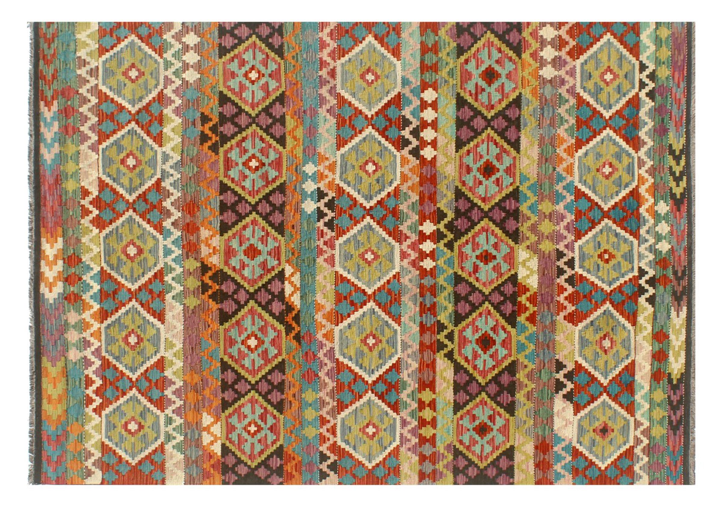 Questo kilim - afghano tessuto a mano è bello sia per i suoi colori e sia per il modello tipico. È stato tessuto a mano in Afghanistan con il 100% di lana. È anche robusto e durevole. Un vero e proprio profitto per voi e per la vostra casa.