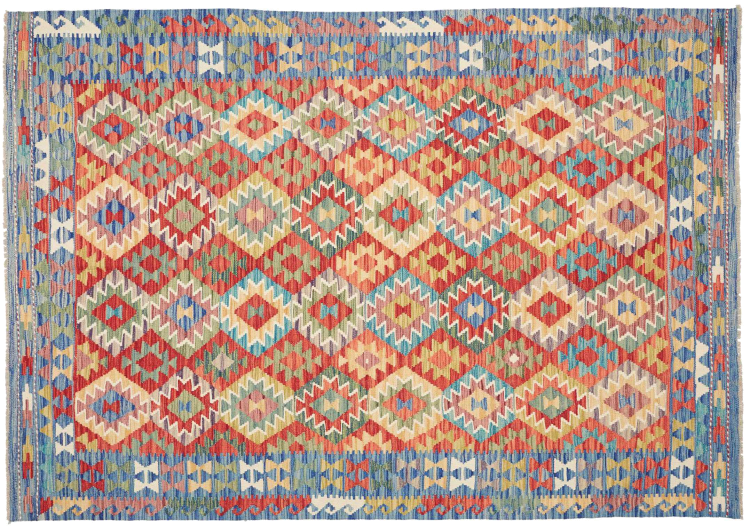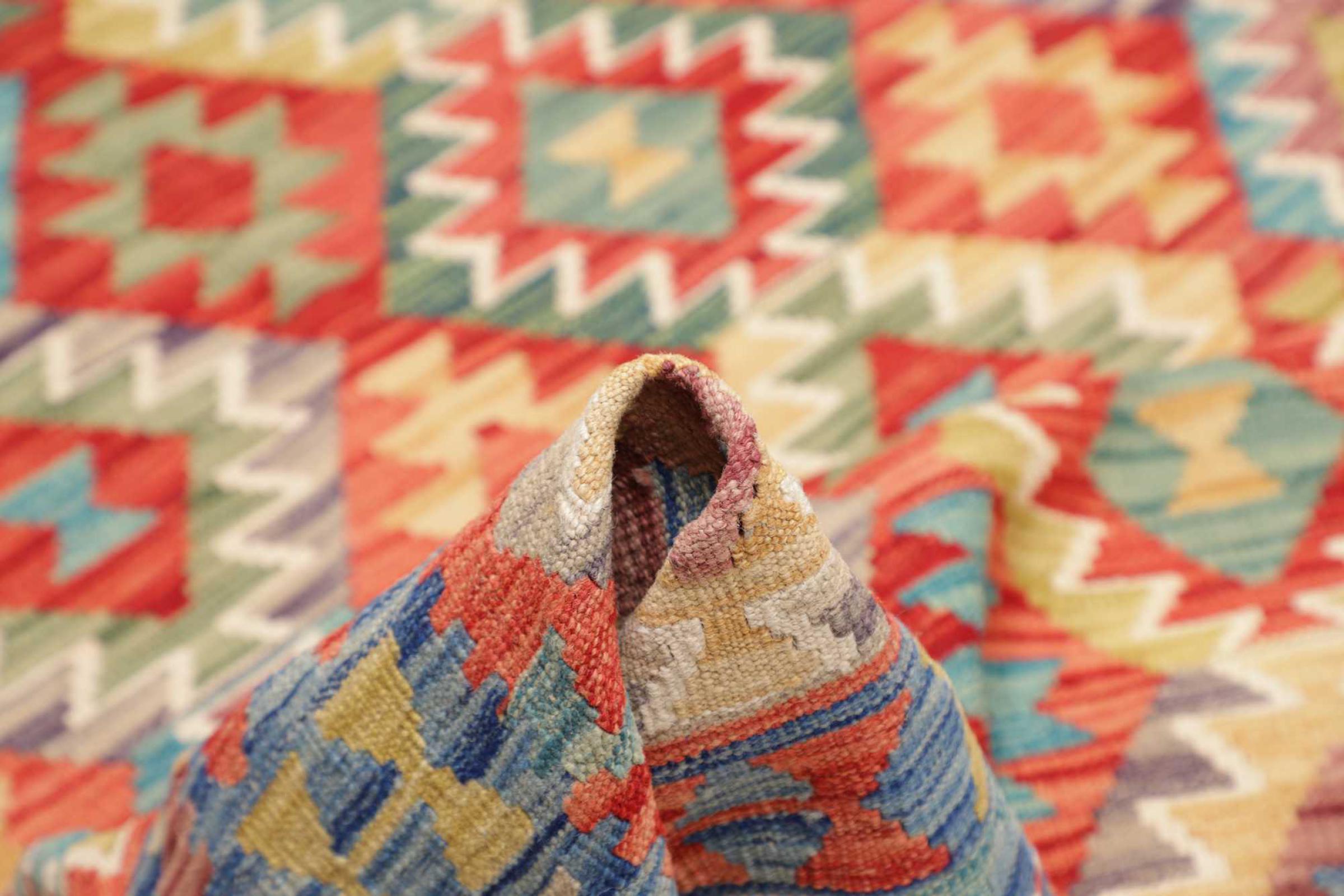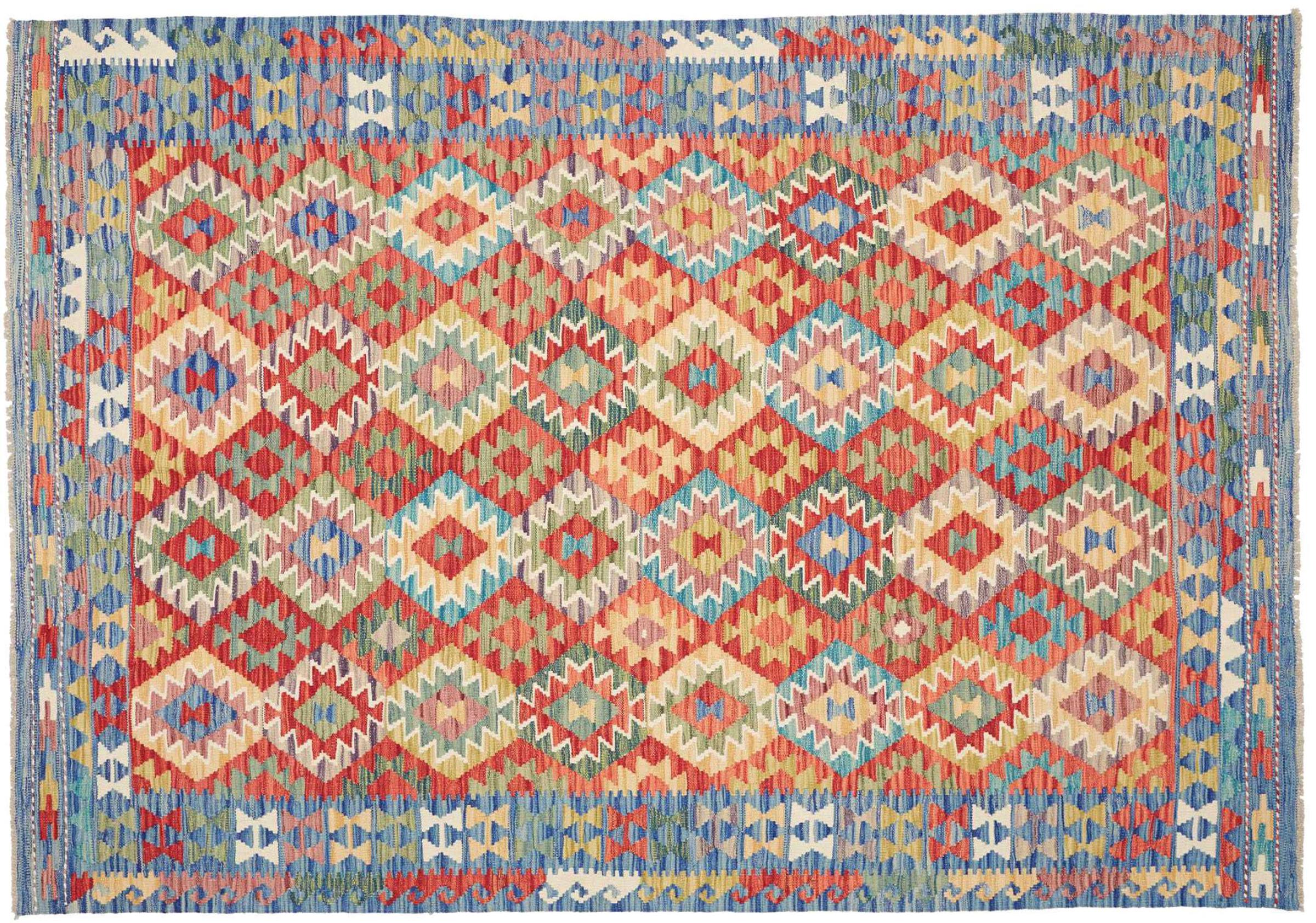 Questo kilim - afghano tessuto a mano è bello sia per i suoi colori e sia per il modello tipico. È stato tessuto a mano in Afghanistan con il 100% di lana. È anche robusto e durevole. Un vero e proprio profitto per voi e per la vostra casa.