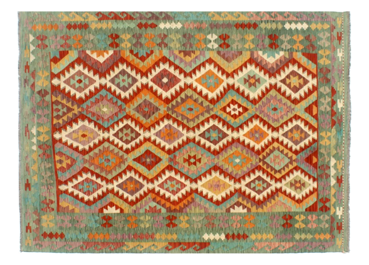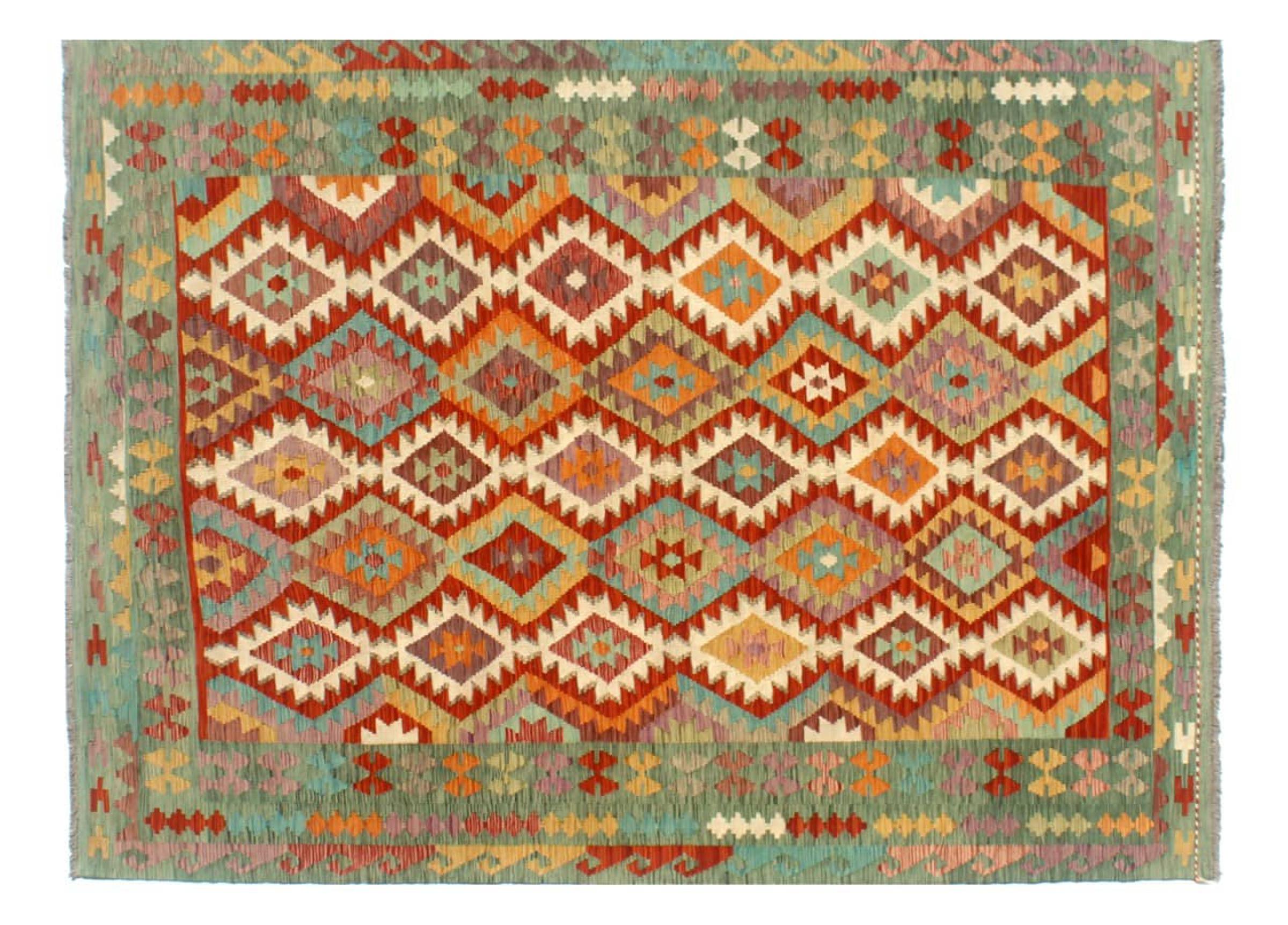 Questo kilim - afghano tessuto a mano è bello sia per i suoi colori e sia per il modello tipico. È stato tessuto a mano in Afghanistan con il 100% di lana. È anche robusto e durevole. Un vero e proprio profitto per voi e per la vostra casa.