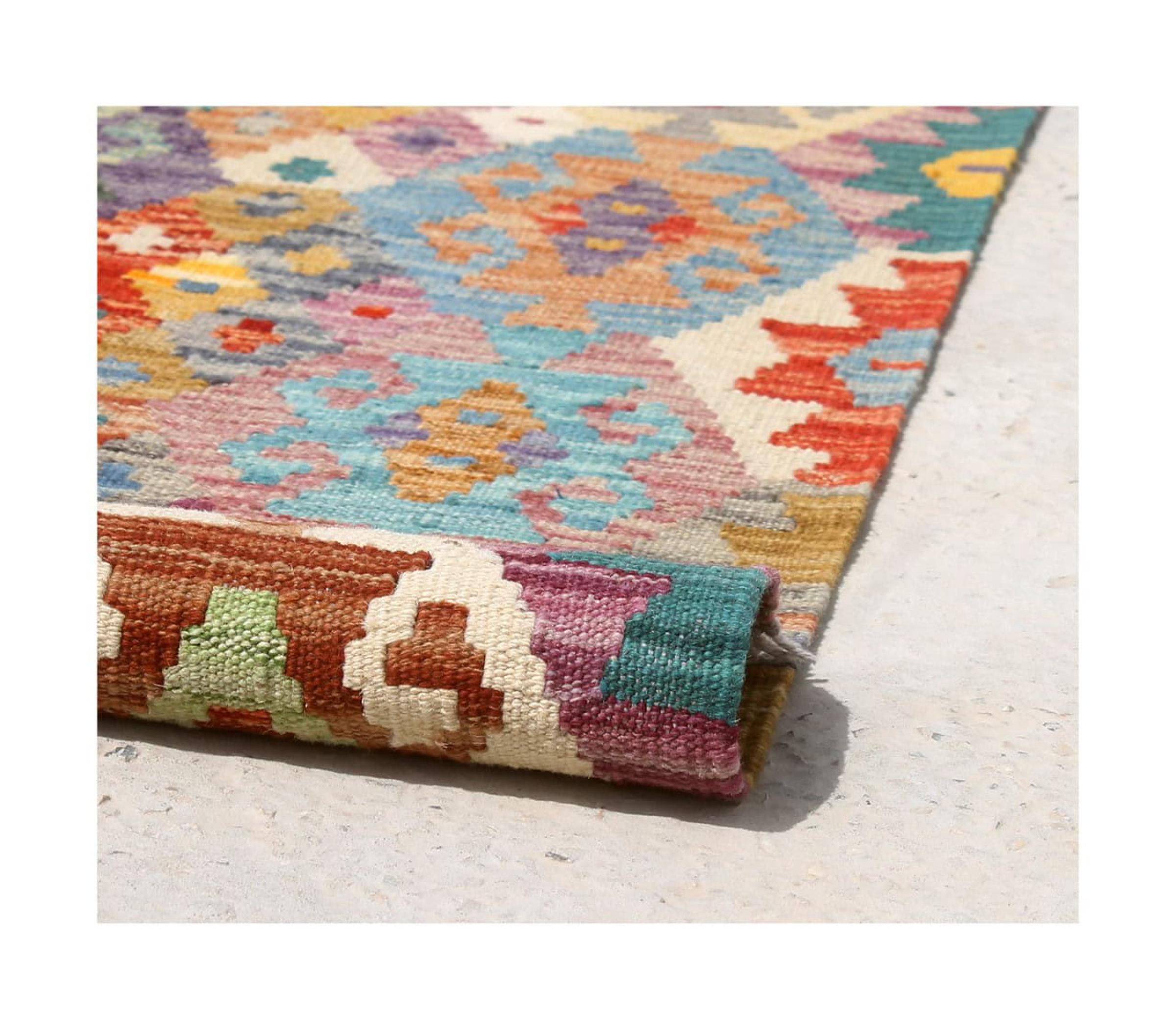 Questo kilim - afghano tessuto a mano è bello sia per i suoi colori e sia per il modello tipico. È stato tessuto a mano in Afghanistan con il 100% di lana. È anche robusto e durevole. Un vero e proprio profitto per voi e per la vostra casa.